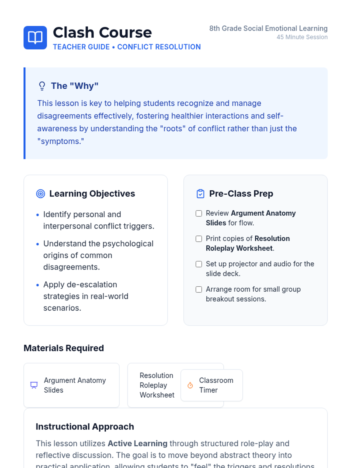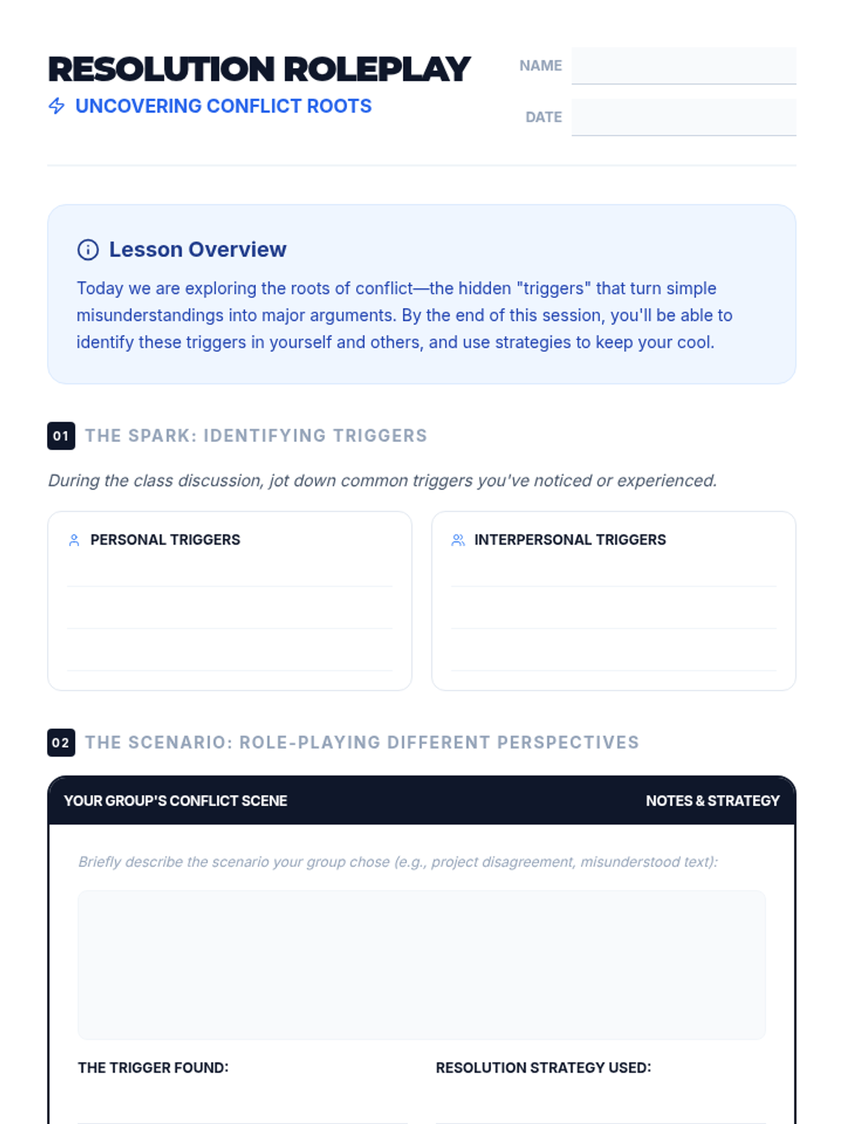 Explore the roots of conflict and why disagreements arise. This lesson is crucial for developing an understanding of personal and interpersonal triggers and how to manage them effectively. Designed for an 8th grade class, this Tier 1 lesson spans a 45-minute session.