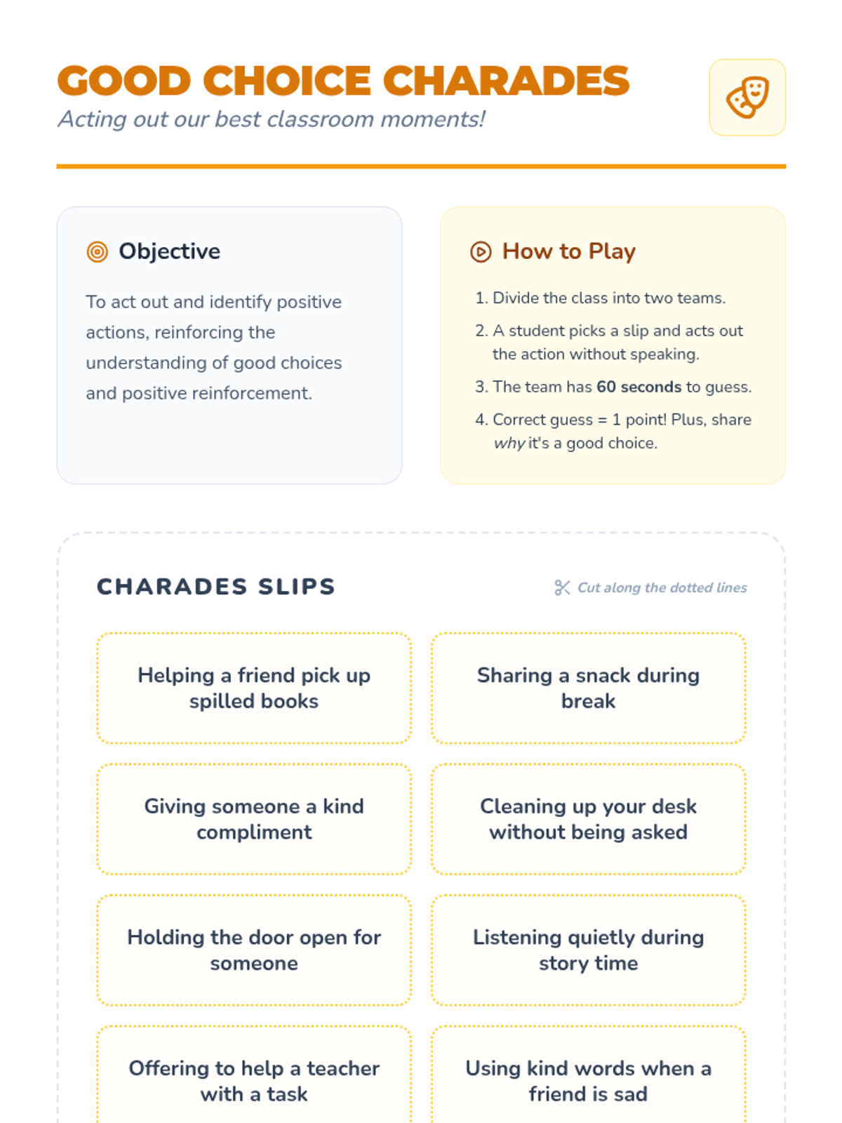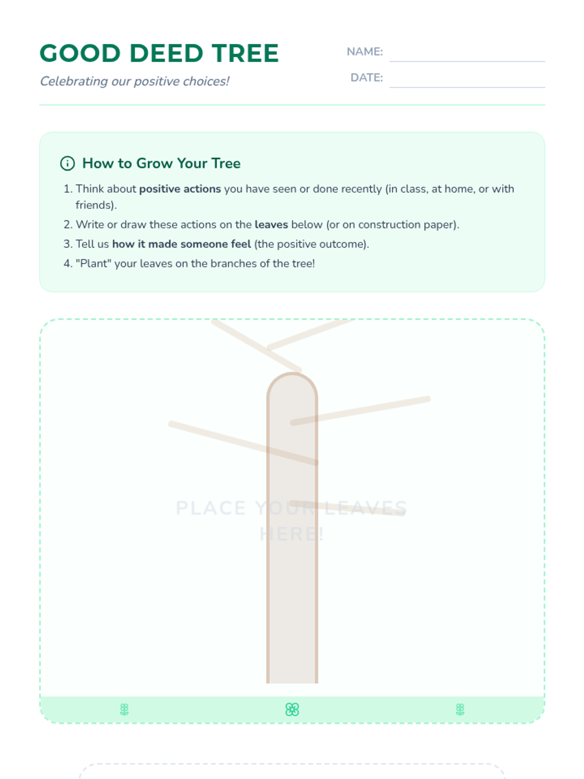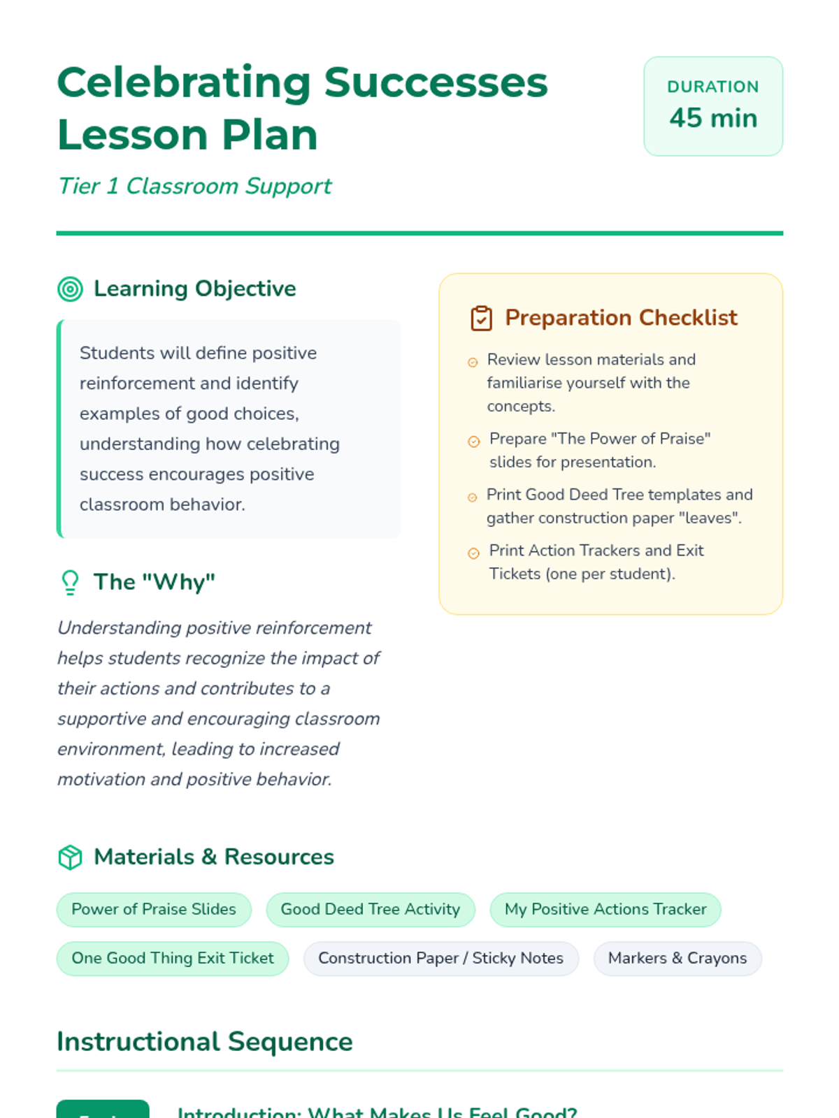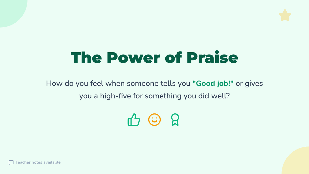 A 3rd-grade lesson introducing students to positive reinforcement and the importance of acknowledging good behavior to build a supportive classroom culture. Students explore why we celebrate successes through a slide presentation, a creative 'Good Deed Tree' activity, a behavior tracker, and a charades game.