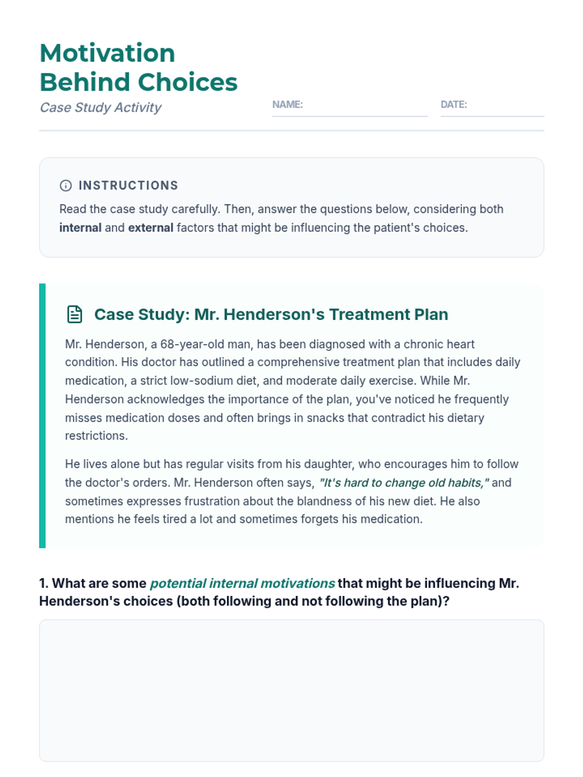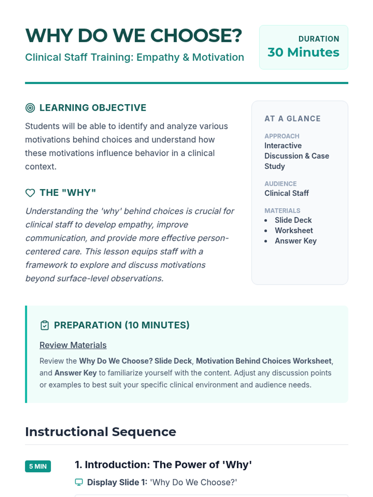 This 30-minute classroom session helps clinical staff understand the internal and external motivations behind patient choices to foster empathy and improve person-centered care.