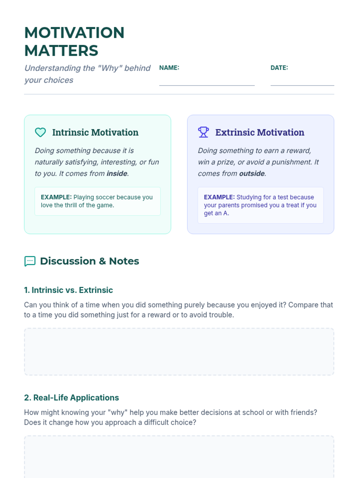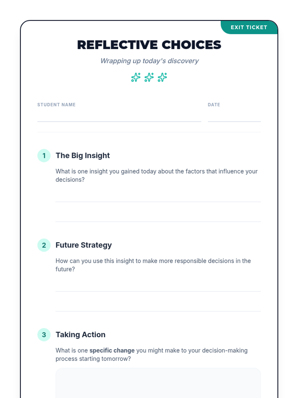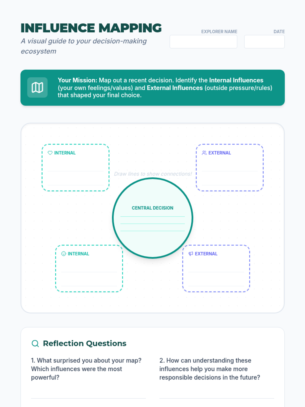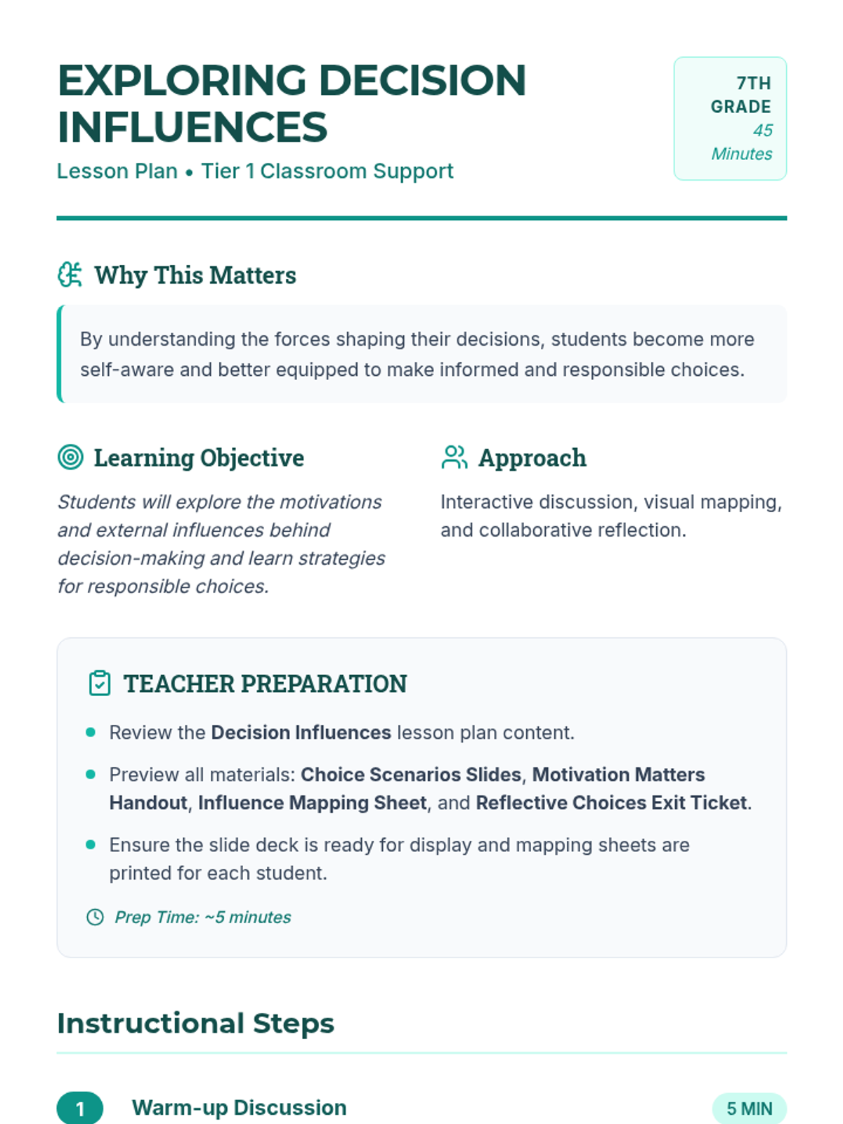 This 45-minute lesson for 7th graders explores the internal and external factors that influence decision-making, helping students develop self-awareness and responsible choices.