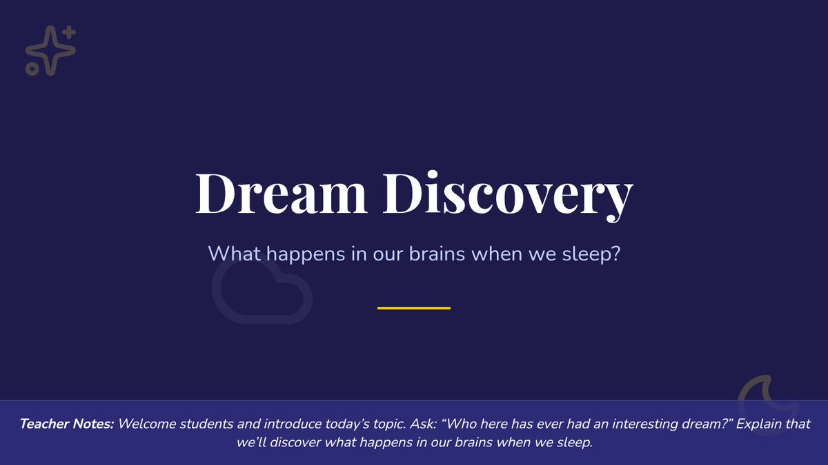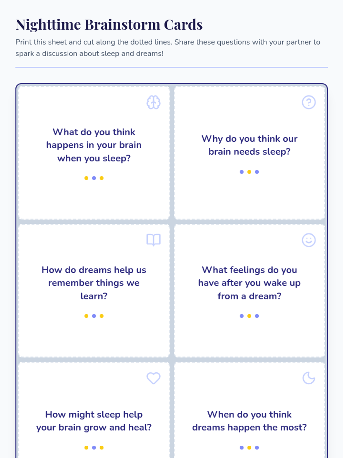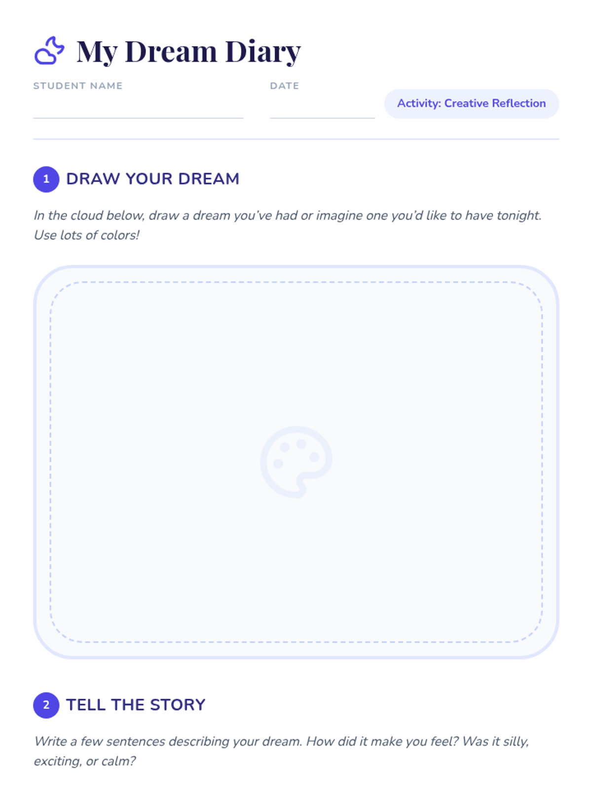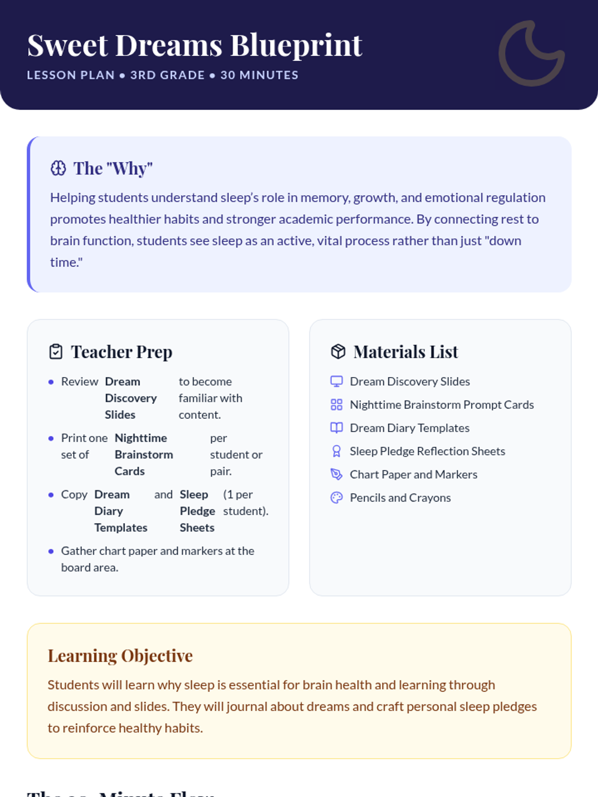 A 30-minute Tier 1 activity for 3rd graders exploring the science of sleep and dreams through creative expression and goal-setting. Students will learn how the brain repairs itself and processes memories during rest.