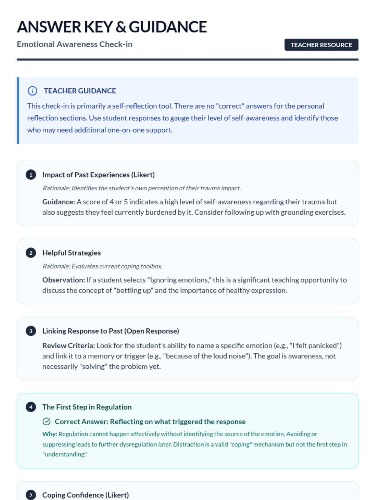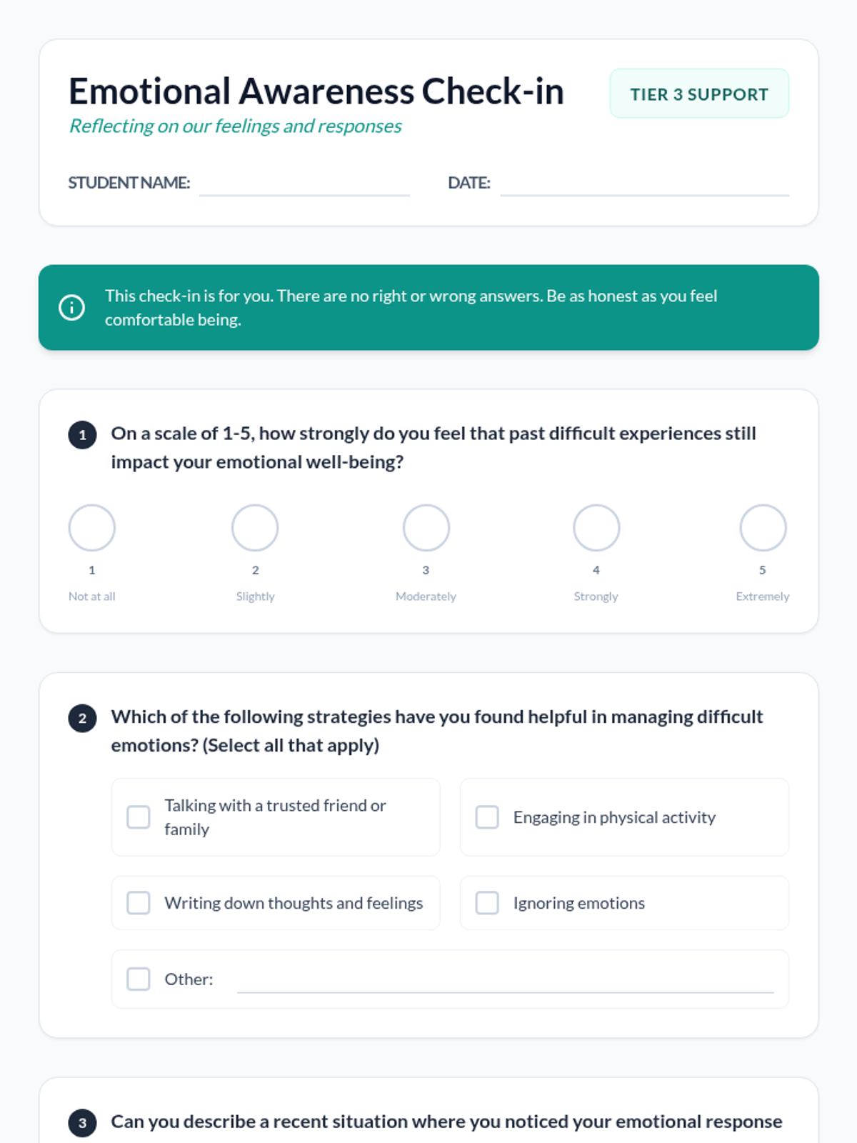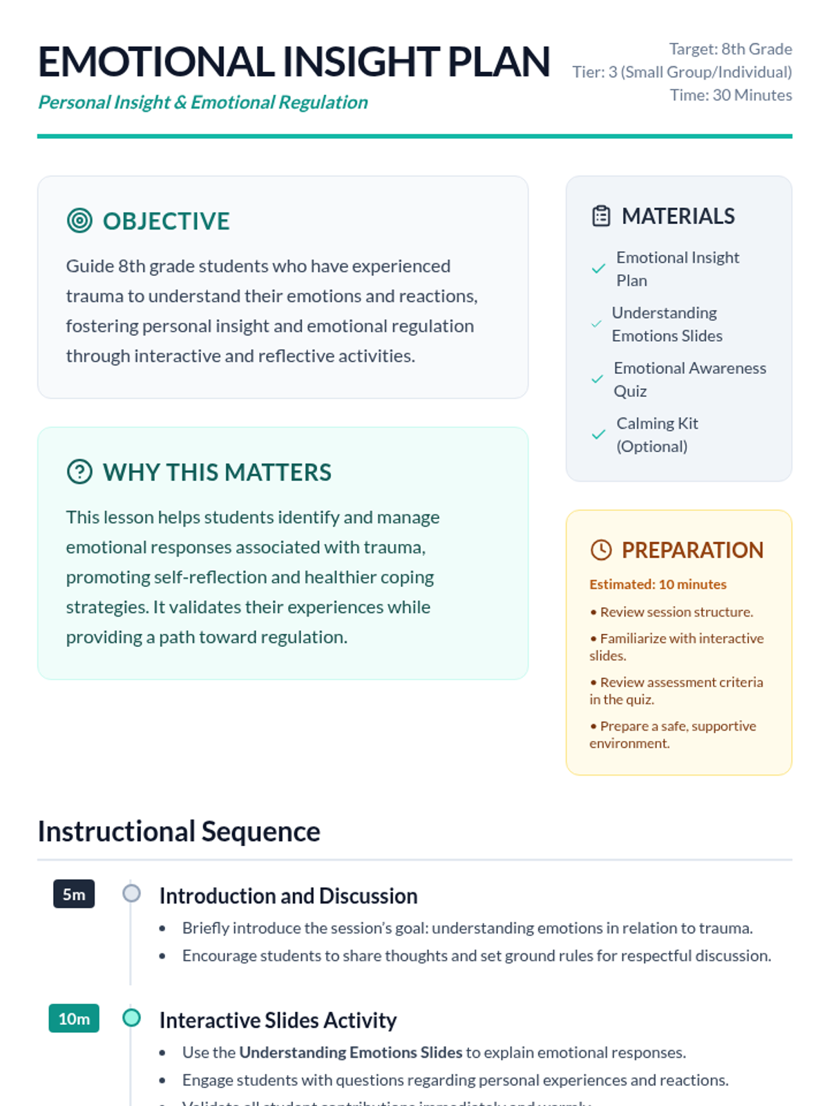 A specialized Tier 3 session for 8th-grade students to explore the connection between trauma and emotional responses, providing them with insight and regulation tools.
