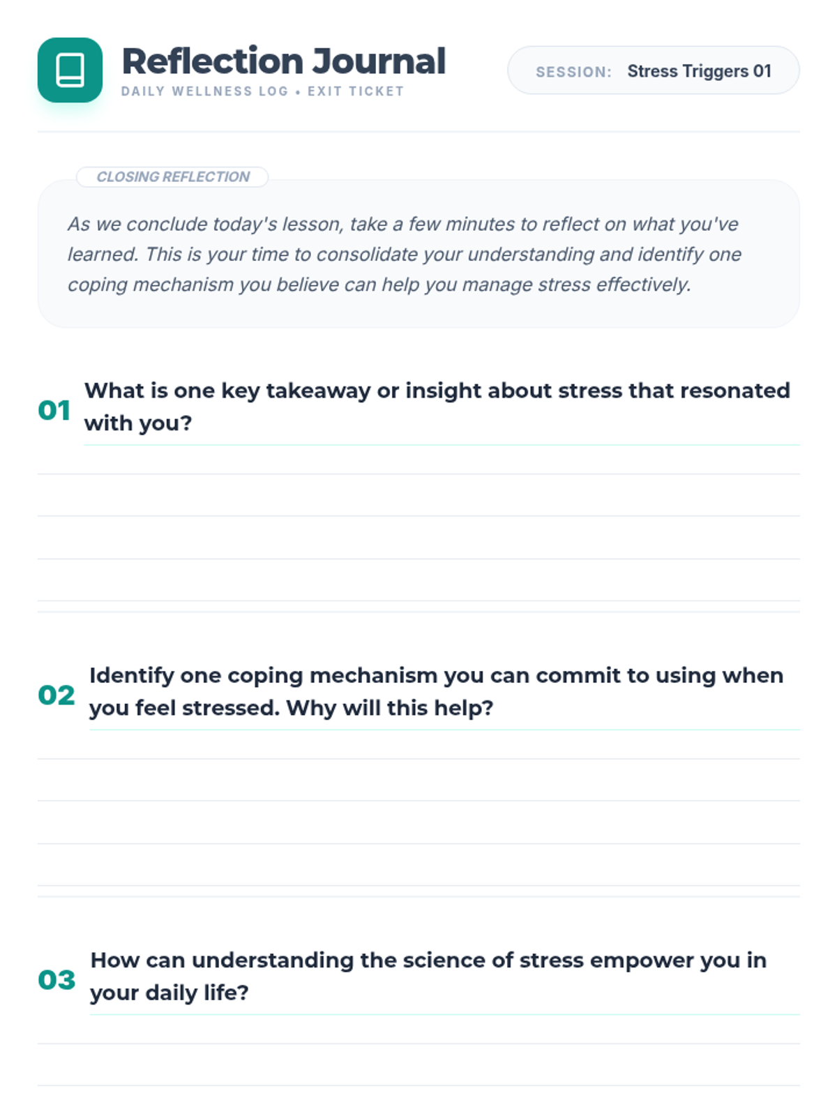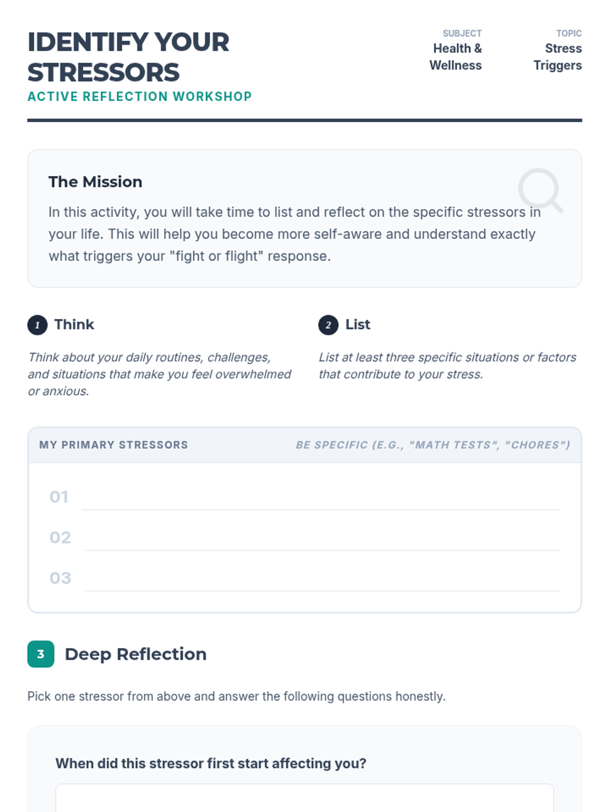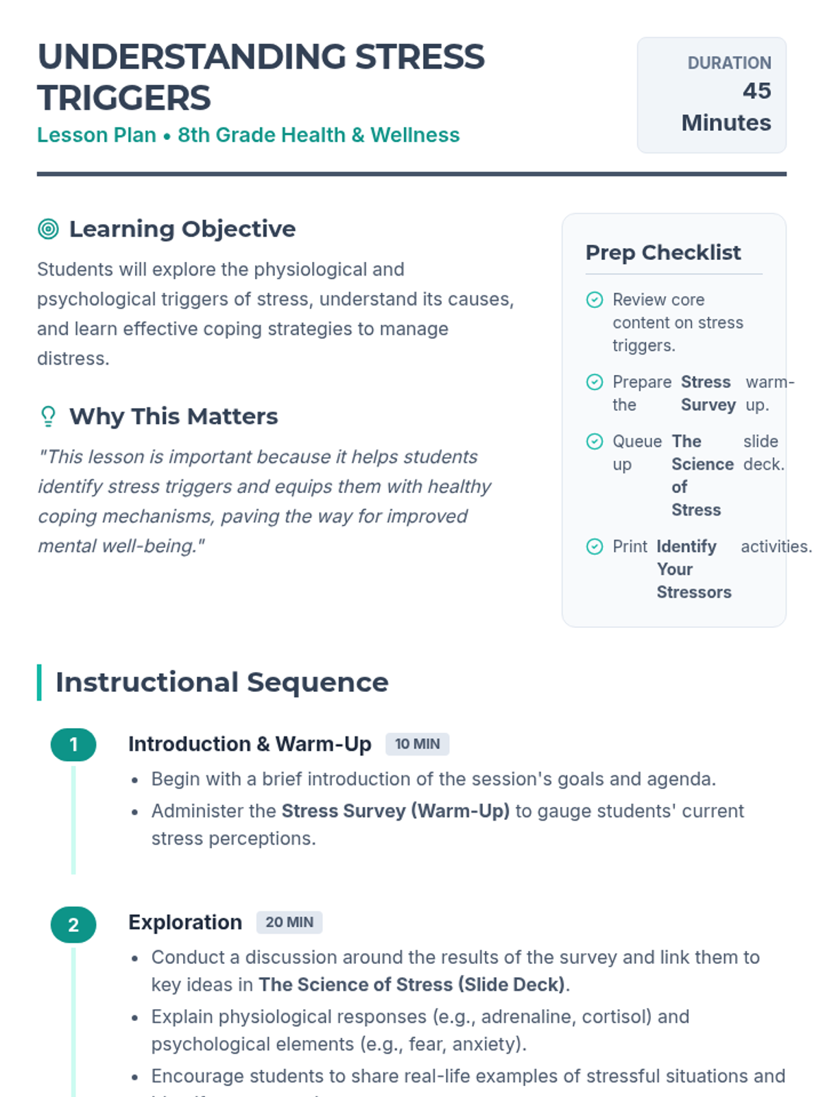 This lesson explores the physiological and psychological reasons behind stress, helping students understand the root causes of their distress. Designed for an 8th-grade class, this 45-minute session provides valuable insights into stress management and awareness.