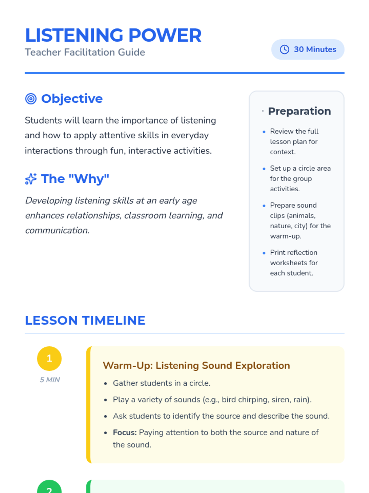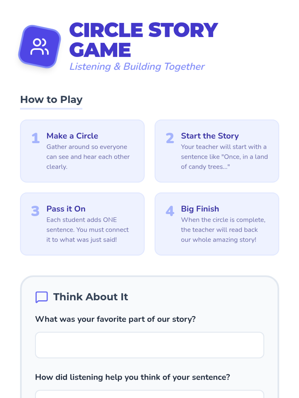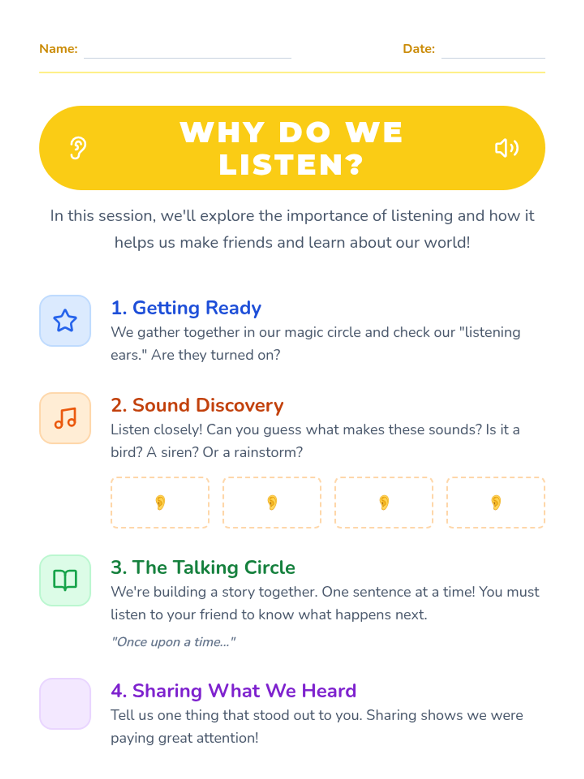 Students explore the importance of listening through interactive sound games and collaborative storytelling. This session builds foundational communication skills and empathy in young learners.