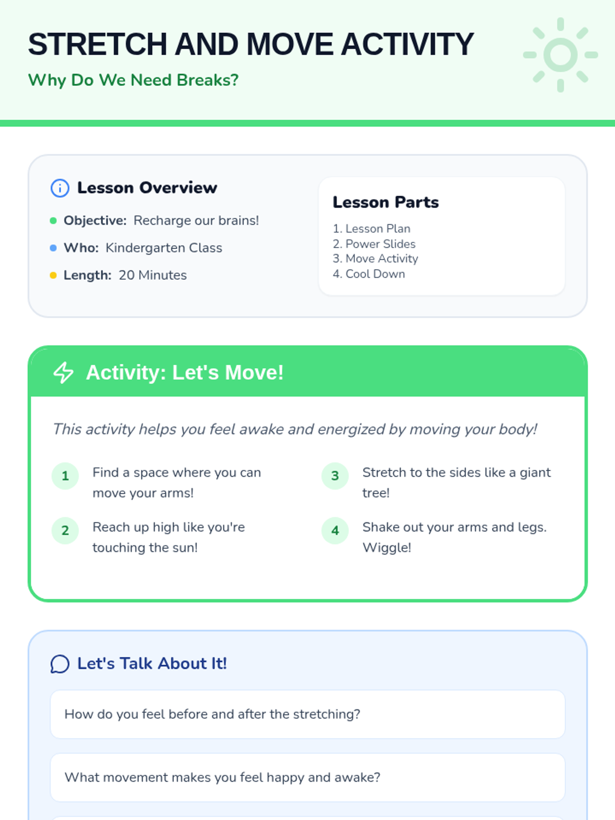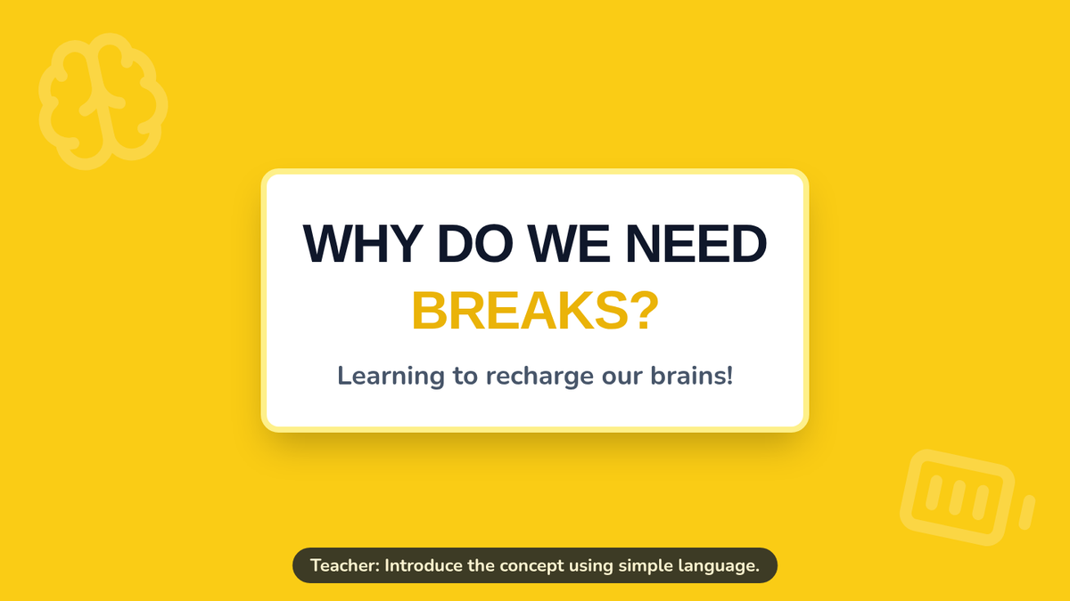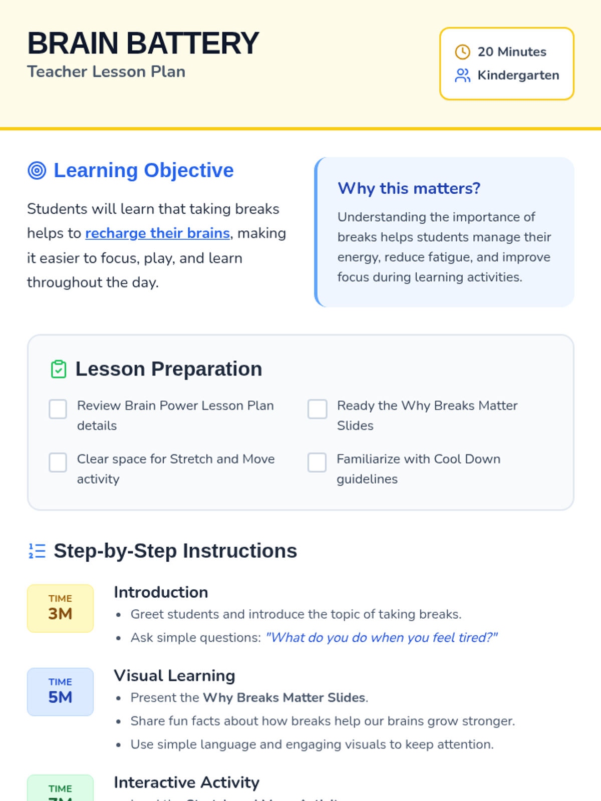 A 20-minute kindergarten lesson exploring the importance of taking breaks to recharge the brain and improve focus through interactive movement and reflection.