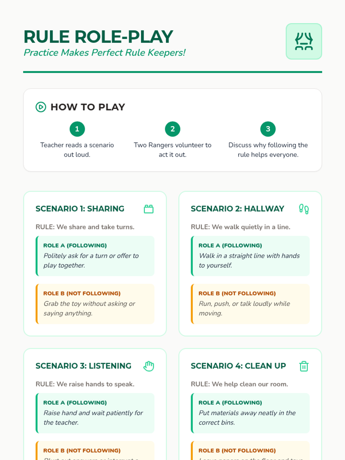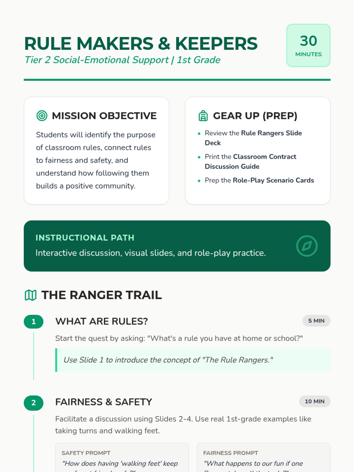 A 30-minute Tier 2 lesson for 1st grade students to explore the importance of classroom rules, focusing on safety, fairness, and community. Students learn through discussion, visual slides, and interactive role-play scenarios.