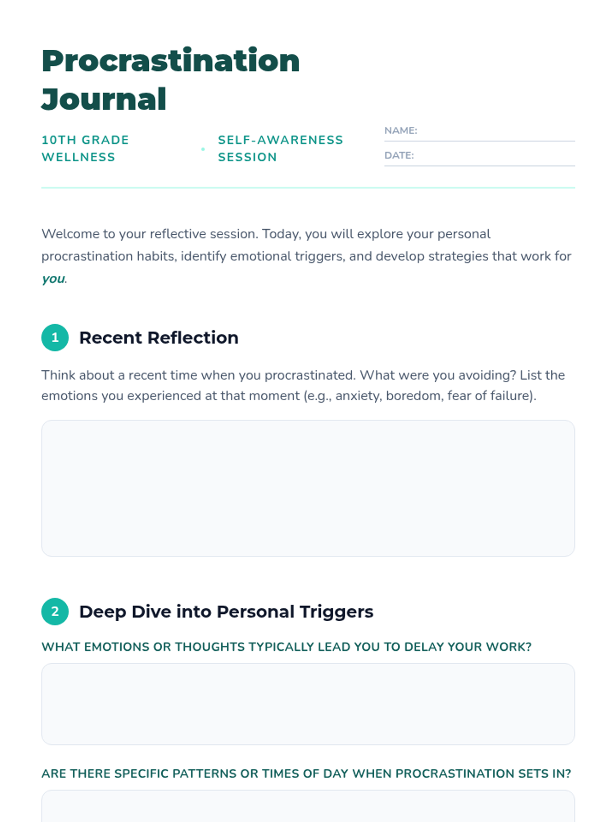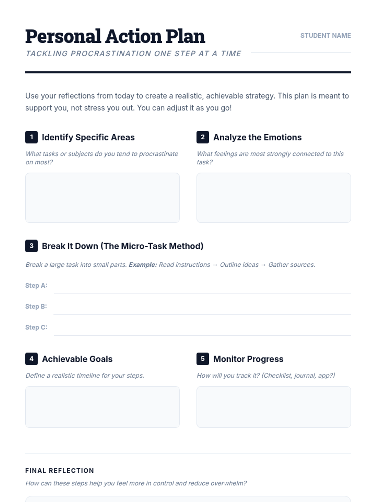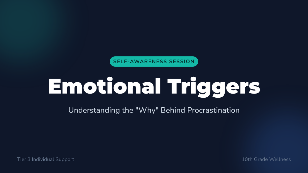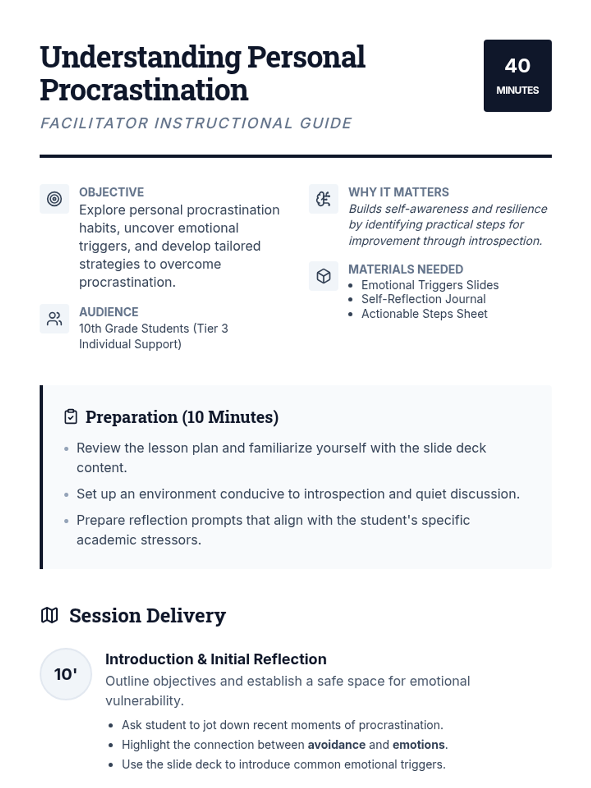 A reflective 40-minute Tier 3 individual session for 10th-grade students to investigate the emotional roots of procrastination and develop personalized coping strategies.