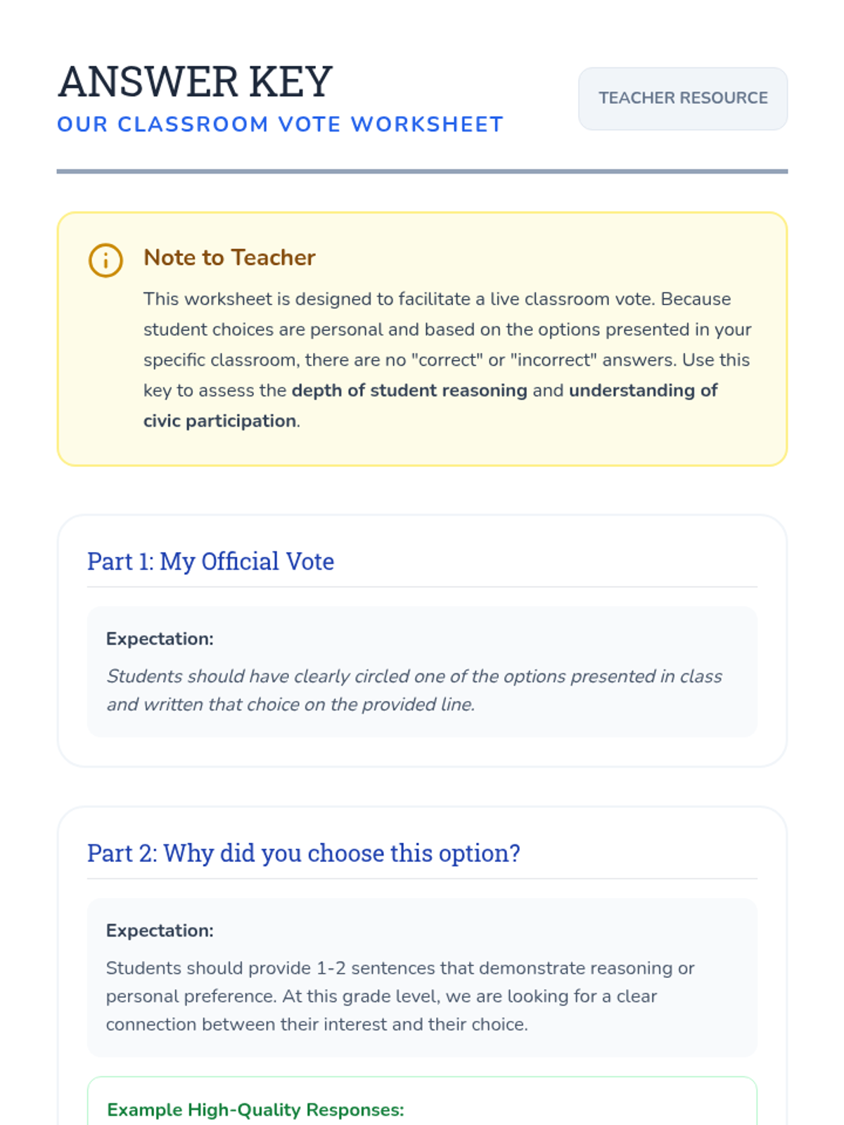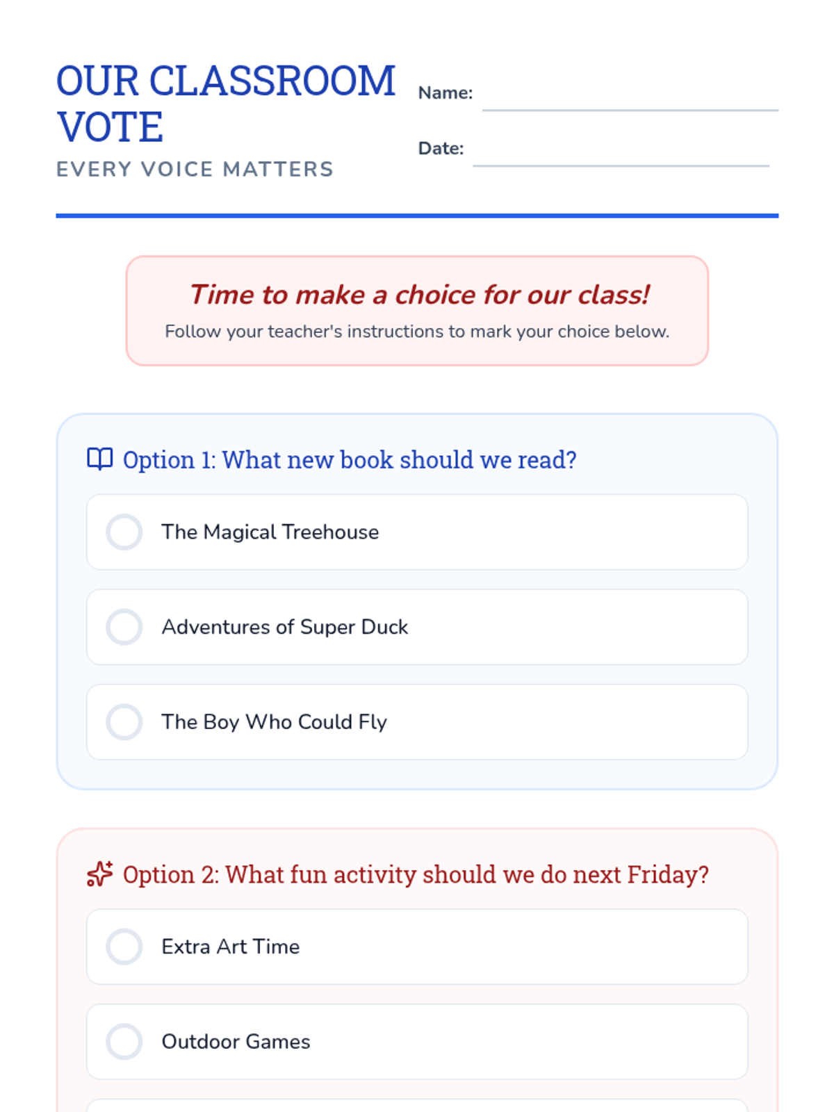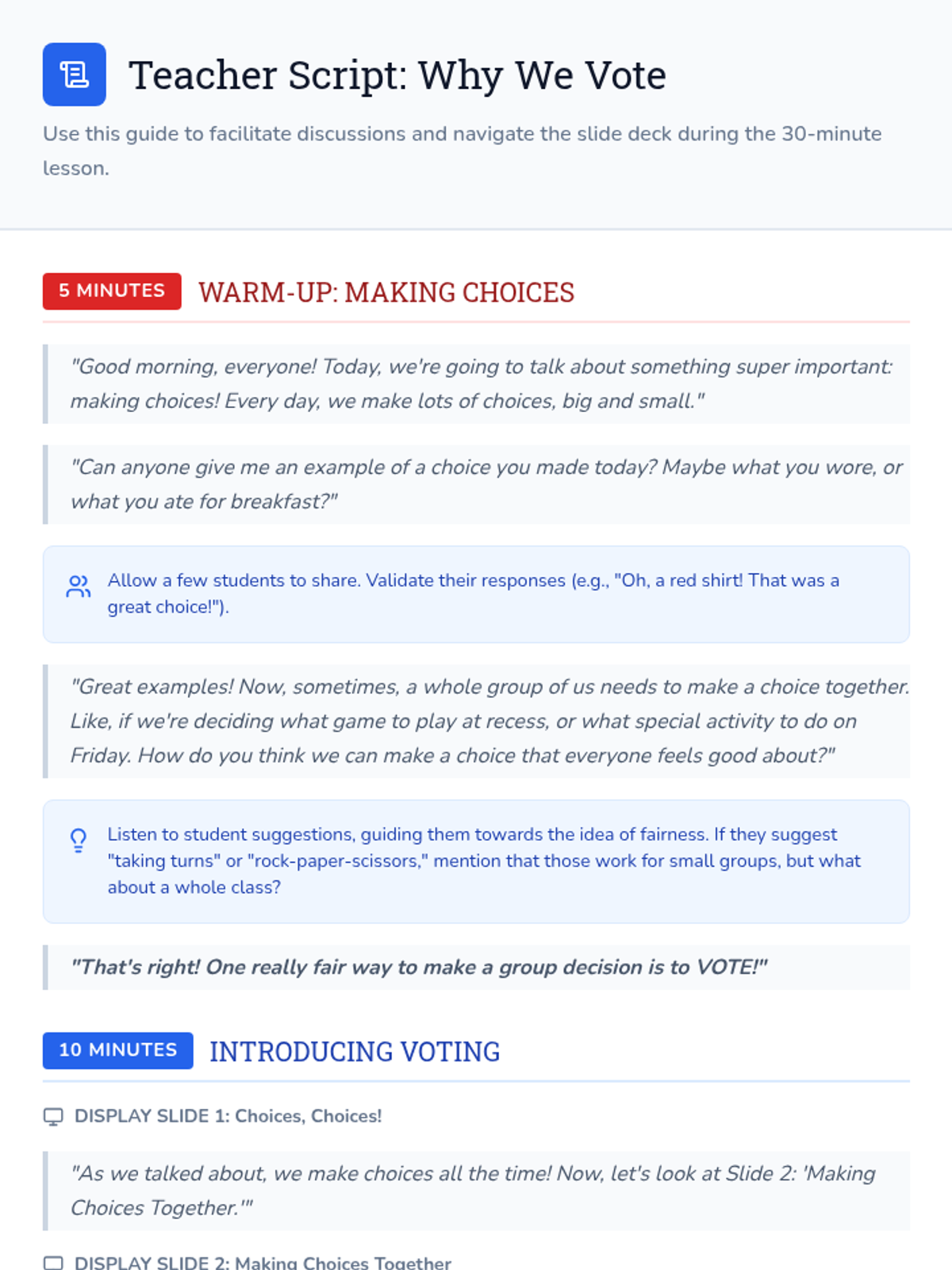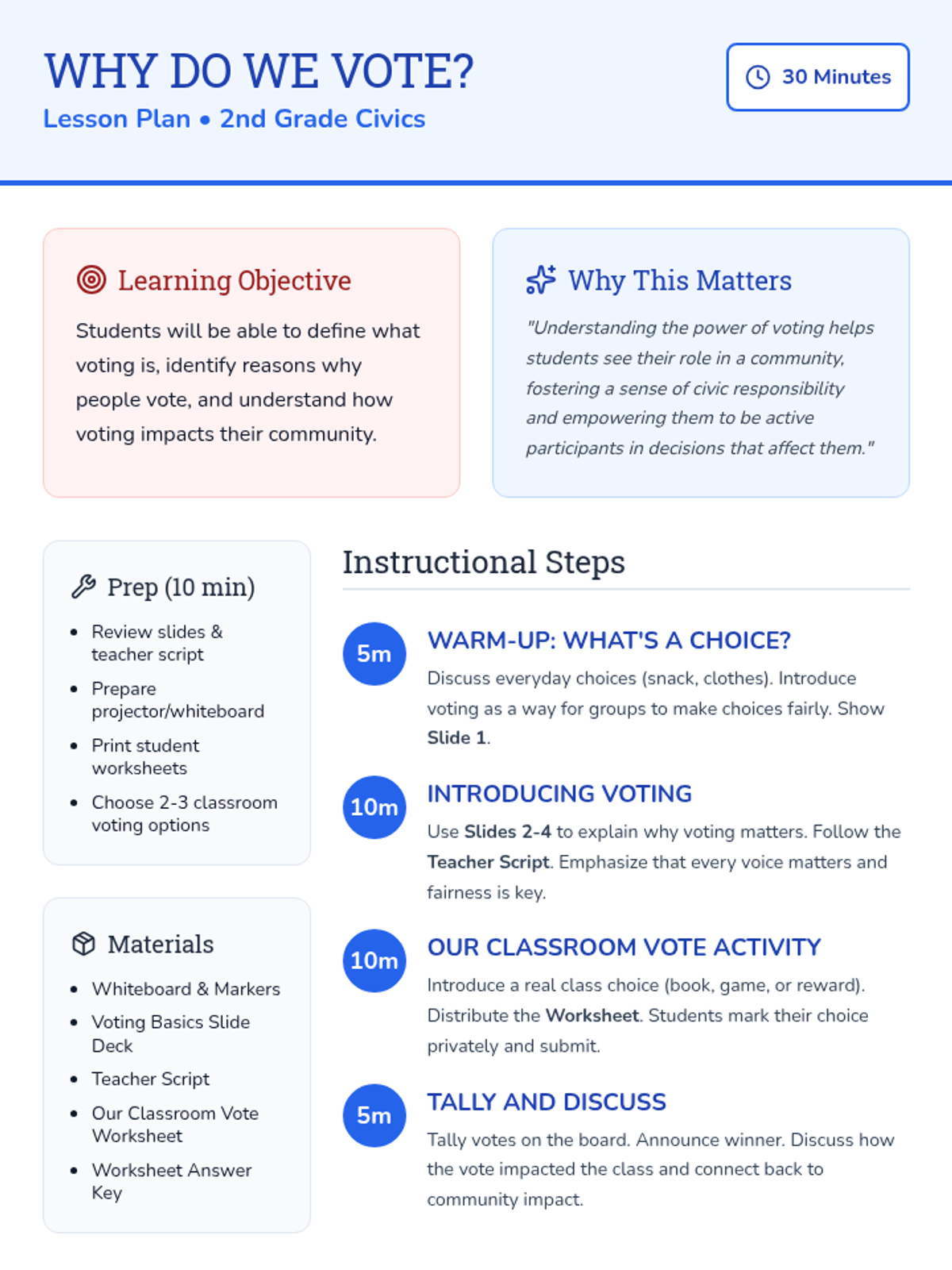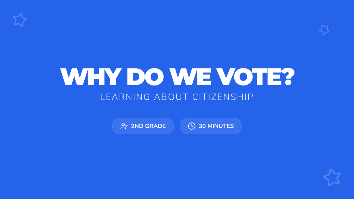 A 30-minute lesson for 2nd grade students that explores the importance of voting, how it works as a fair way for groups to make decisions, and its impact on the community.