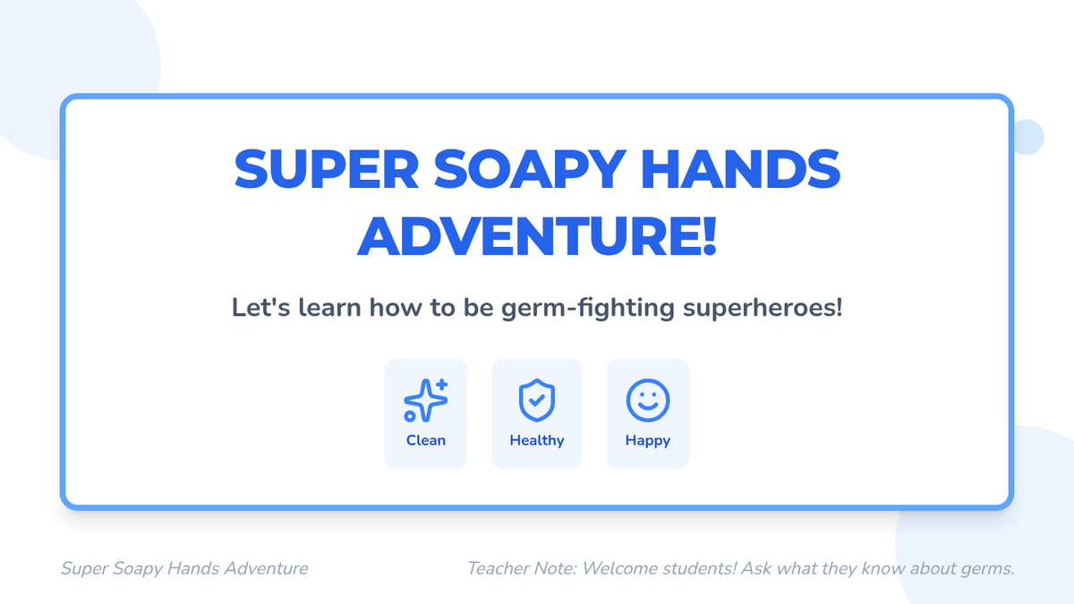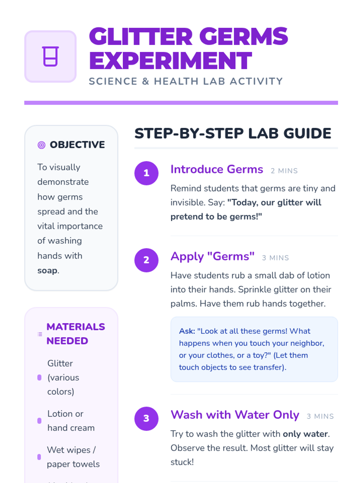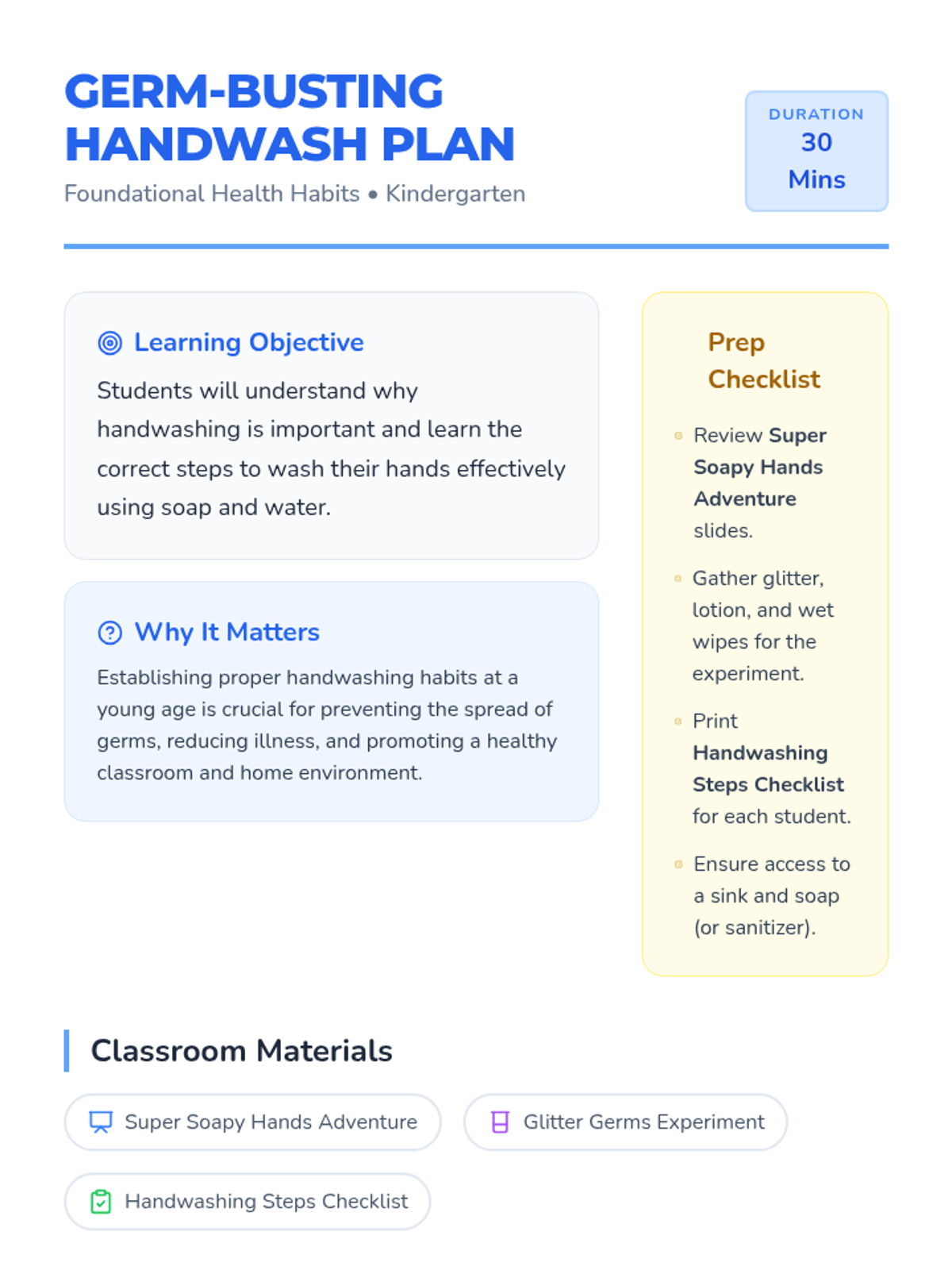 A fun, interactive lesson for Kindergarten students to learn the importance of handwashing through a 'Glitter Germs' experiment and guided practice. Students become 'germ-fighting heroes' by mastering the five steps of effective handwashing.