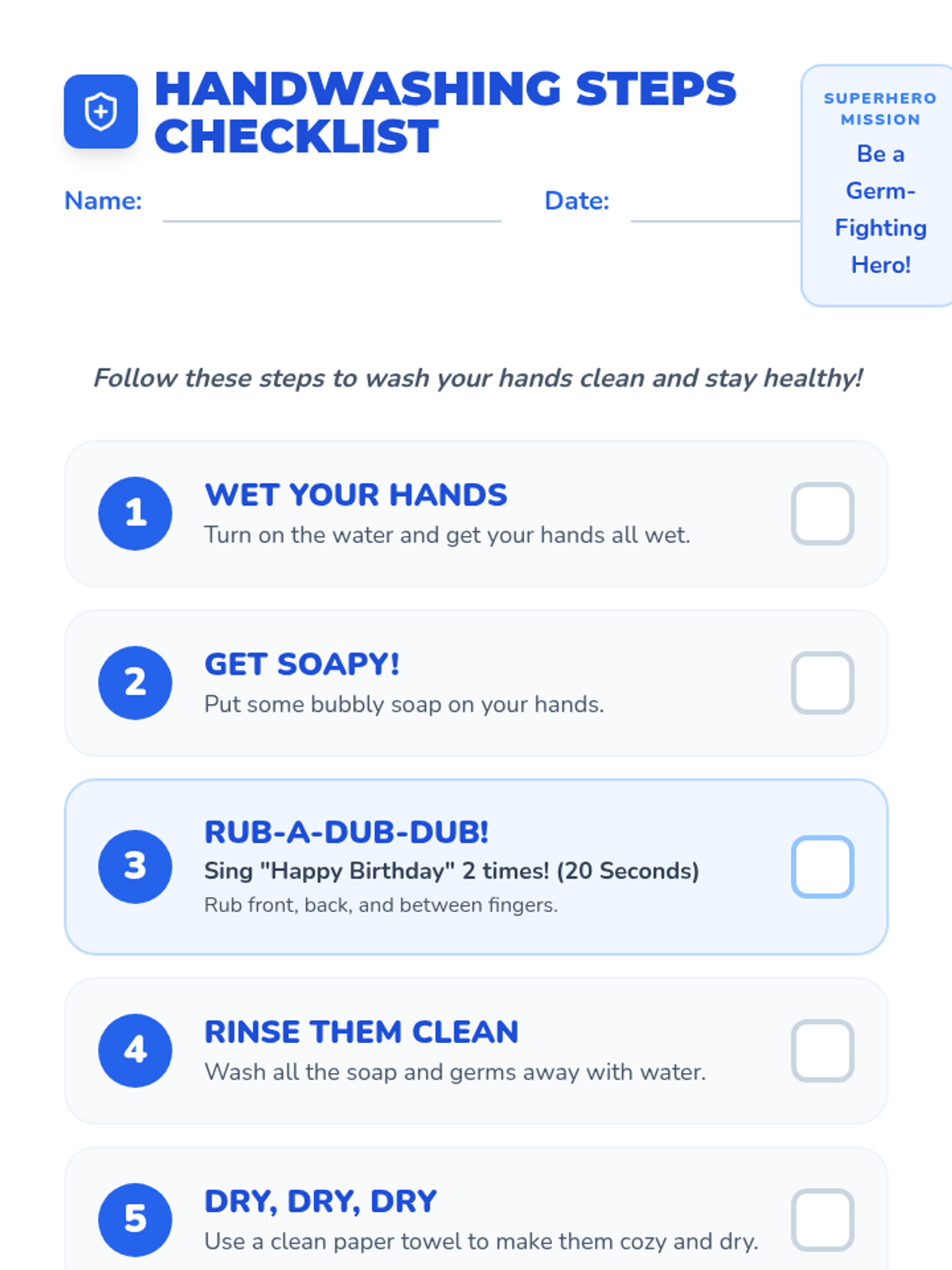A simple, visual guide to teaching preschool children the essential steps of hand washing for health and hygiene.