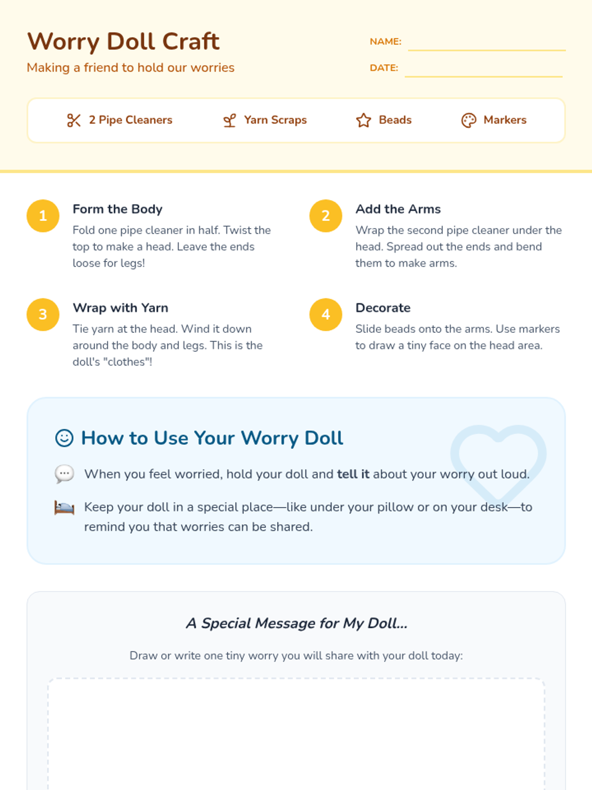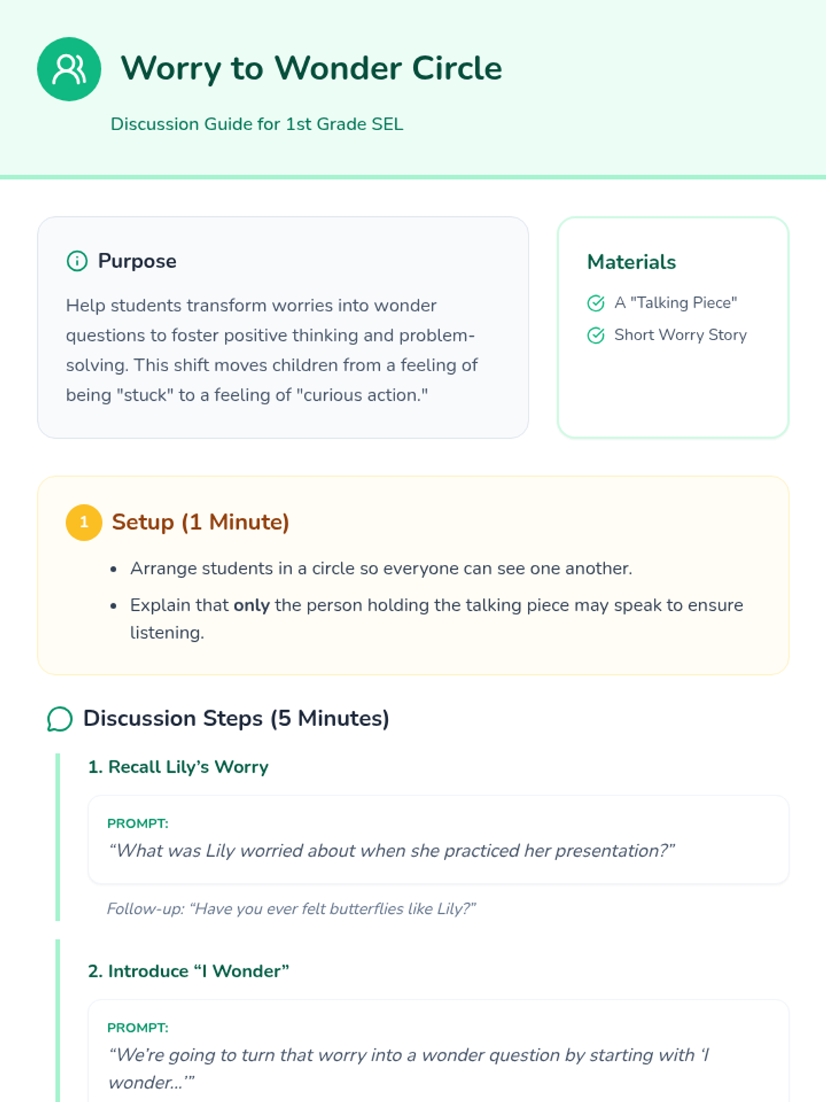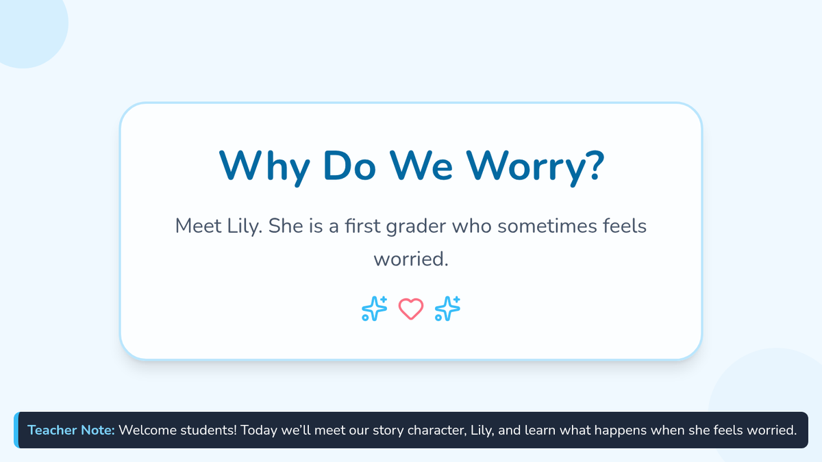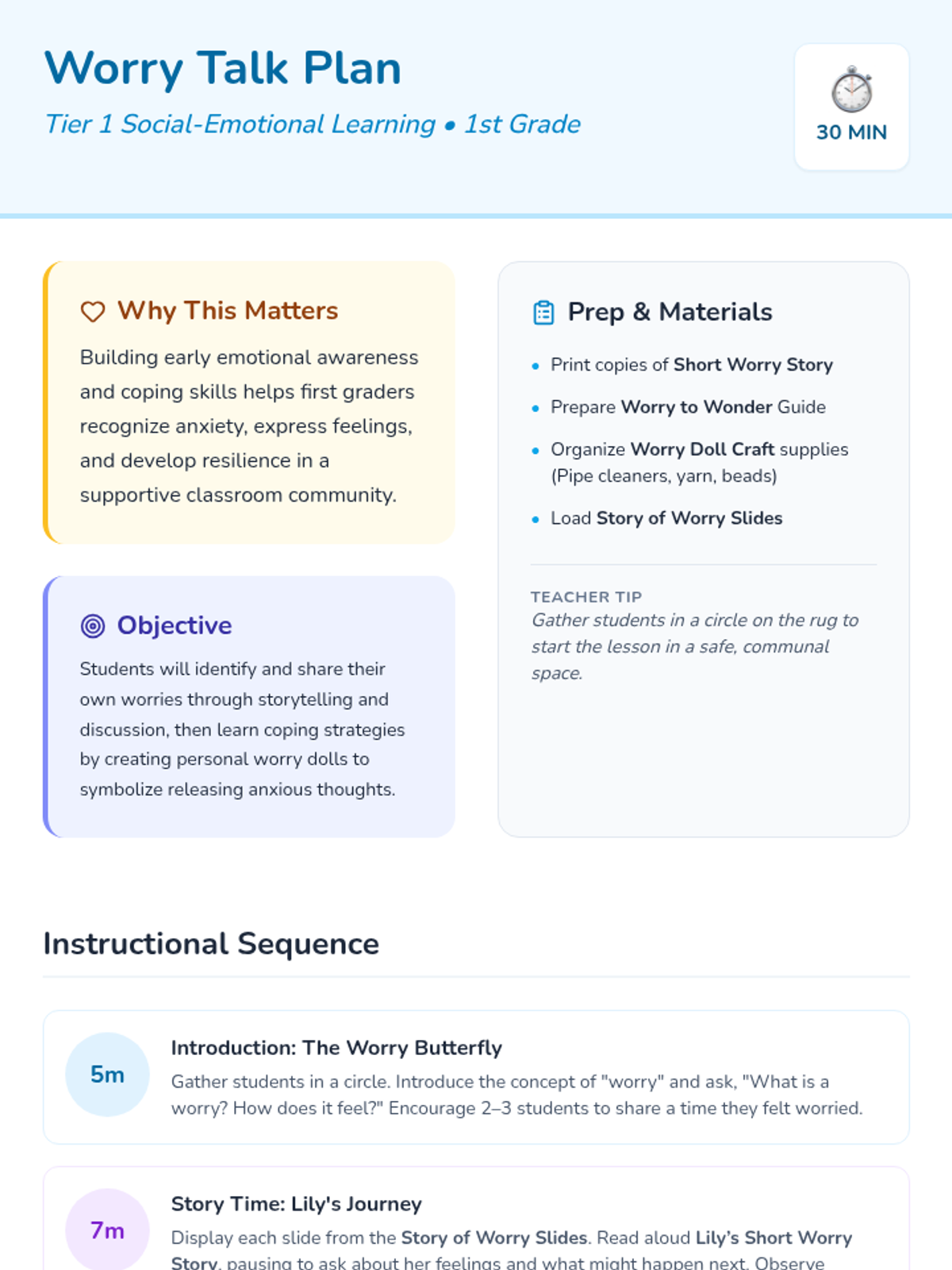 A 30-minute Tier 1 SEL lesson for 1st graders focused on identifying worries and learning coping strategies through storytelling, discussion, and a hands-on worry doll craft.