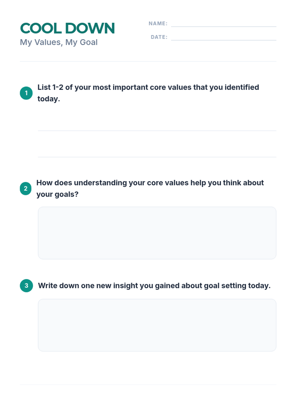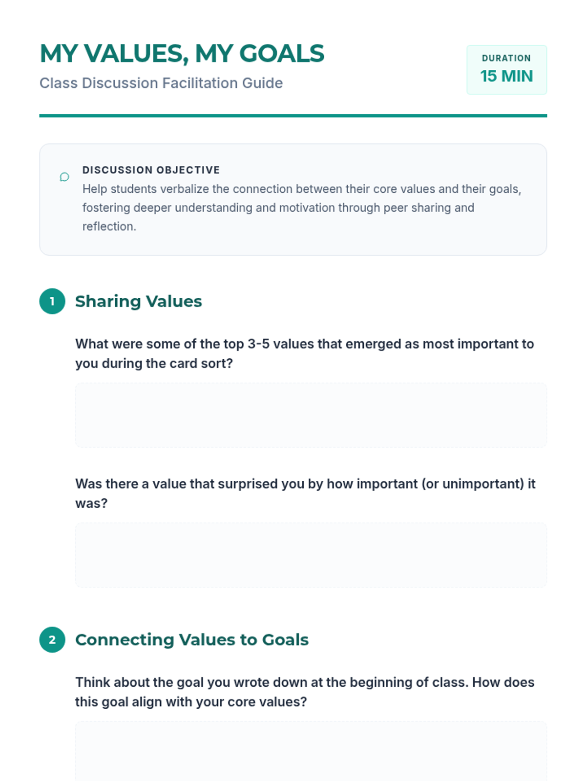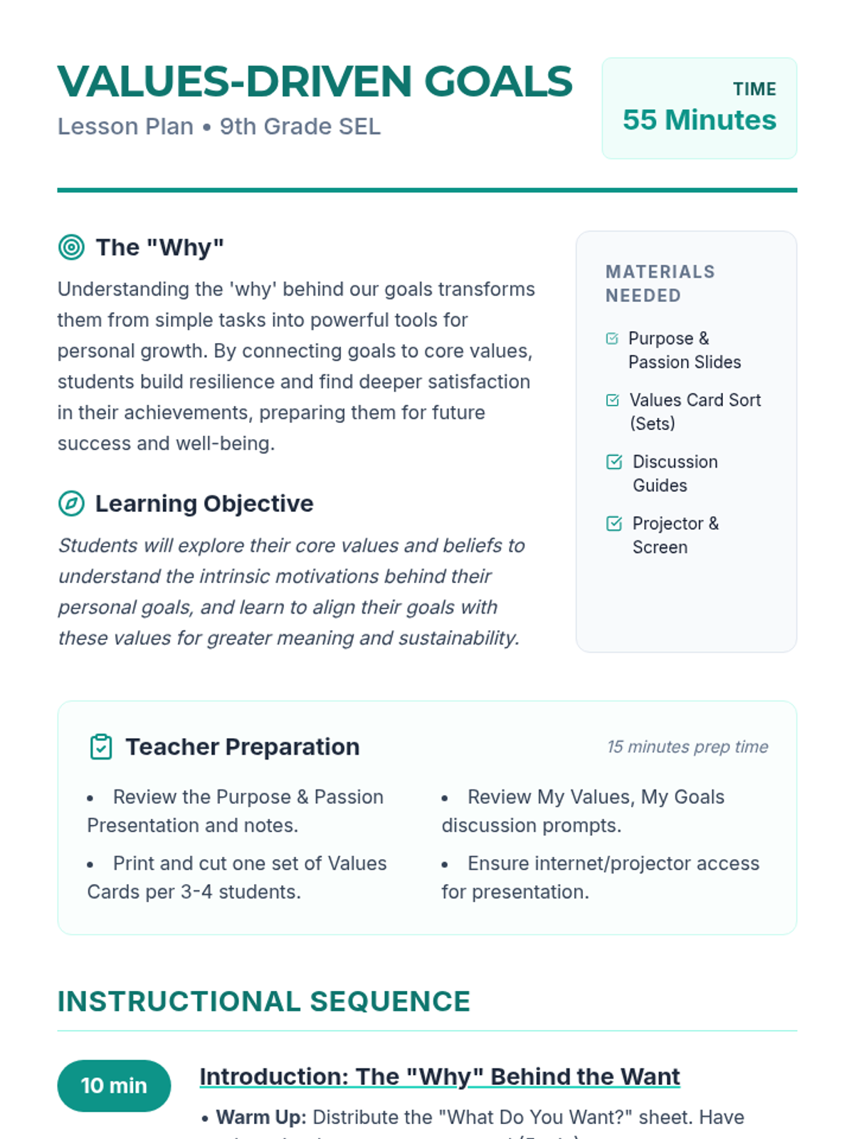 This lesson helps 9th-grade students explore the deeper motivations behind goal setting by connecting personal goals to core values and beliefs. It fosters an understanding of intrinsic drive, making goals more meaningful and sustainable by aligning them with personal identity.