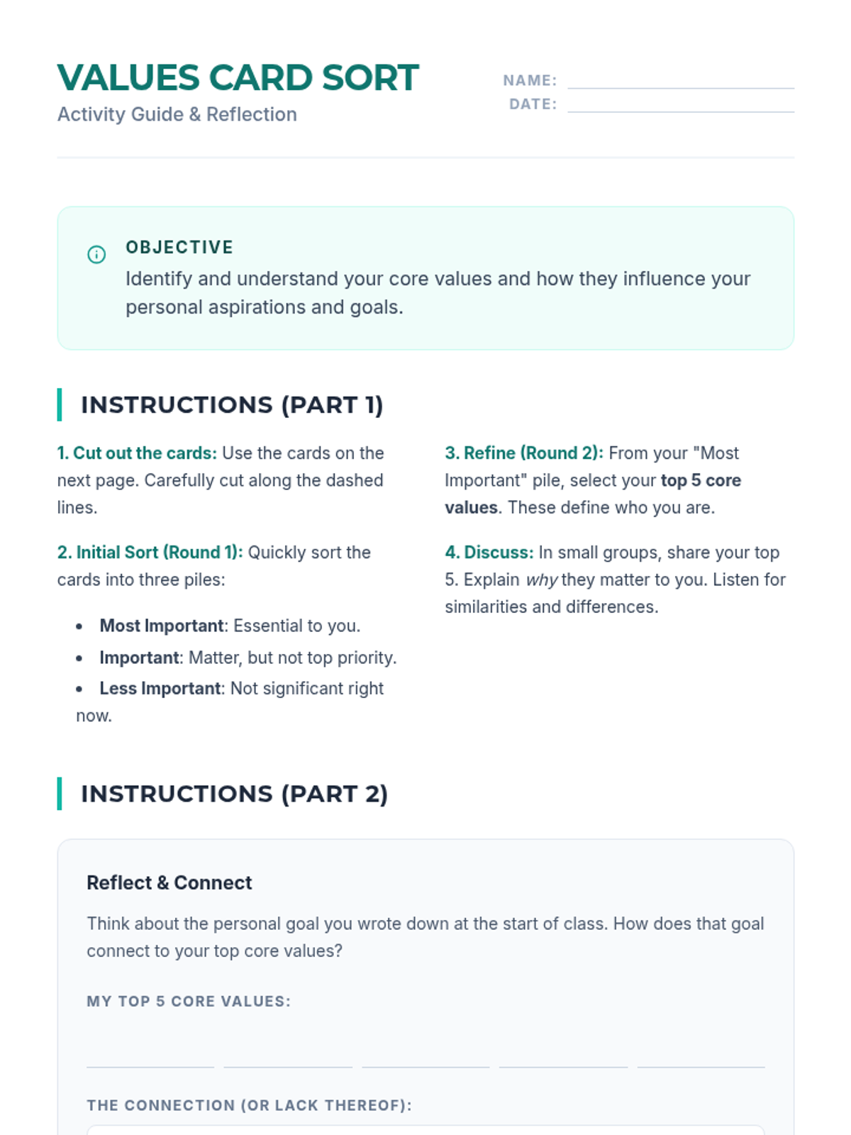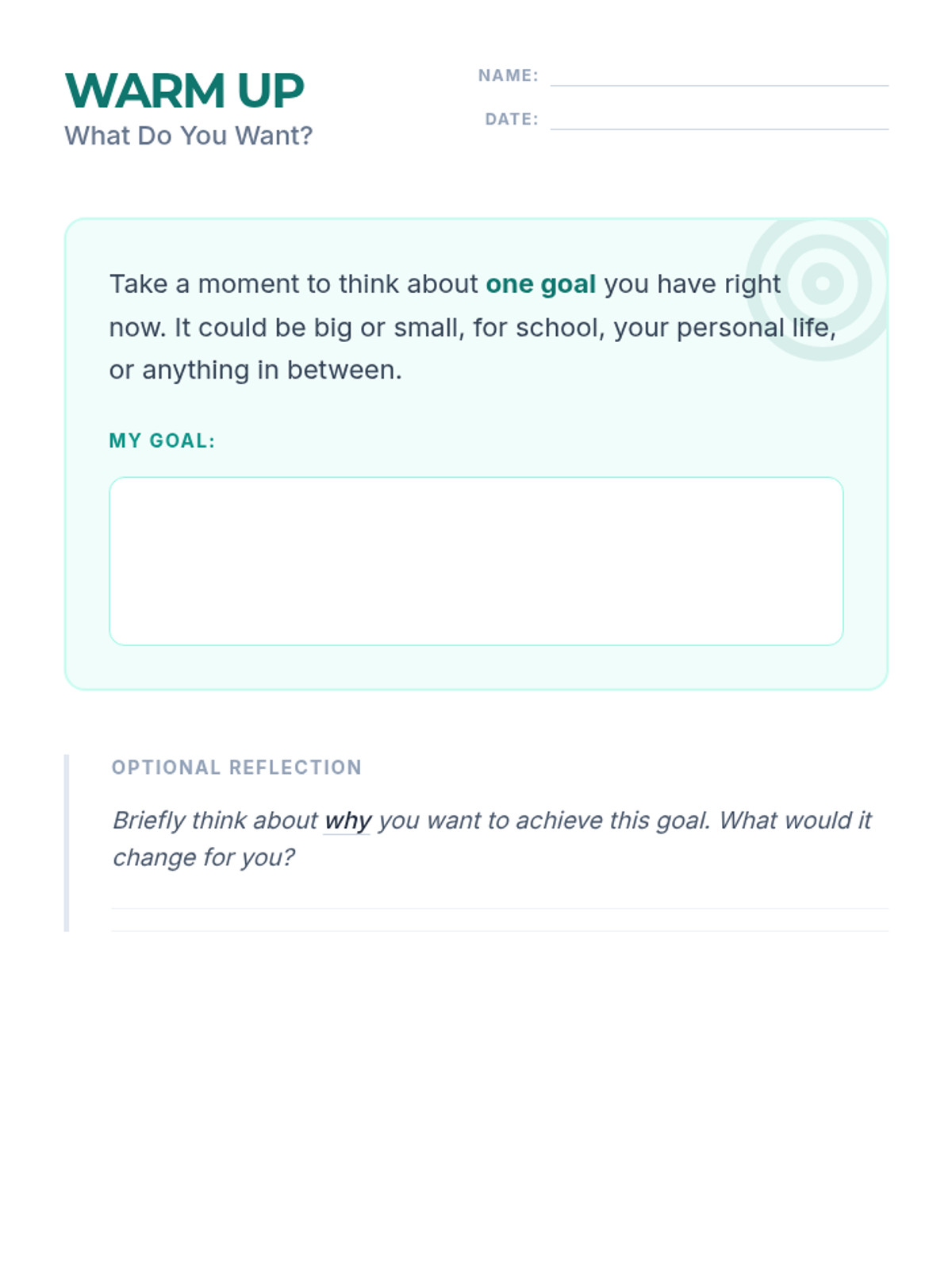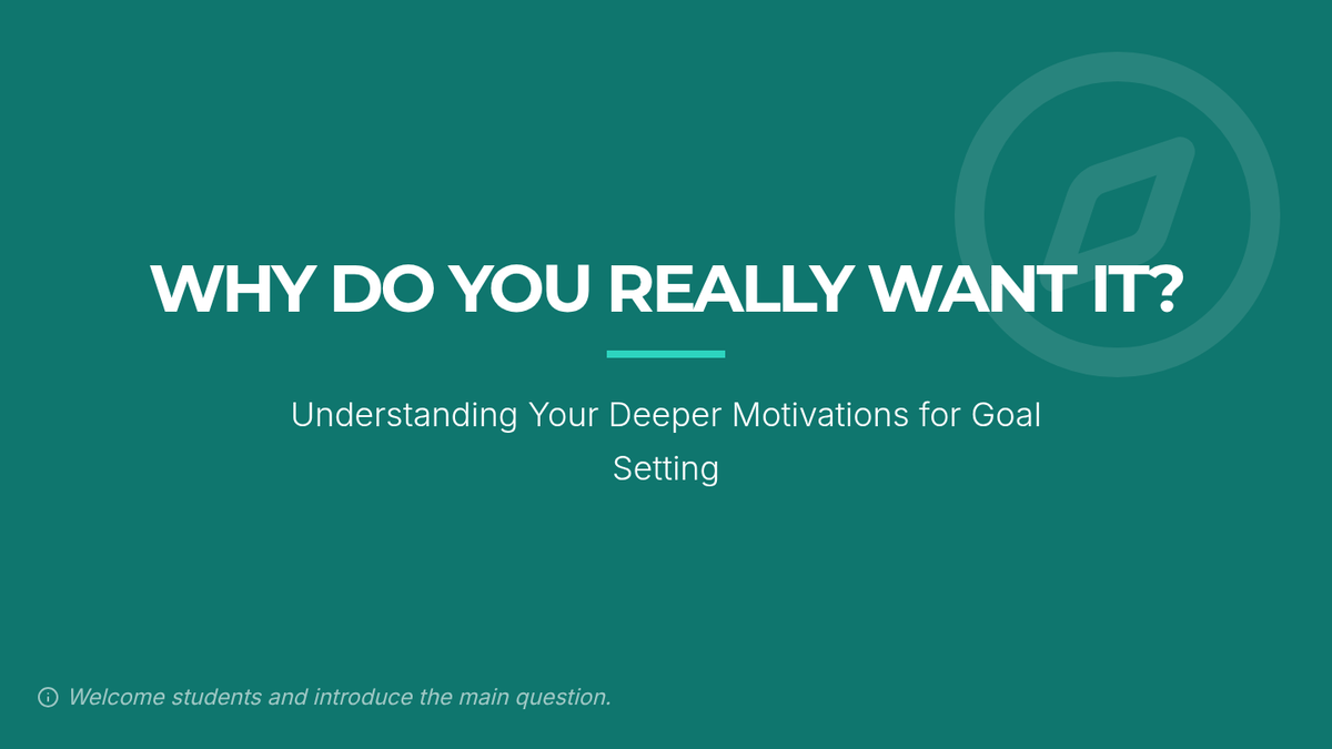 This lesson helps 9th-grade students explore the deeper motivations behind goal setting by connecting personal goals to core values and beliefs. It fosters an understanding of intrinsic drive, making goals more meaningful and sustainable by aligning them with personal identity.