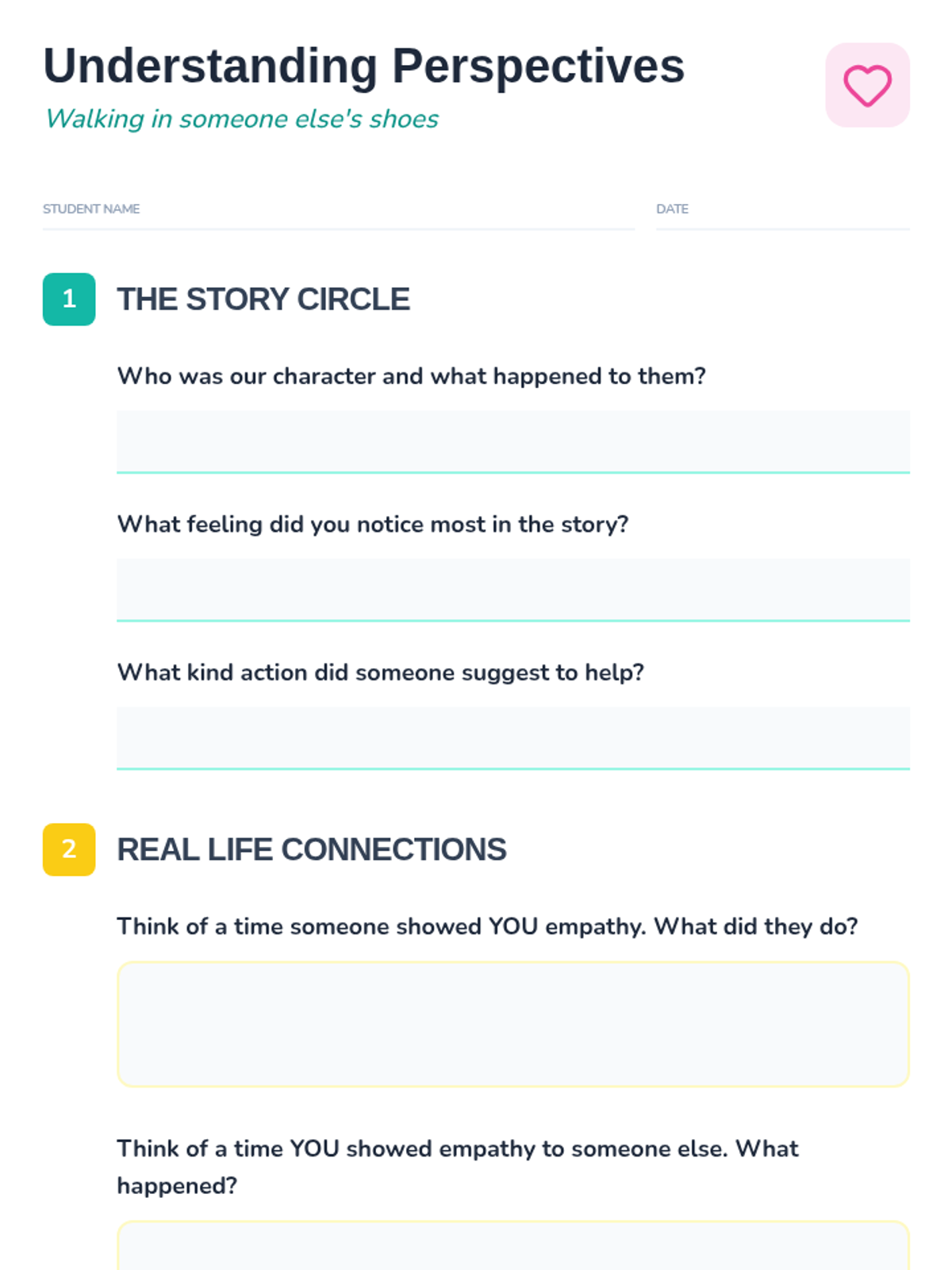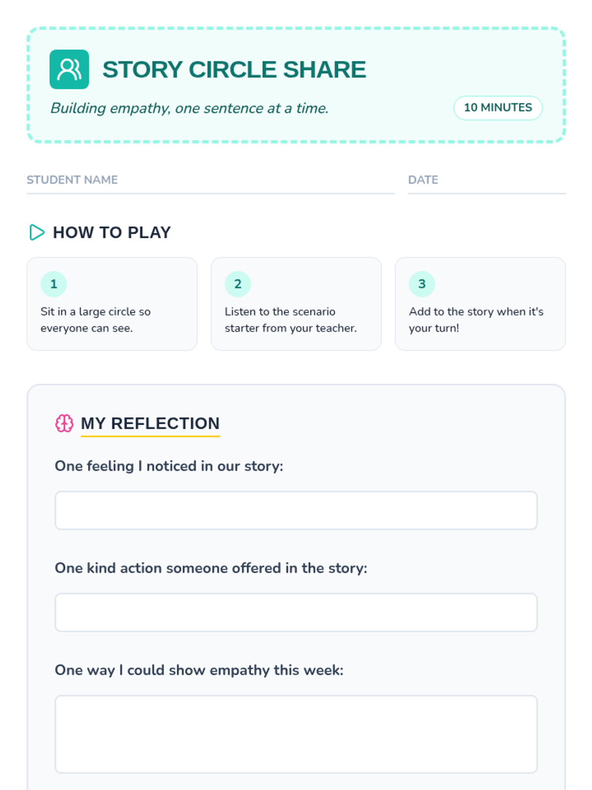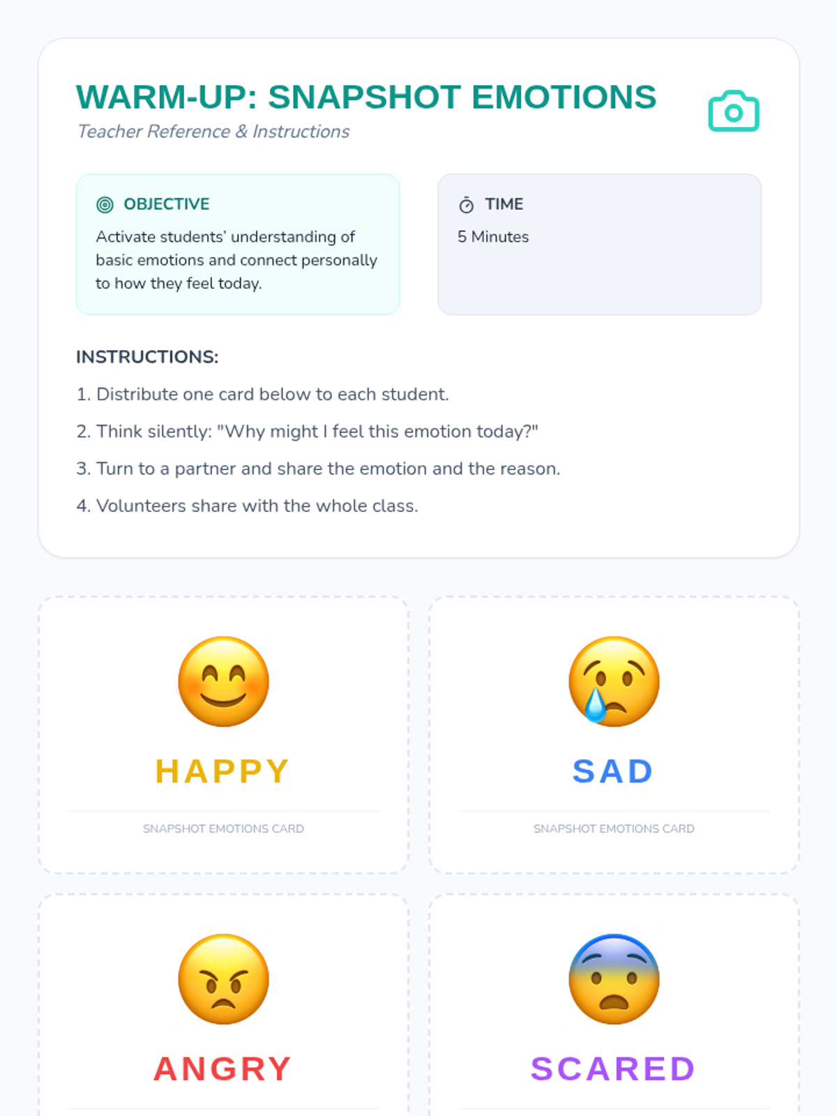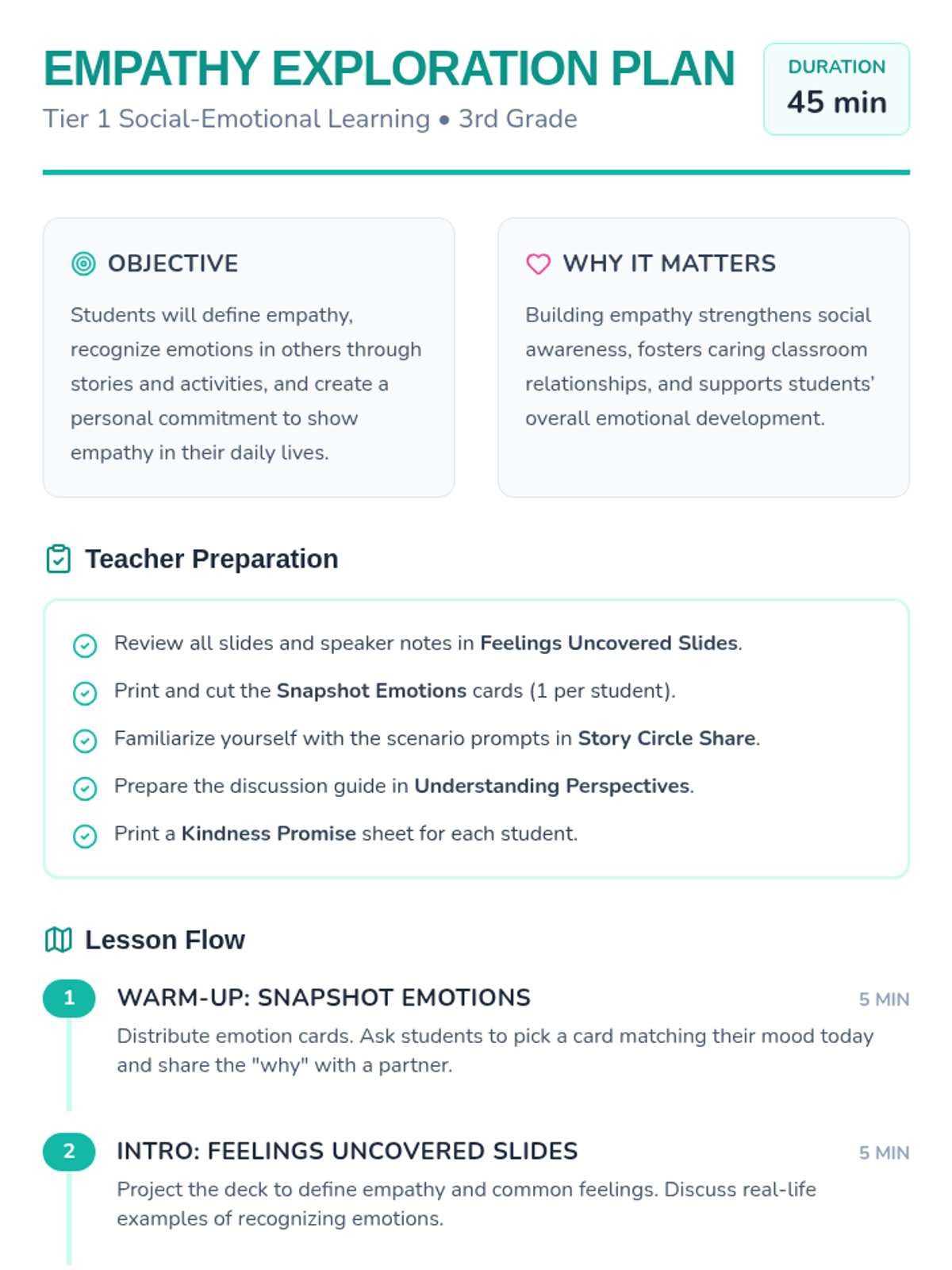 A 45-minute social-emotional learning lesson for 3rd graders that explores empathy through interactive storytelling, discussion, and personal reflection. Students learn to recognize emotions in others and commit to kind actions.
