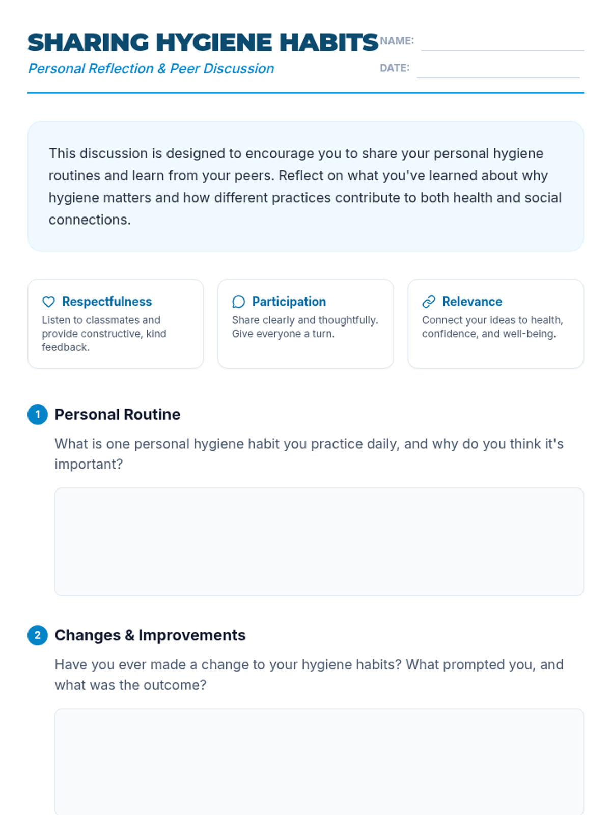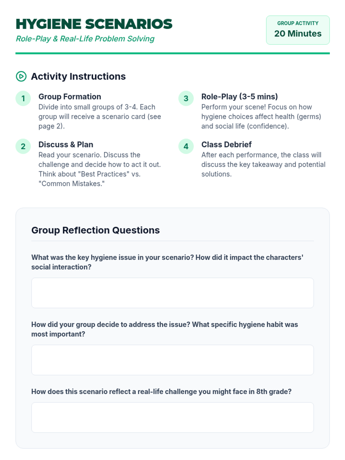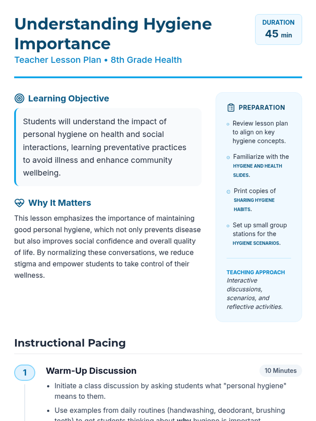 This 45-minute lesson for 8th graders explores the vital role of personal hygiene in maintaining physical health and building social confidence. Students will engage in discussions and role-play activities to understand preventative practices and community wellbeing.