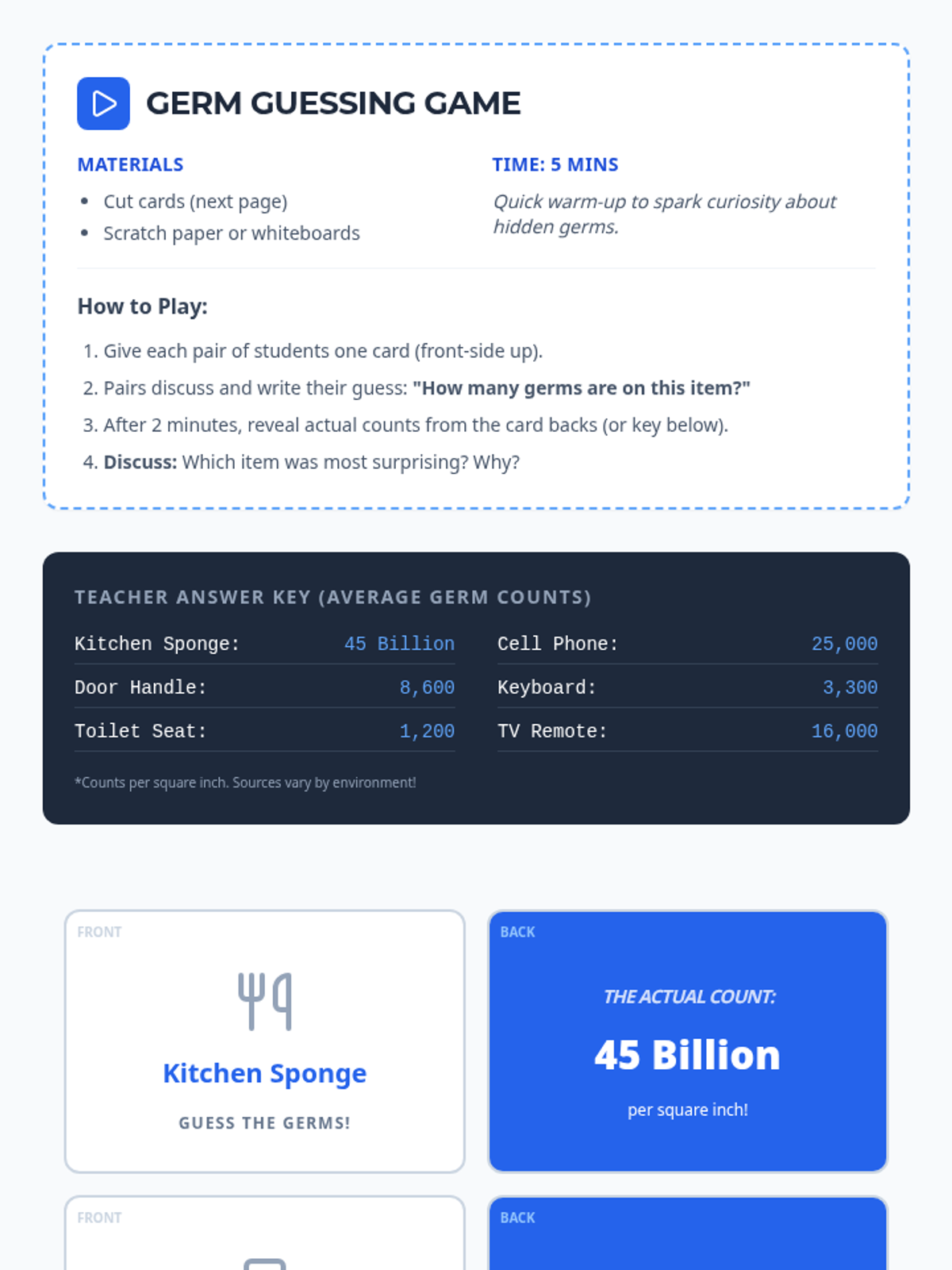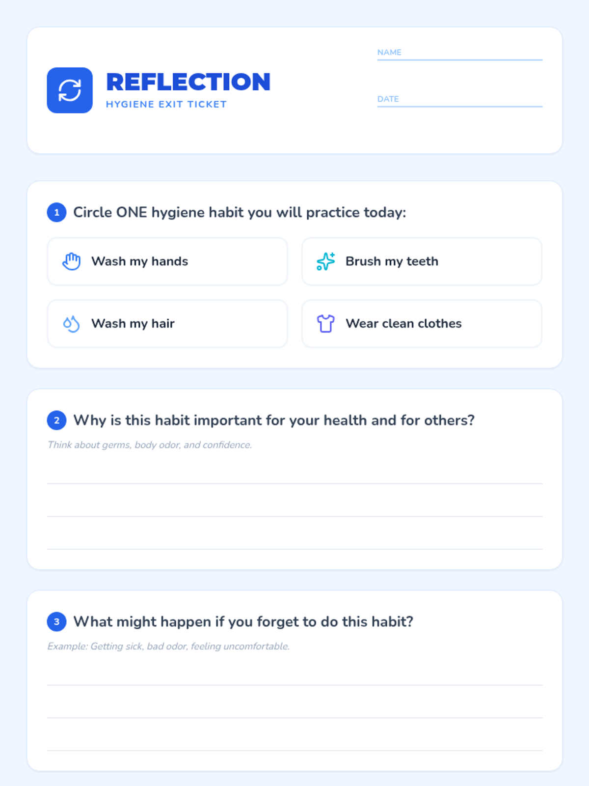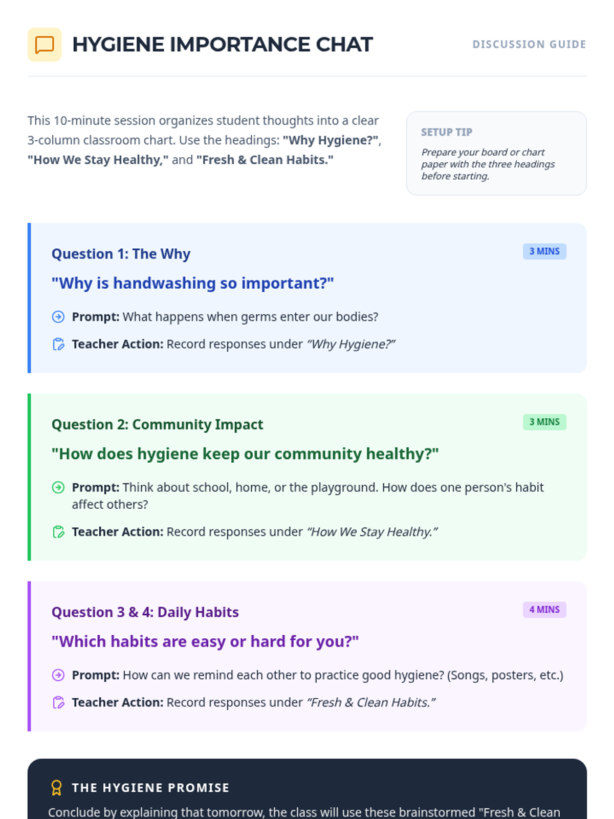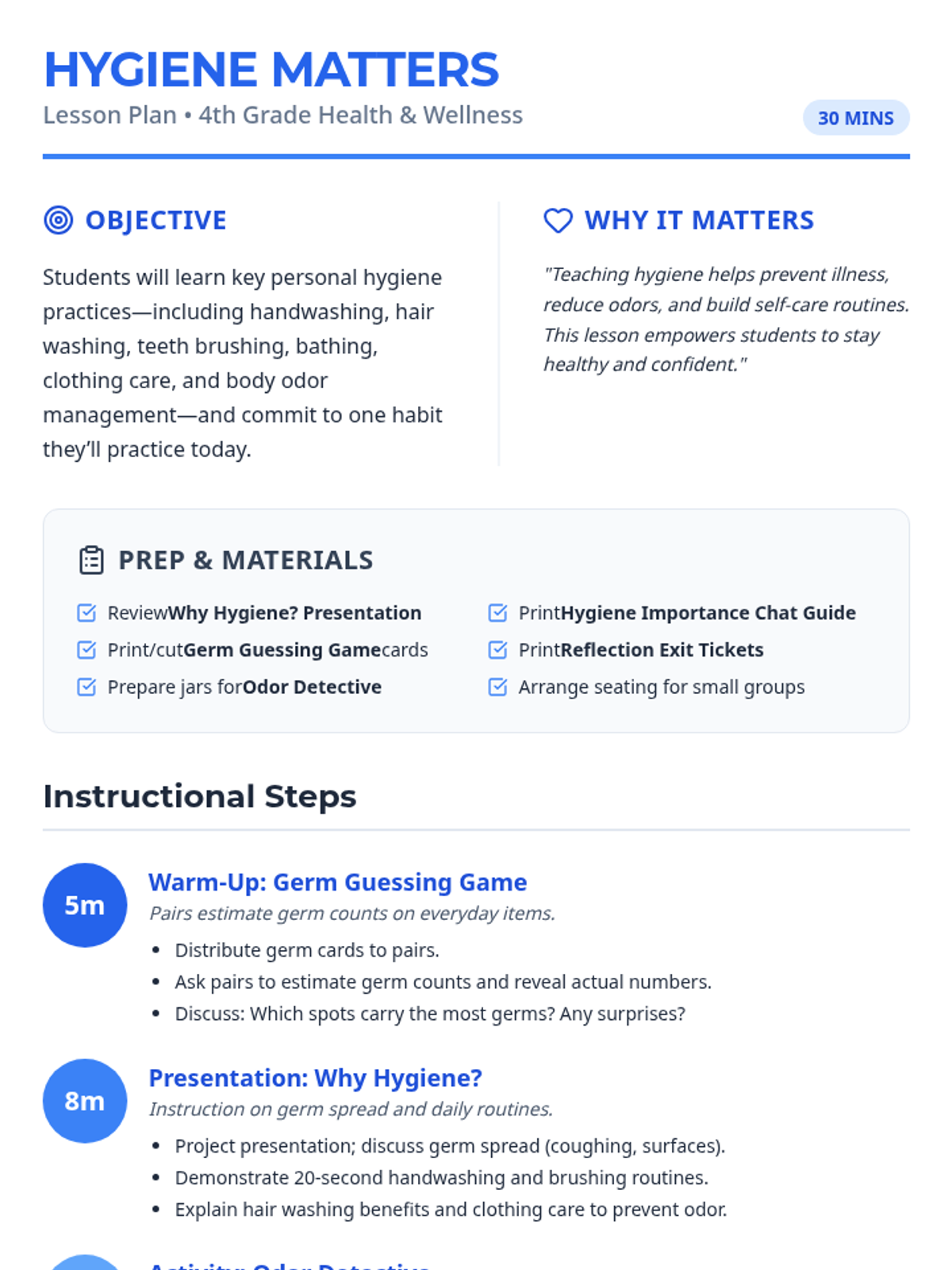 This 30-minute Tier 1 lesson for 4th grade sparks discussion on the importance of personal health and hygiene. Through interactive activities like the Germ Guessing Game and Odor Detective, students explore how germs spread and how habits like handwashing, bathing, and clothing care keep them healthy and confident.