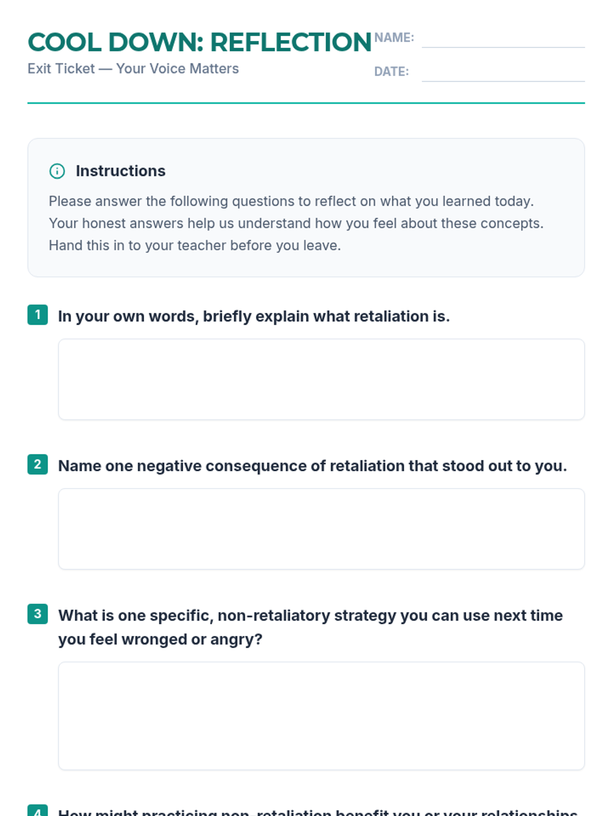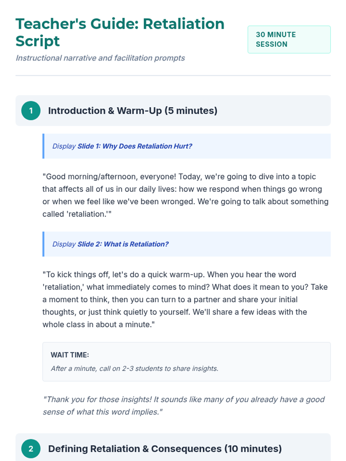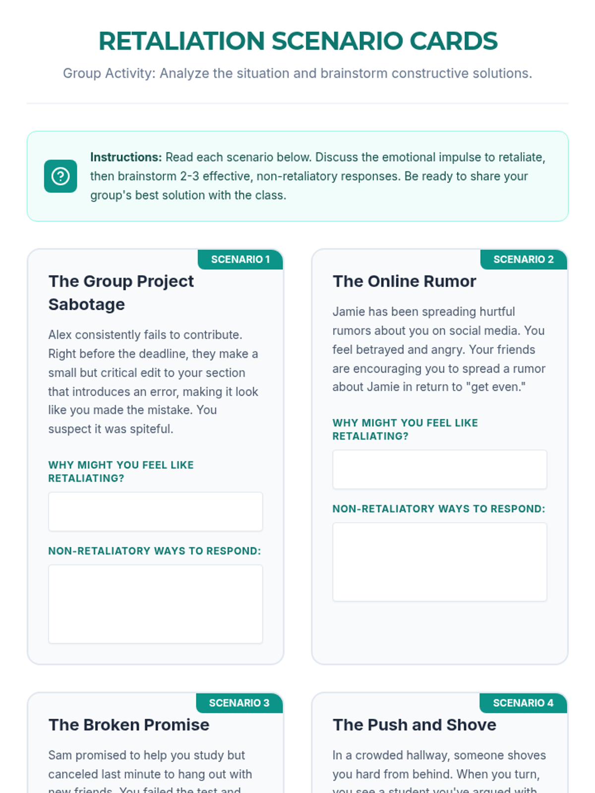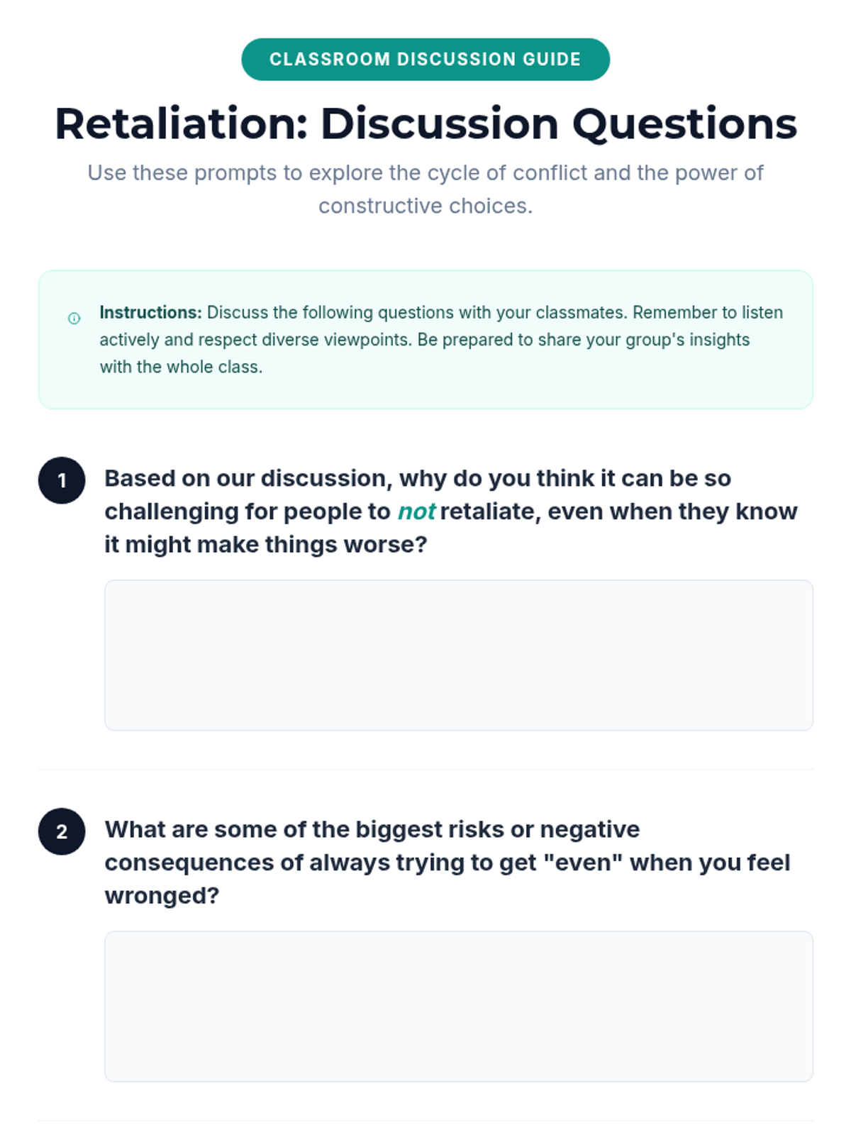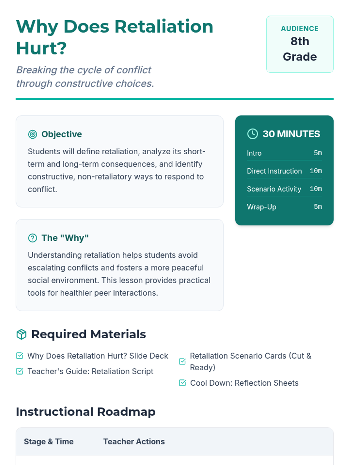 This lesson explores the concept of retaliation, its immediate and long-term consequences, and constructive alternatives for resolving conflict. Students will learn to identify retaliatory behaviors and develop strategies for peaceful resolution. Designed for 8th Grade students, this single session lasts 30 minutes.