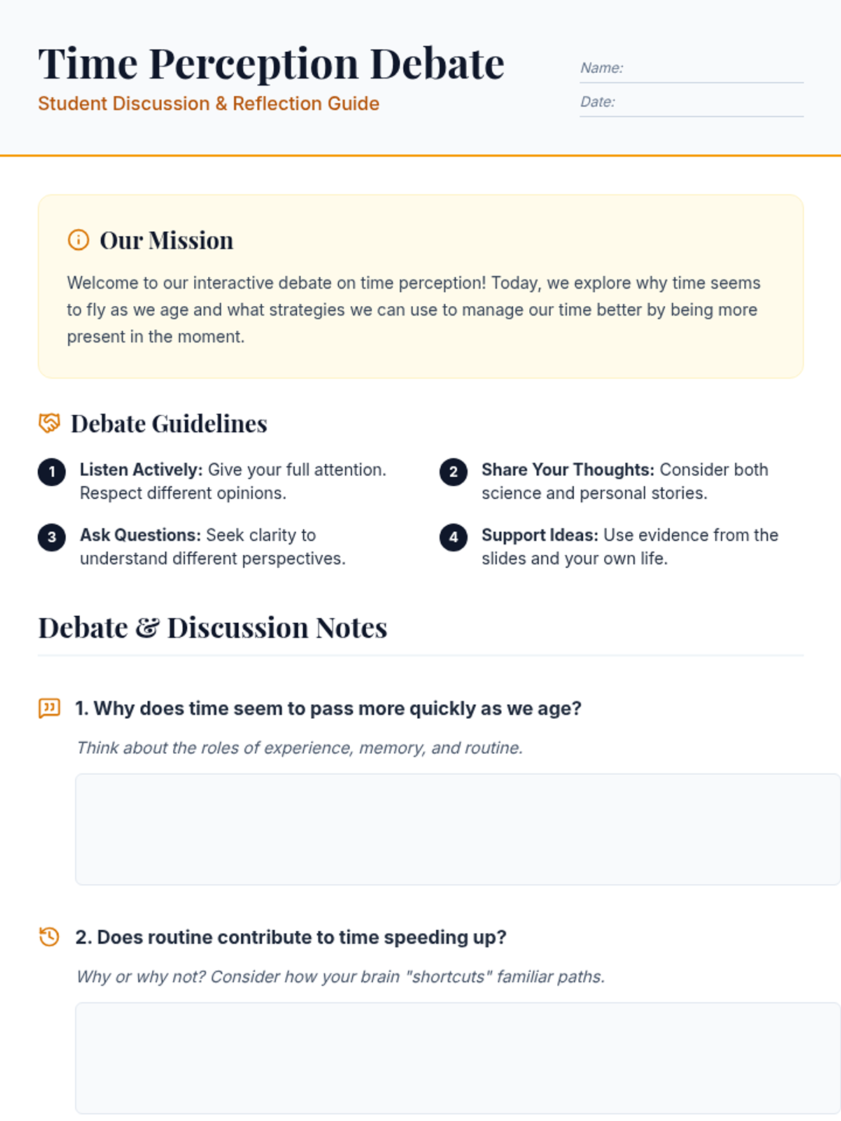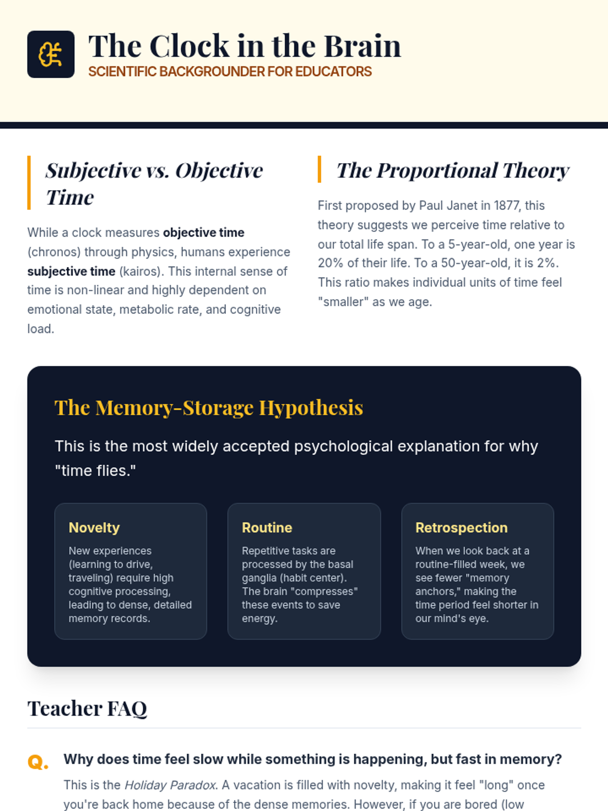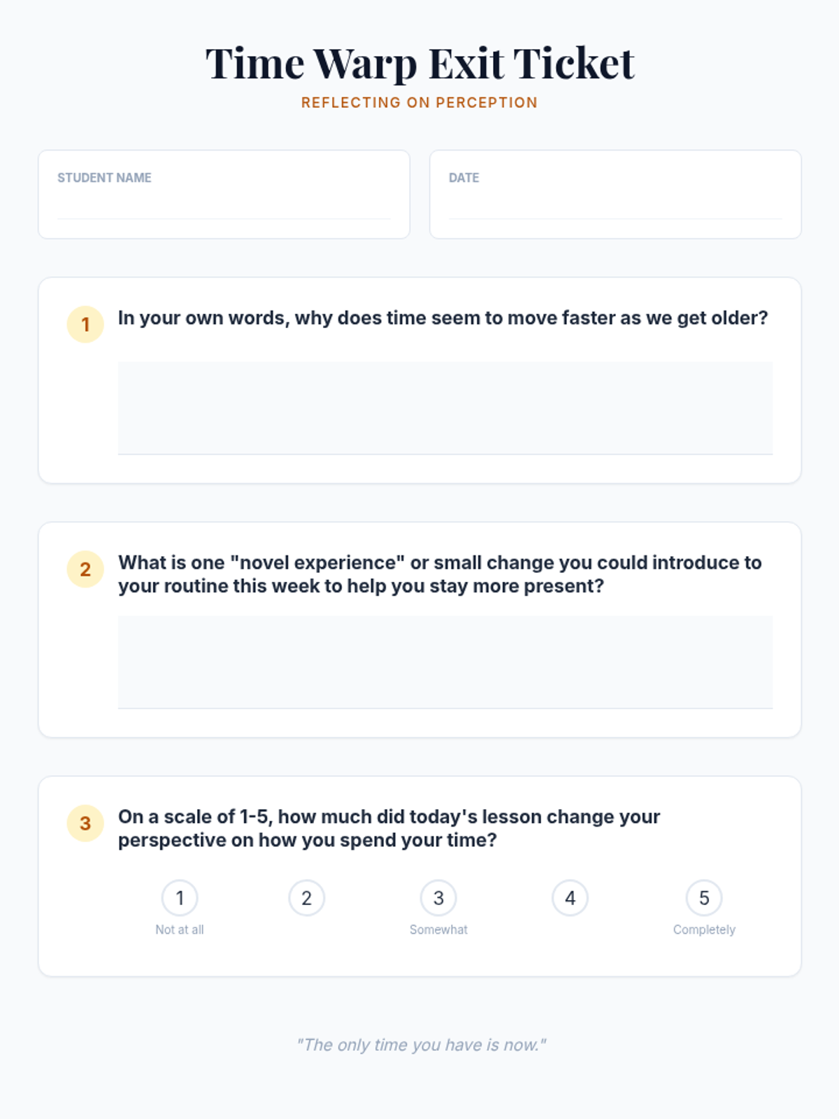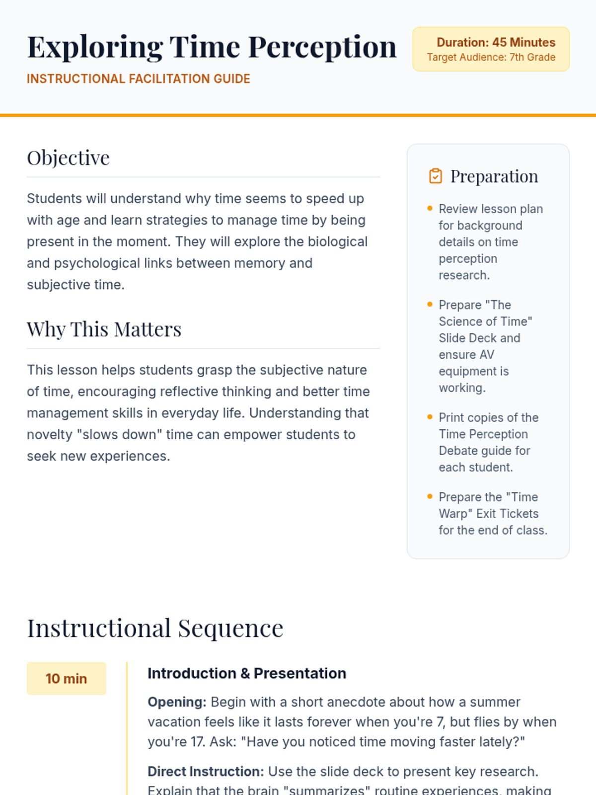 This lesson explores the concept of time perception and why time seems to move faster as we age. Students will investigate the psychological and biological factors behind subjective time and learn mindfulness strategies to stay present.