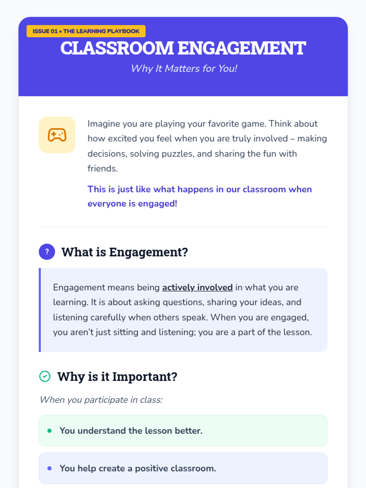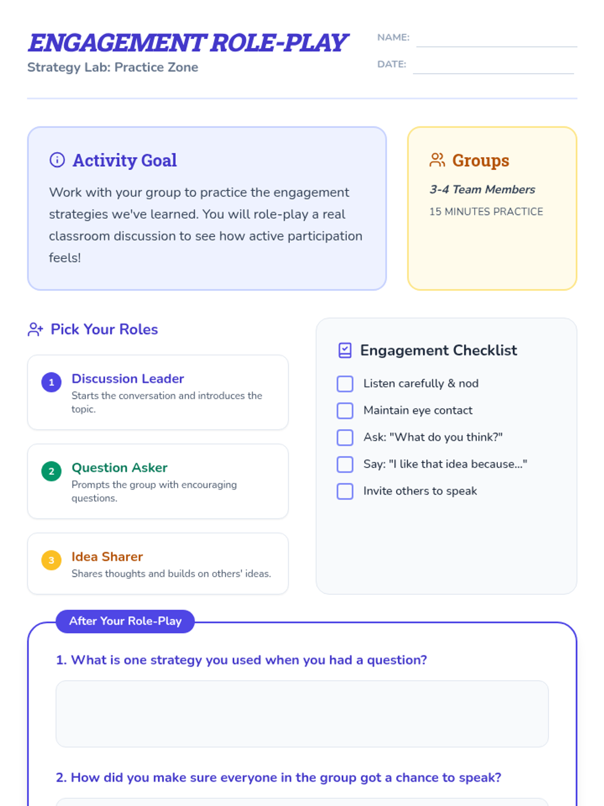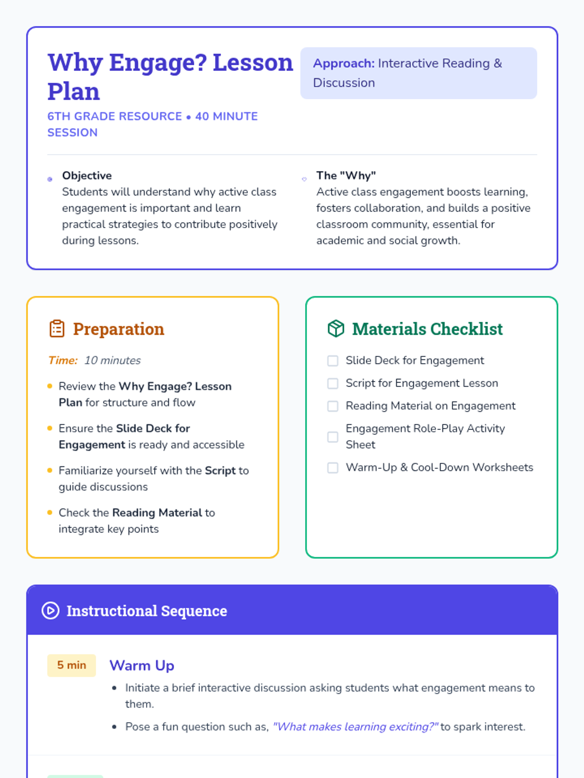A 40-minute lesson for 6th Grade Resource students exploring why active participation matters and how to practice engagement strategies through discussion and role-play.
