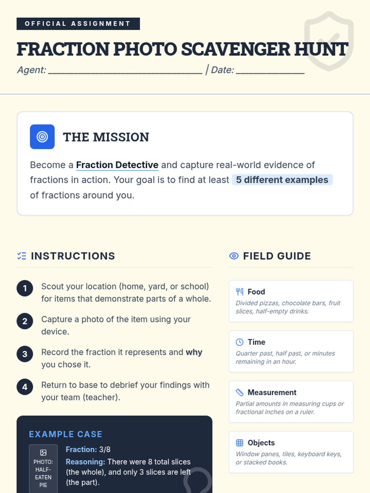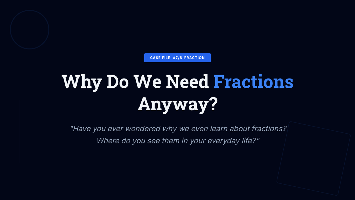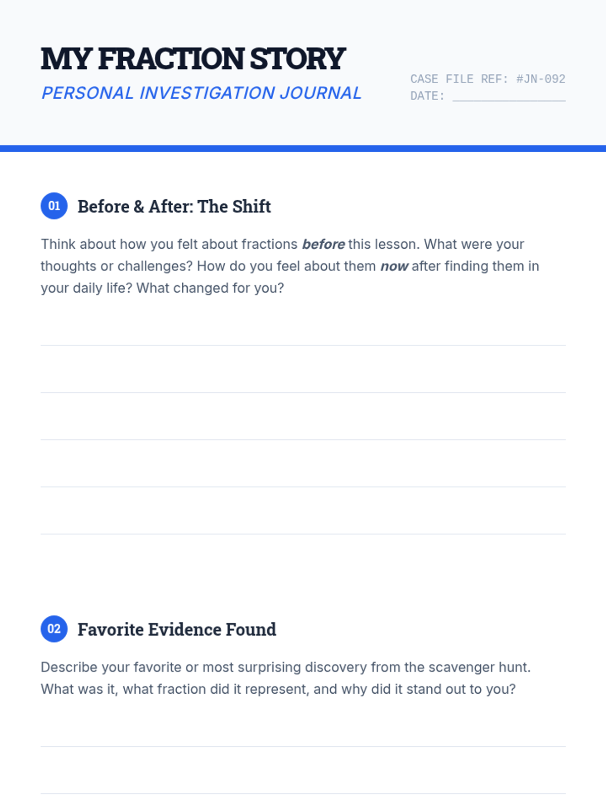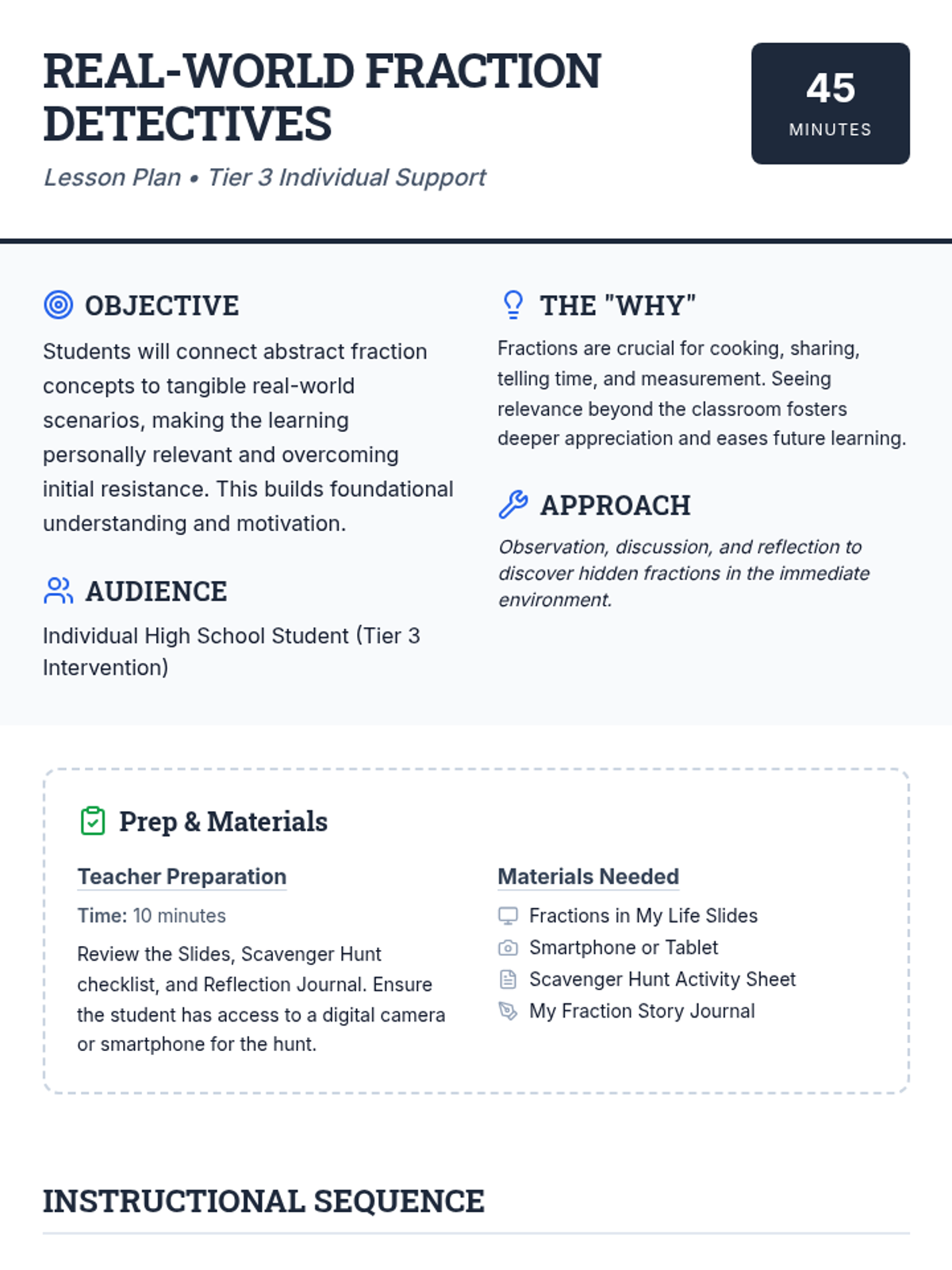 This Tier 3 lesson connects abstract fraction concepts to tangible real-world scenarios, helping individual students find personal relevance and build foundational motivation. Through a detective-themed investigation, students identify fractions in cooking, money, time, and sports.
