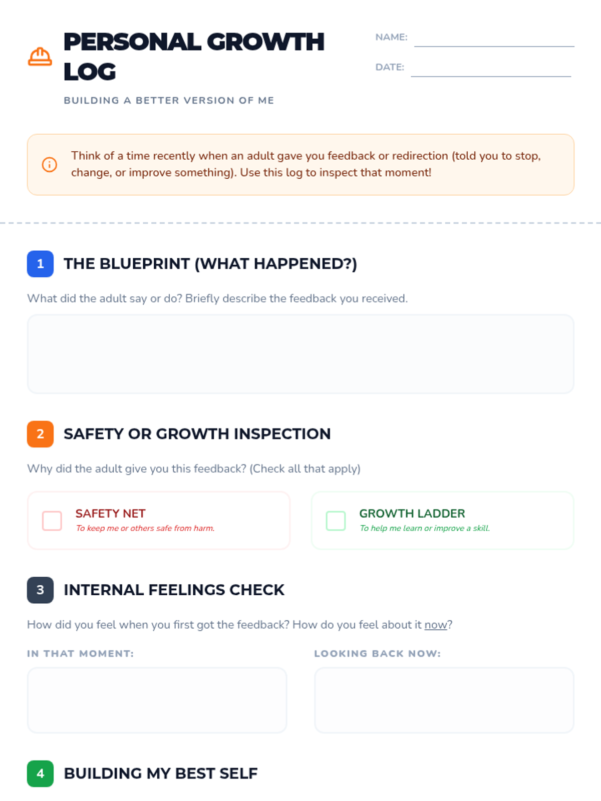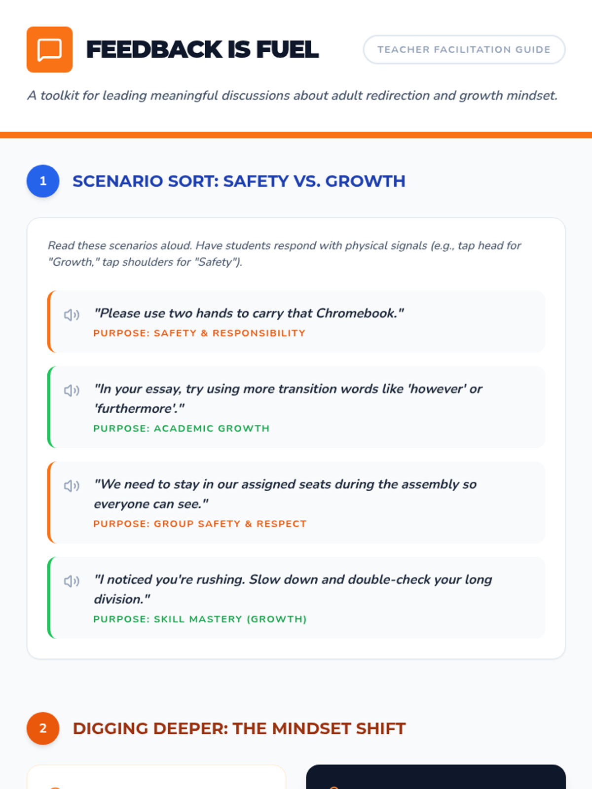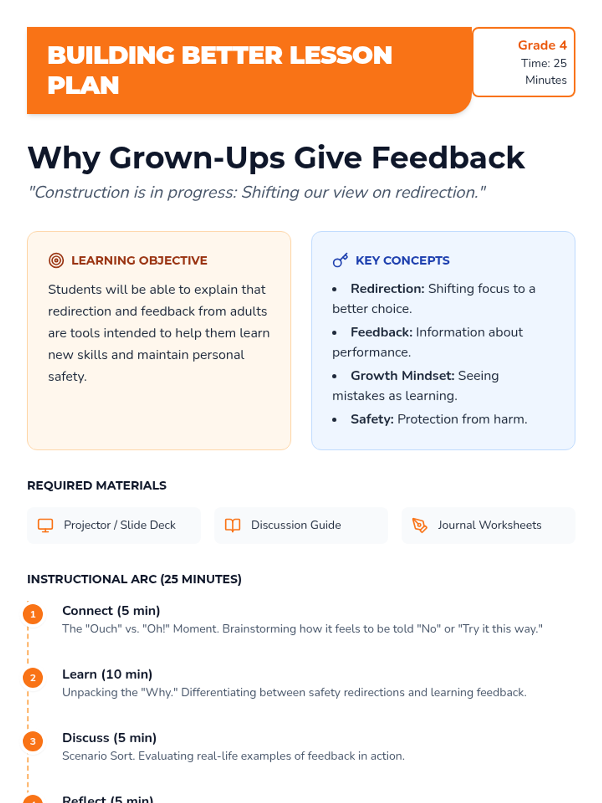 A 25-minute Social-Emotional Learning lesson designed for 4th graders to understand the purpose of adult feedback and redirection. Students will explore how feedback helps them grow and stay safe, shifting from a defensive mindset to a growth mindset.