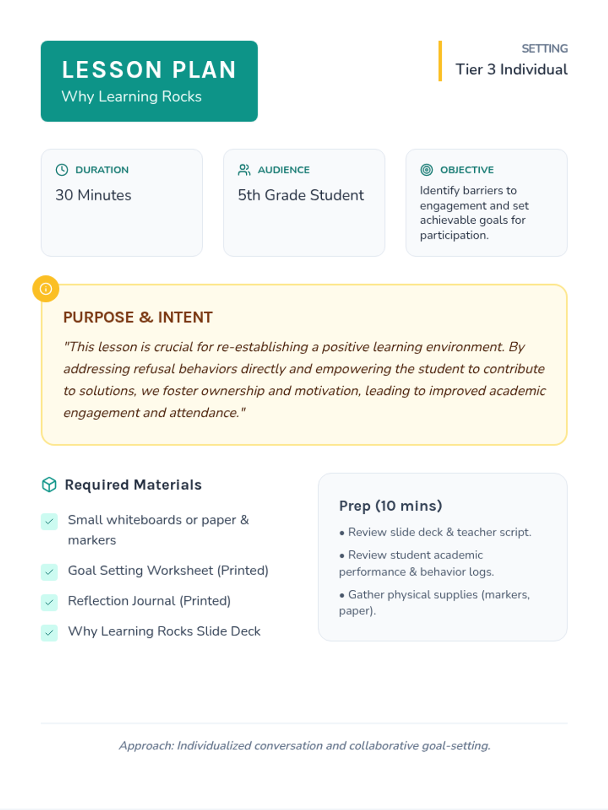 An individualized Tier 3 lesson designed to re-engage a 5th-grade student by addressing refusal behaviors and building a collaborative plan for success.