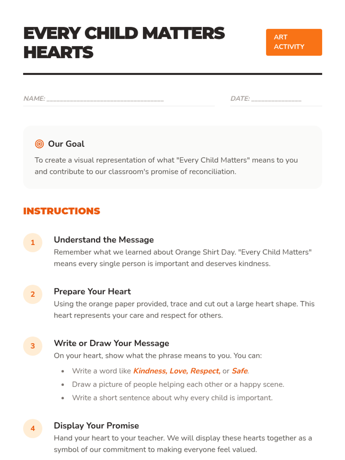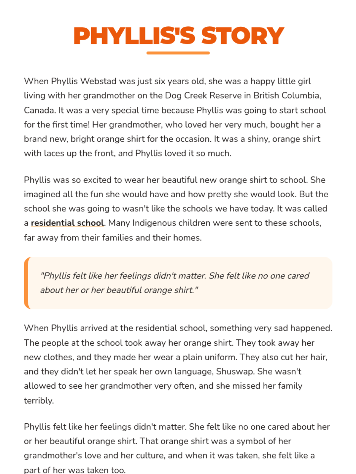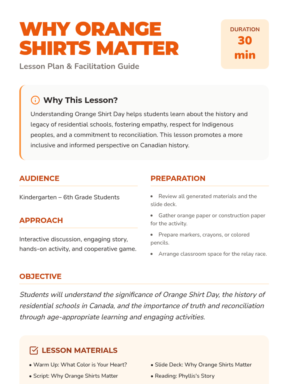 An age-appropriate 30-minute lesson for K-6 students introducing Orange Shirt Day, residential school history, and the concept of reconciliation through Phyllis Webstad's story and interactive activities.