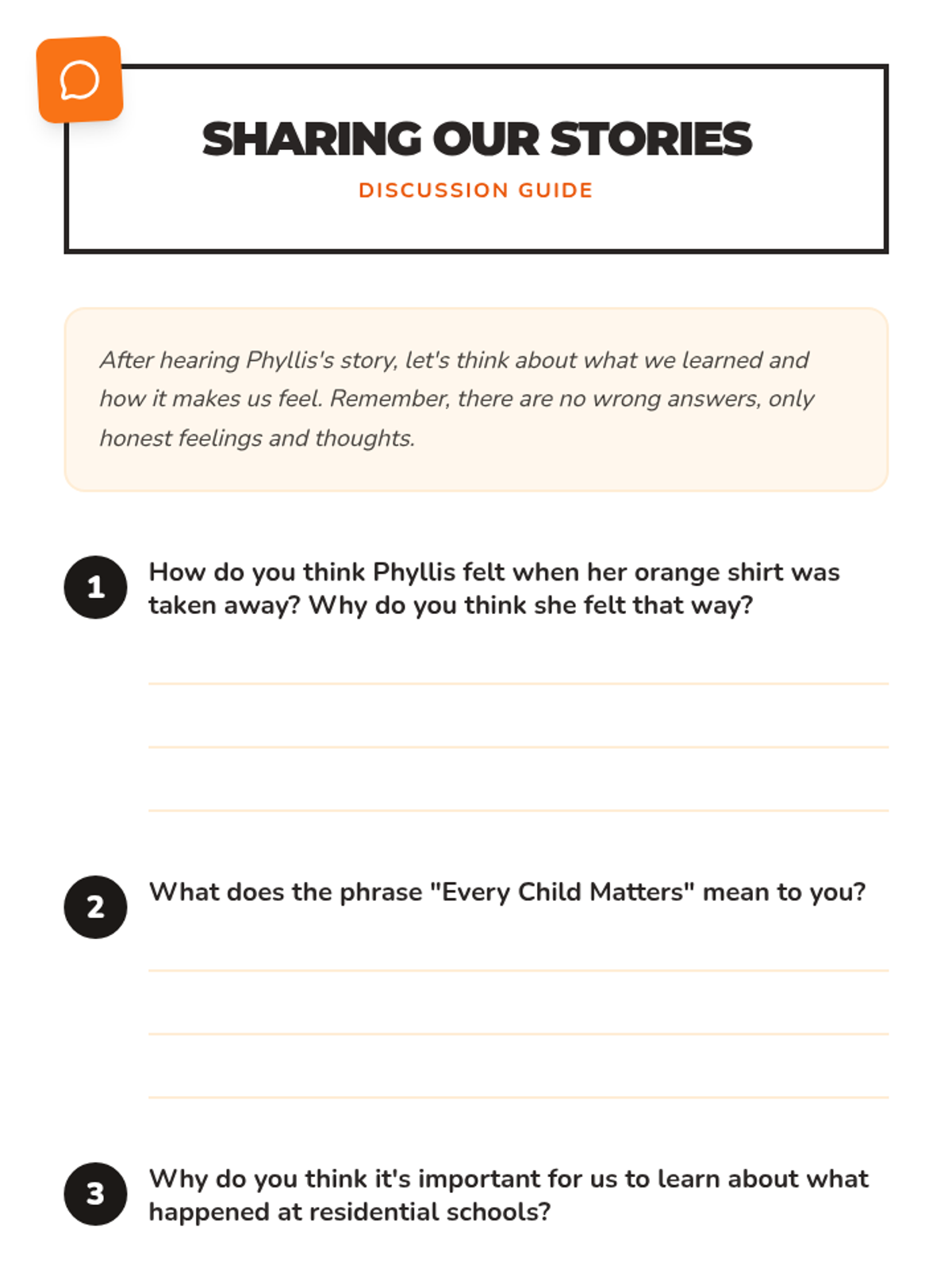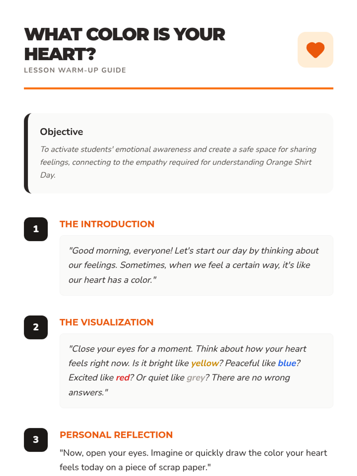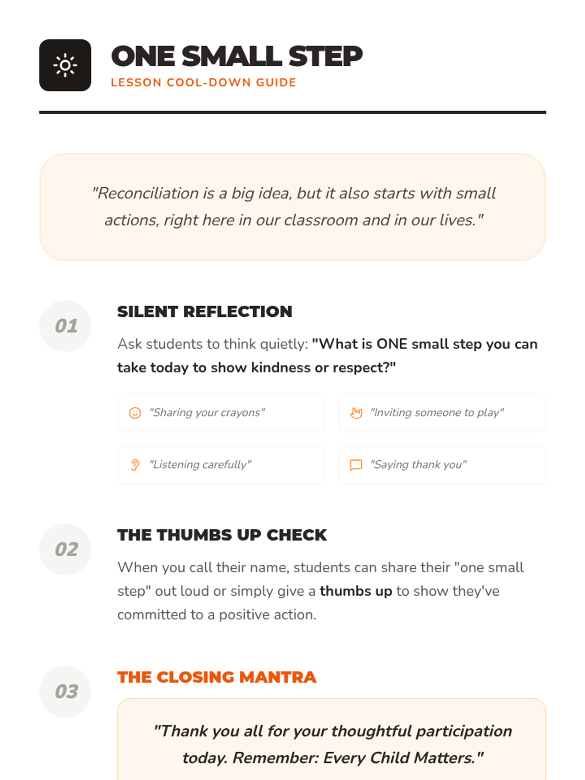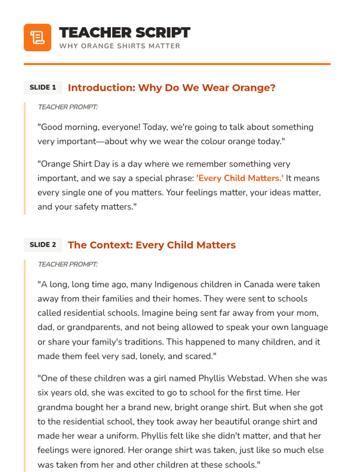 An age-appropriate 30-minute lesson for K-6 students introducing Orange Shirt Day, residential school history, and the concept of reconciliation through Phyllis Webstad's story and interactive activities.
