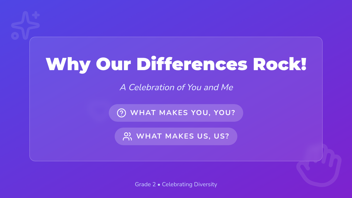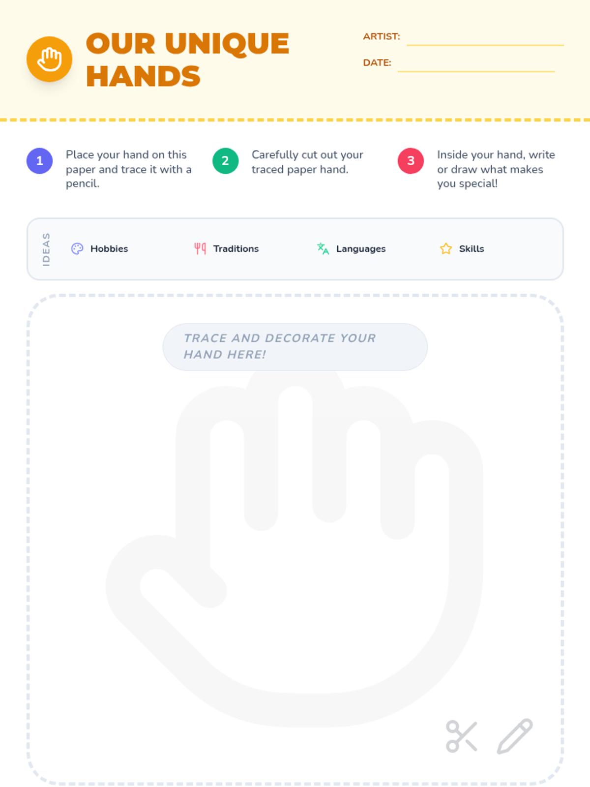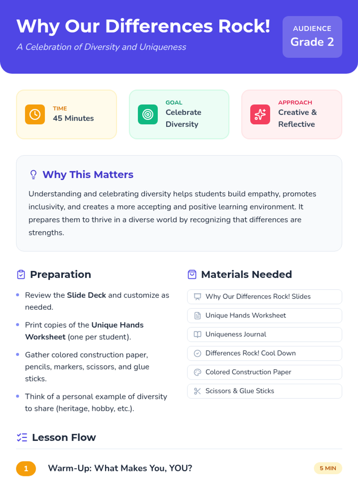 A 45-minute 2nd-grade lesson that celebrates human diversity and uniqueness through discussion, a creative hand-tracing activity, and personal reflection. Students learn that their differences make the community stronger and more vibrant.