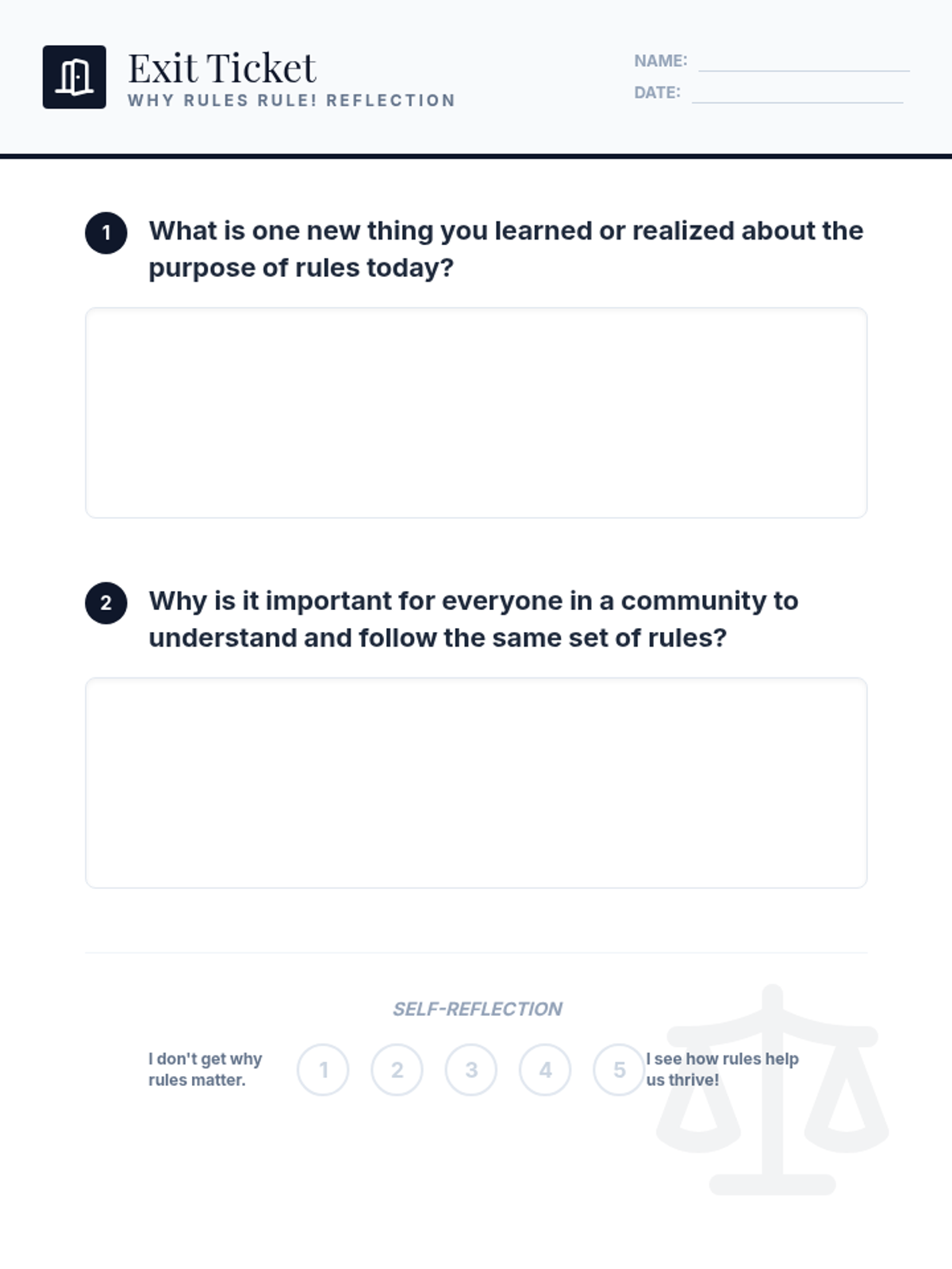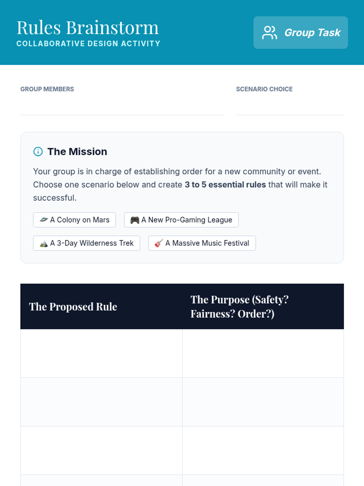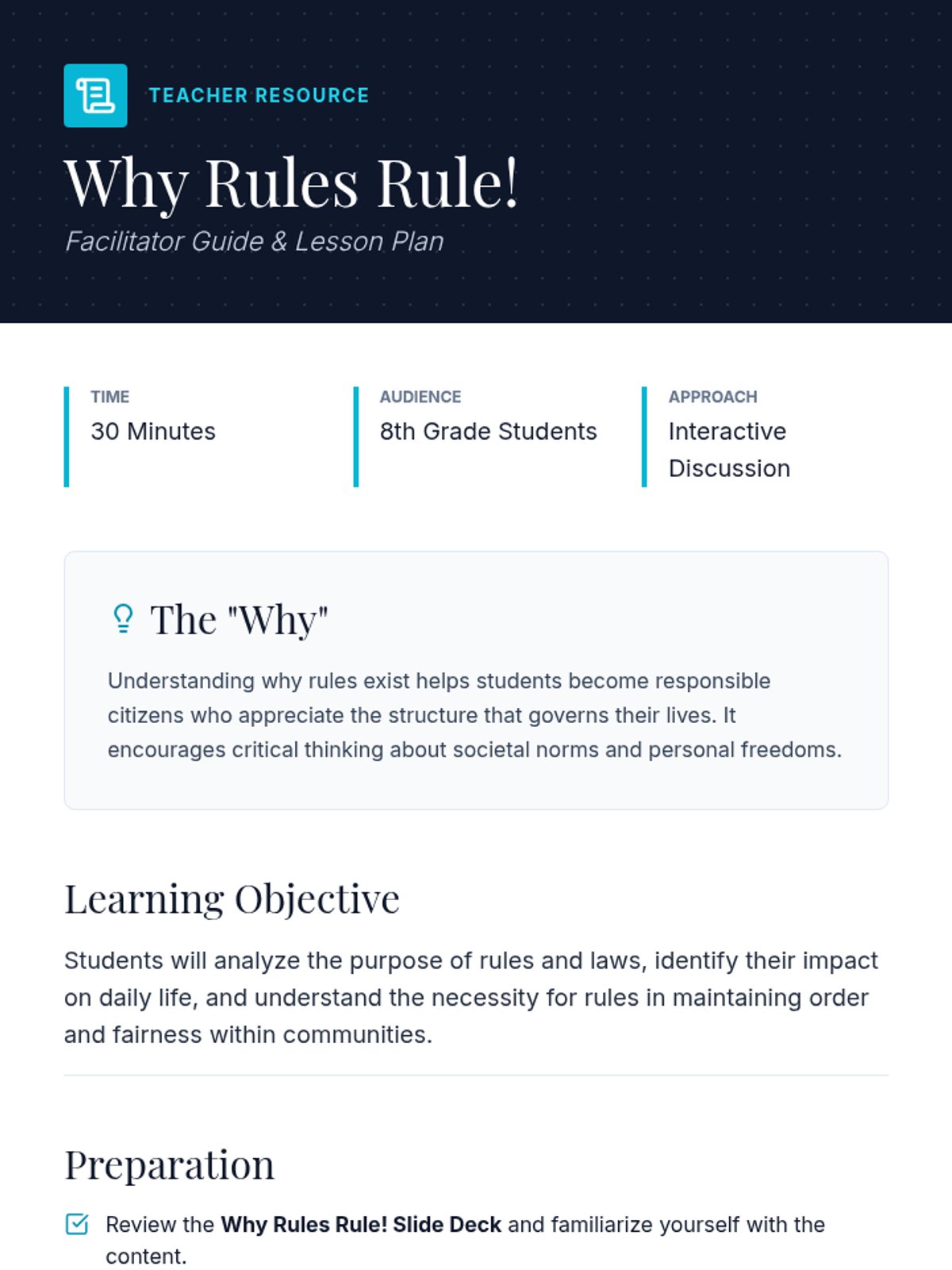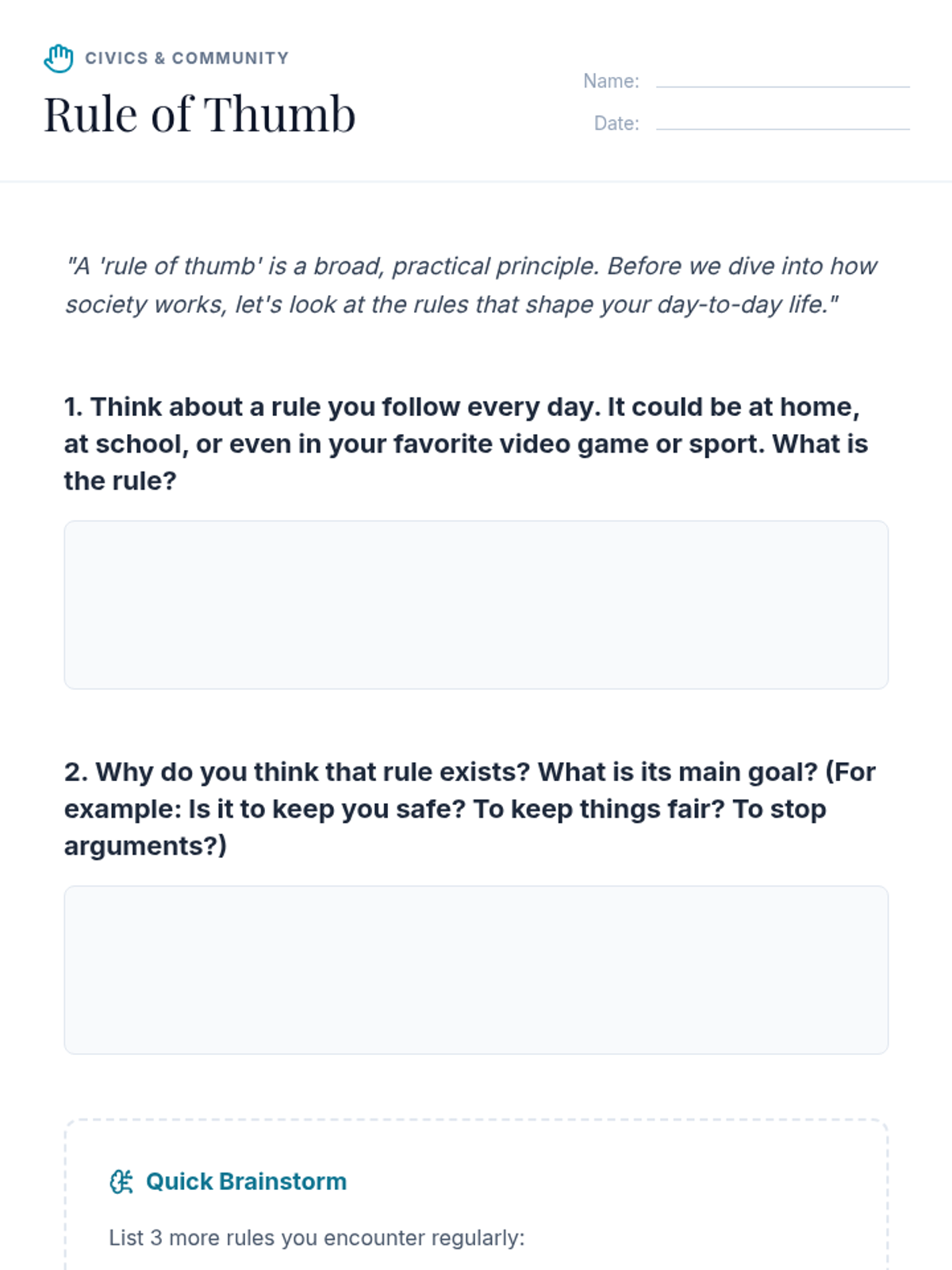 A 30-minute lesson for 8th-grade students exploring the purpose of rules in society, fostering critical thinking about governance and social responsibility through discussion and a collaborative brainstorm activity.