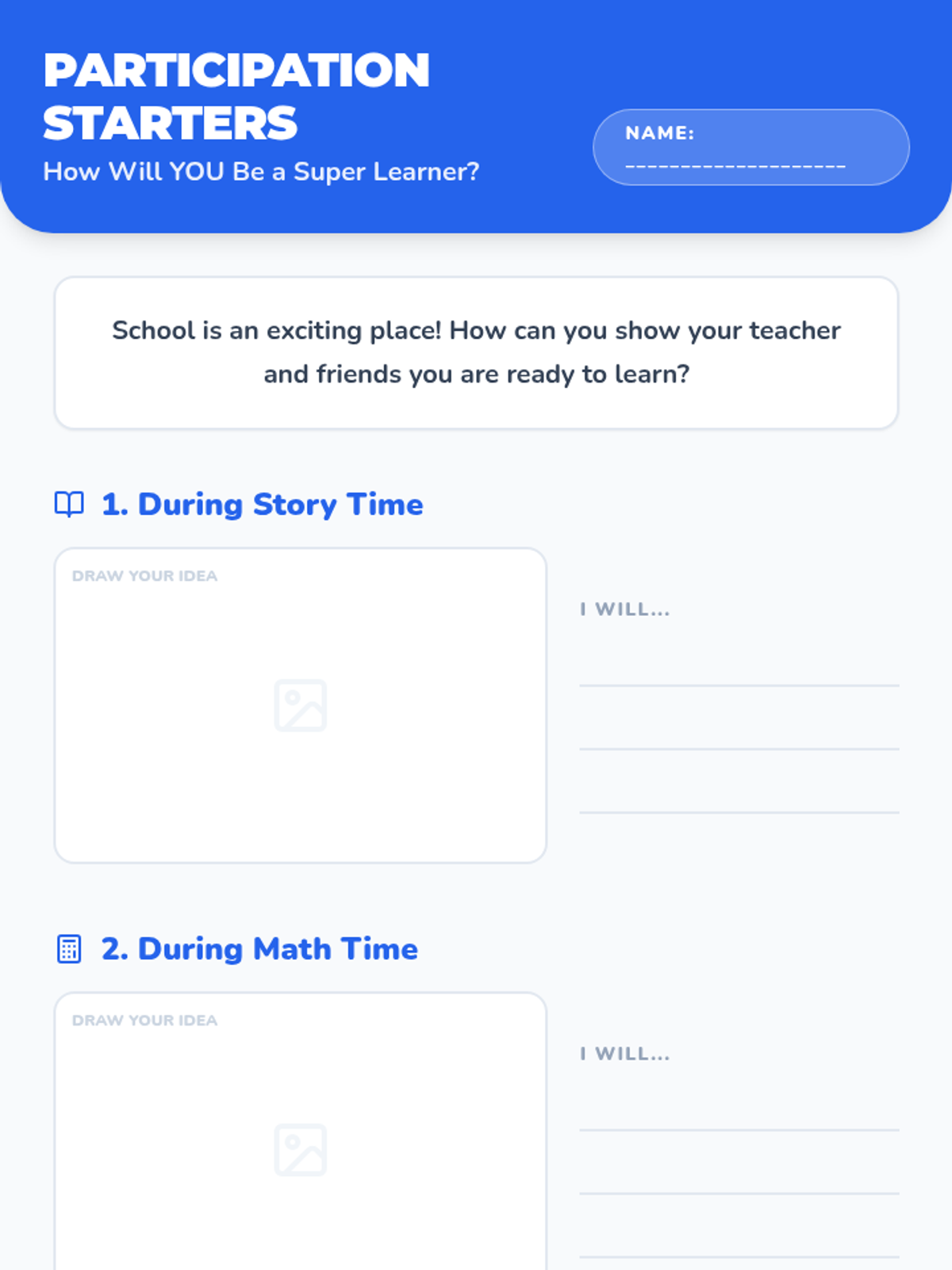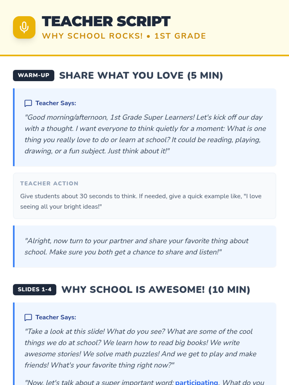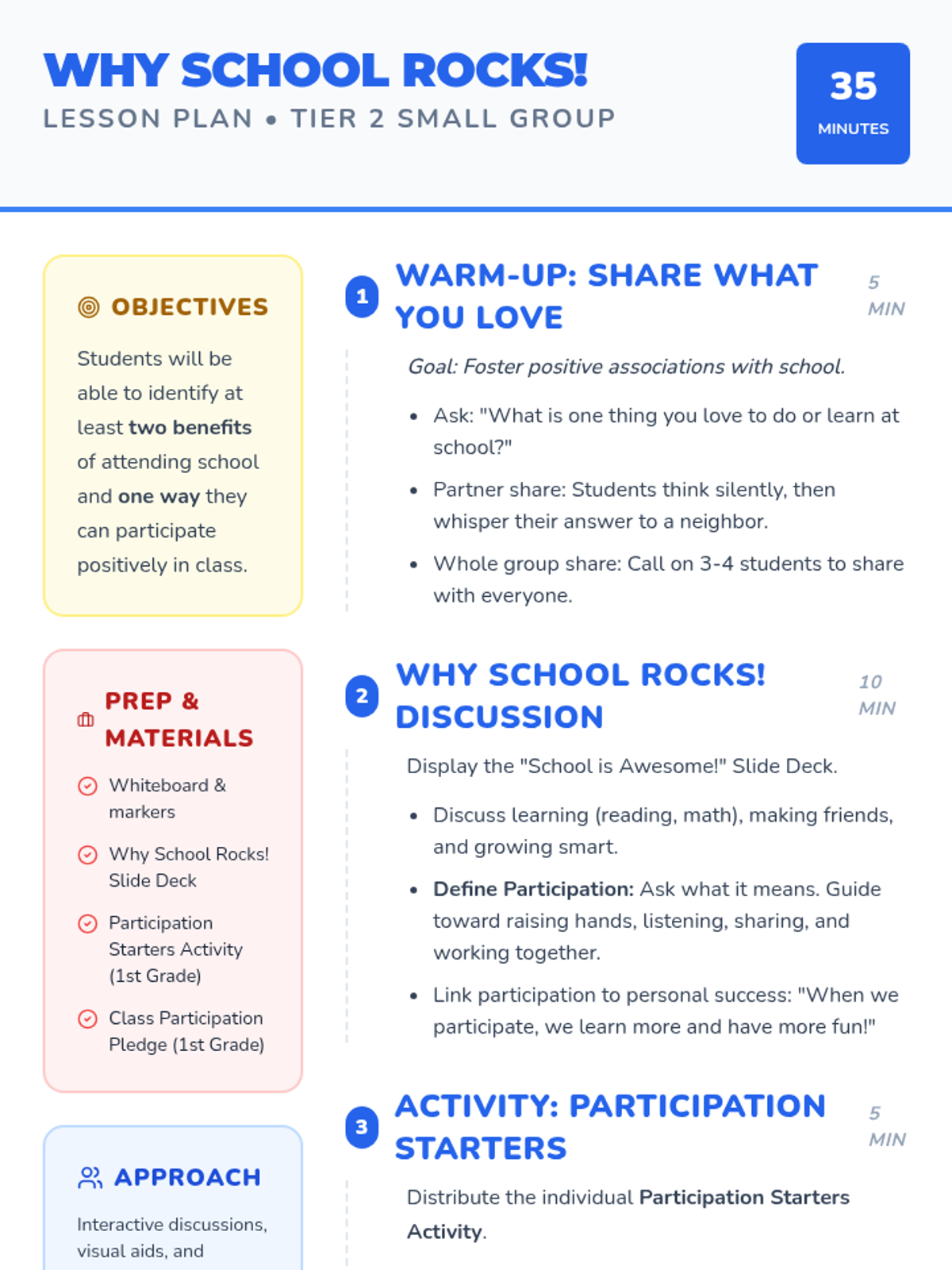 A 35-minute Tier 2 group lesson for 1st-grade students to explore the benefits of school and the power of active participation. Students will identify school benefits and commit to positive participation strategies through discussion and creative activities.
