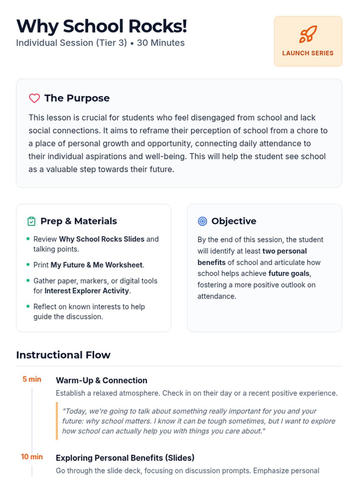 This 30-minute individual lesson for a middle school student on an IEP aims to highlight the personal benefits and opportunities school offers, especially for students with low motivation and few peer connections. It focuses on building intrinsic motivation and exploring future possibilities.