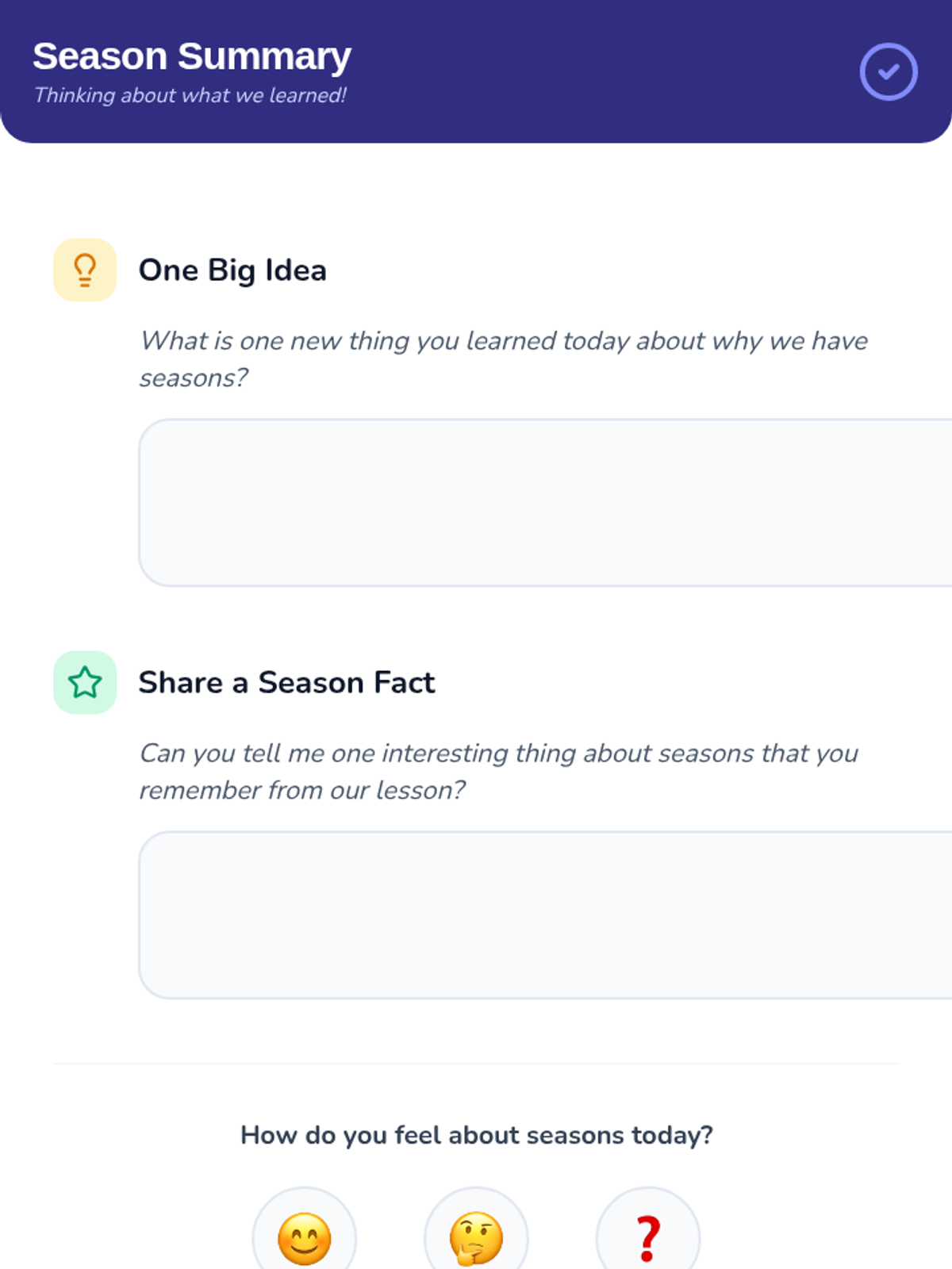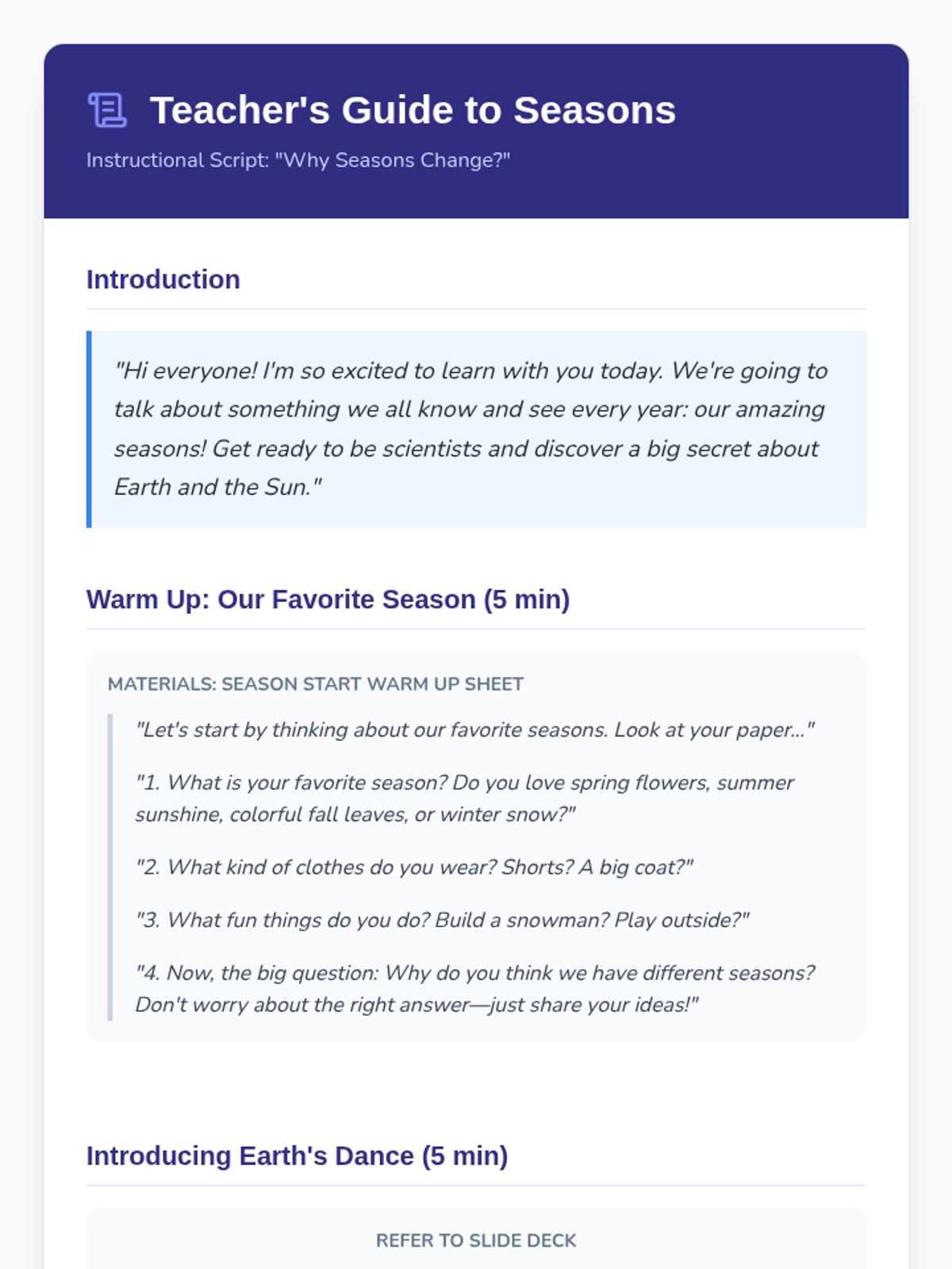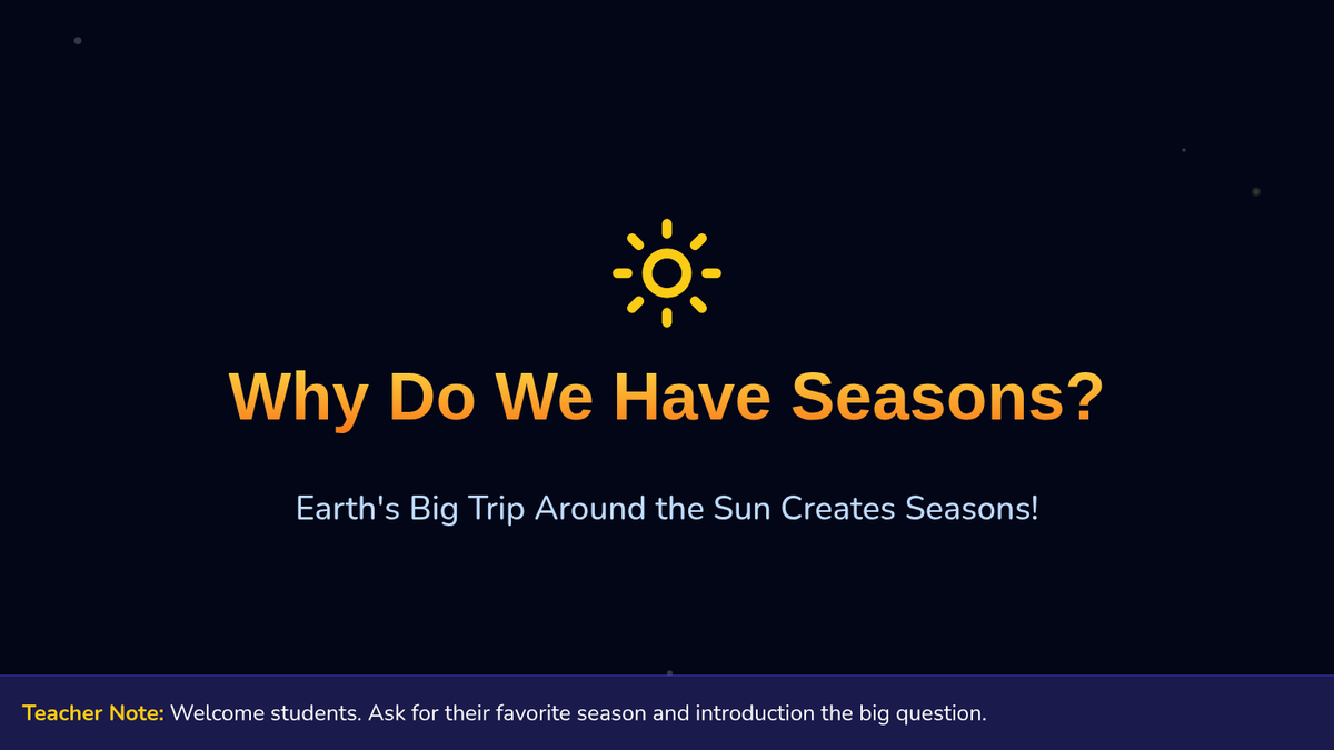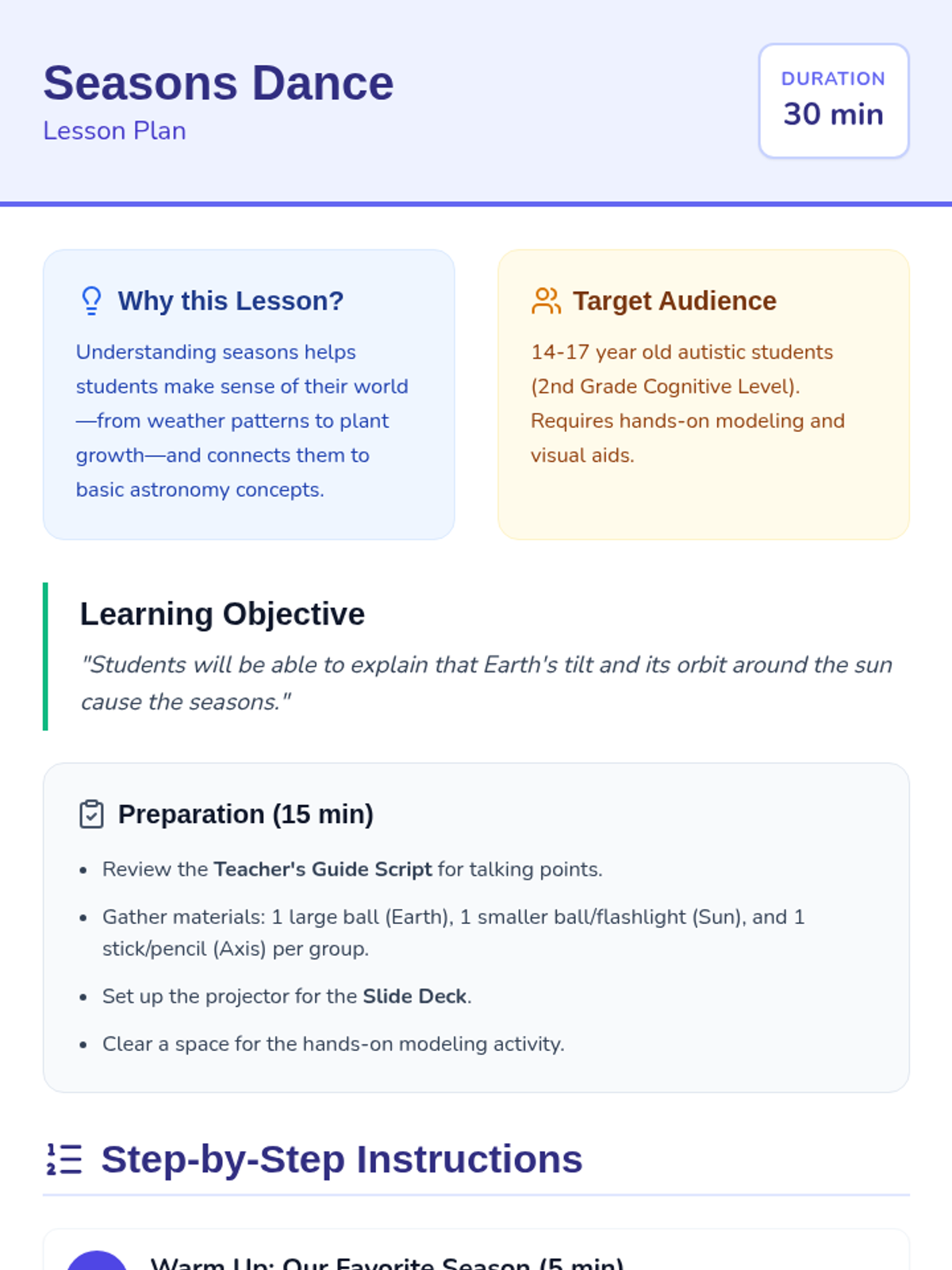 This lesson explores why Earth has seasons using hands-on modeling of Earth's tilt and orbit. It is specifically designed for 14-17 year old autistic students with a 2nd-grade cognitive level, focusing on simple, visual, and tactile explanations.