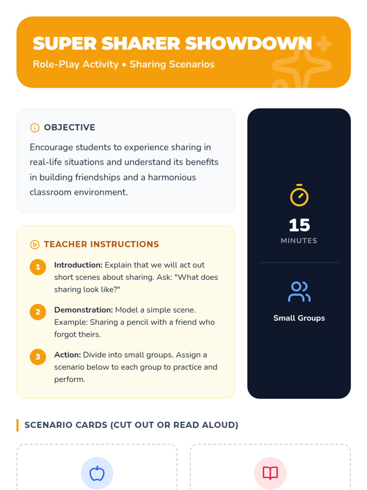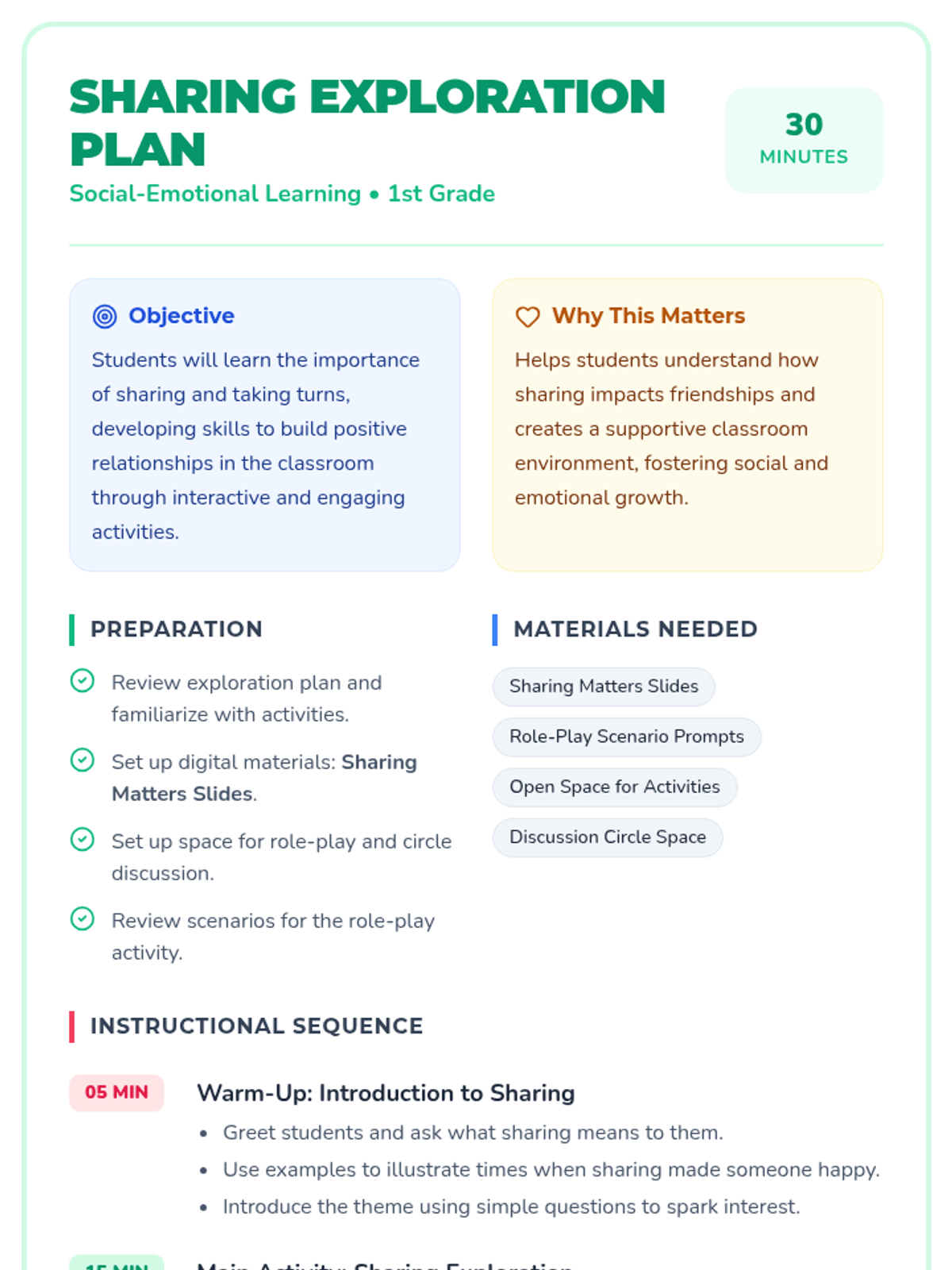 A 1st Grade Tier 1 lesson focused on the social-emotional importance of sharing and turn-taking to build positive classroom relationships.