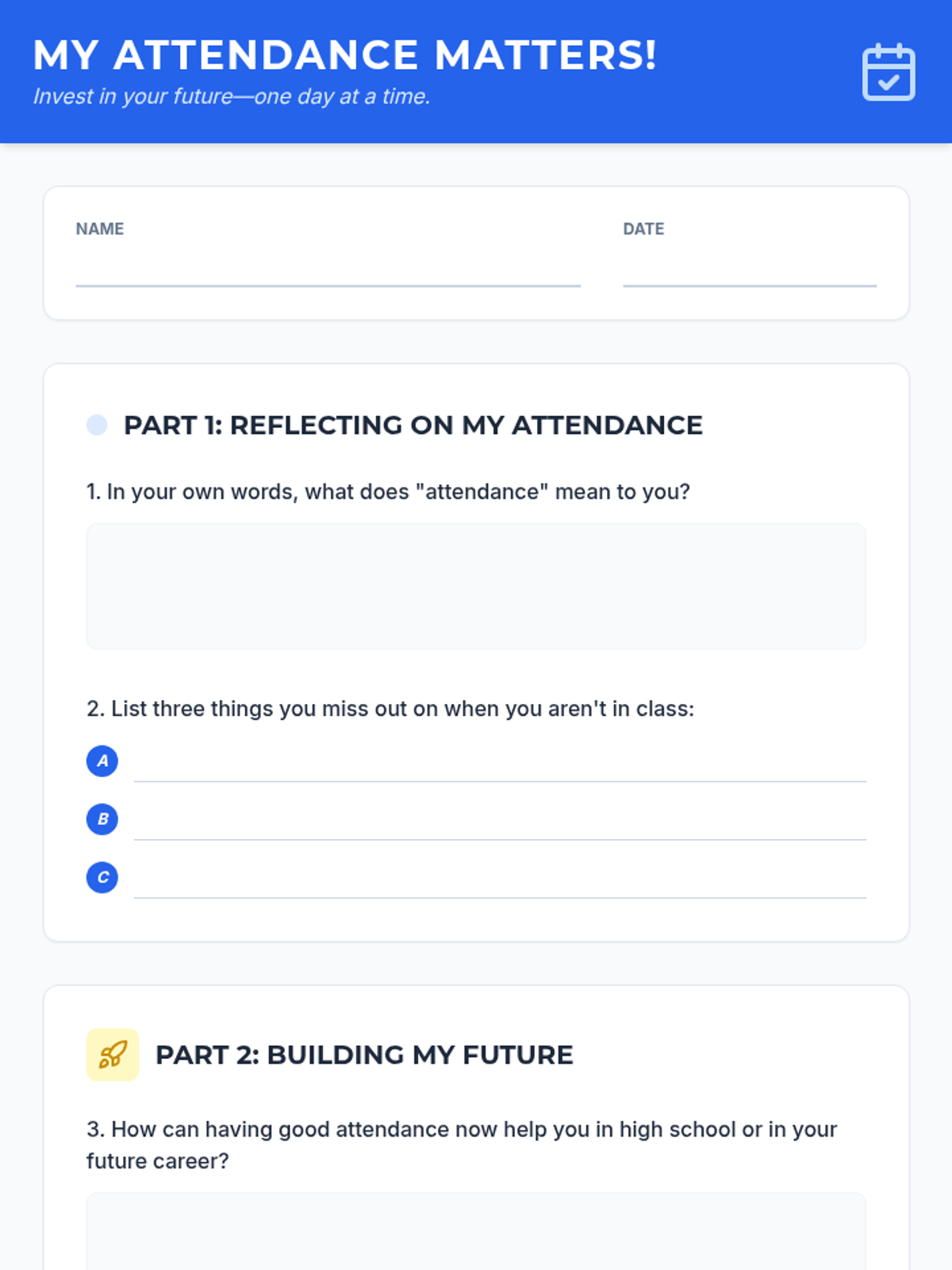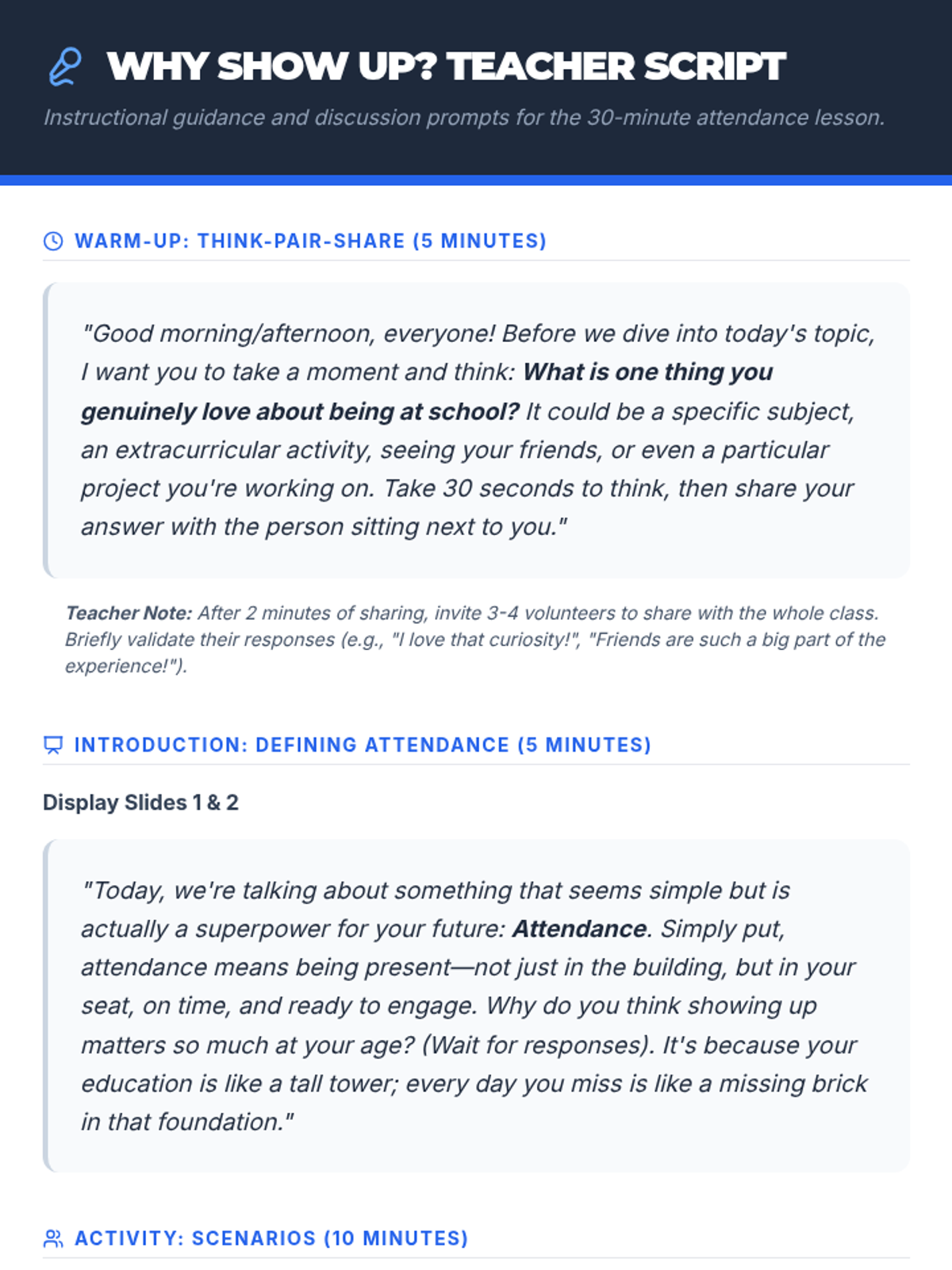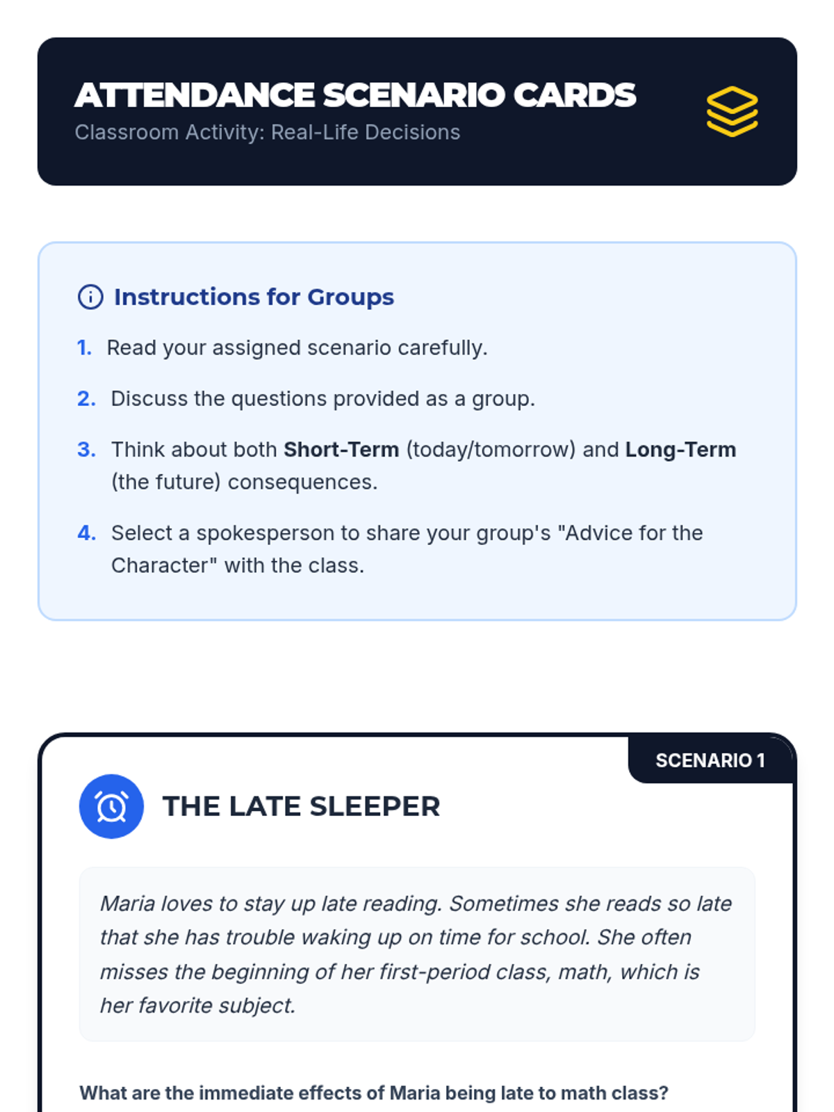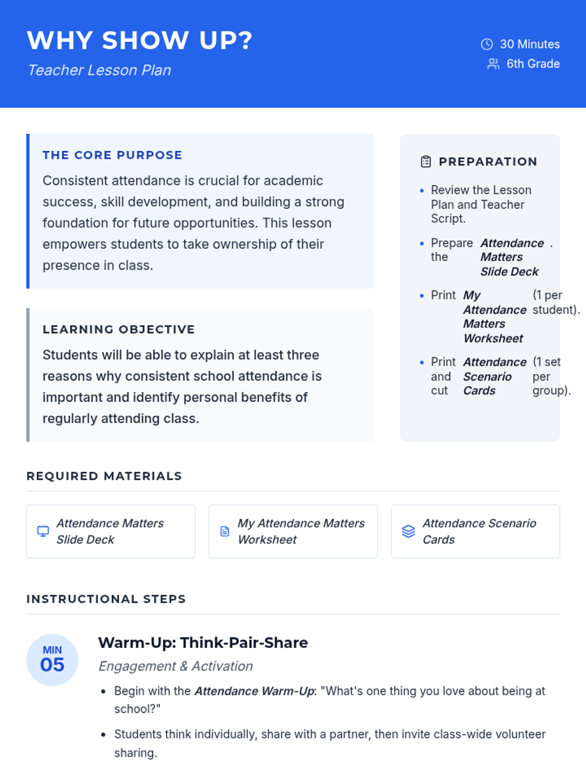 A 30-minute lesson for 6th-grade students exploring the importance of consistent attendance and its impact on learning and future opportunities.