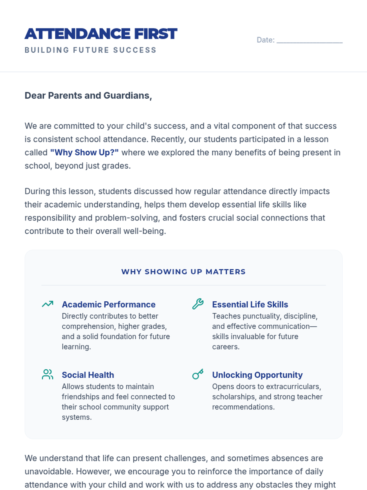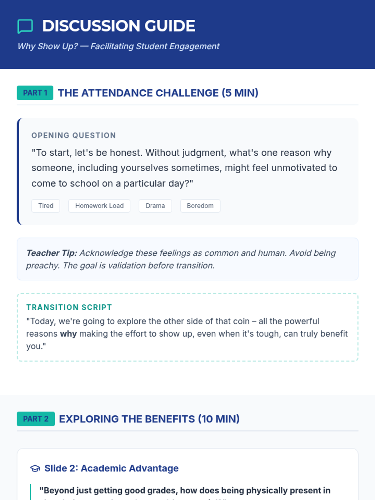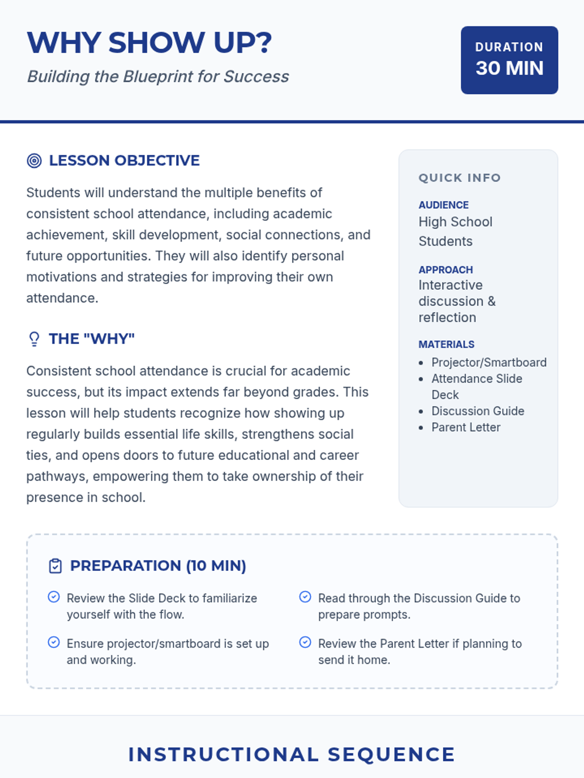 A 30-minute interactive lesson for high schoolers that explores the real-world benefits of consistent school attendance, from academic success to future career opportunities and social well-being.