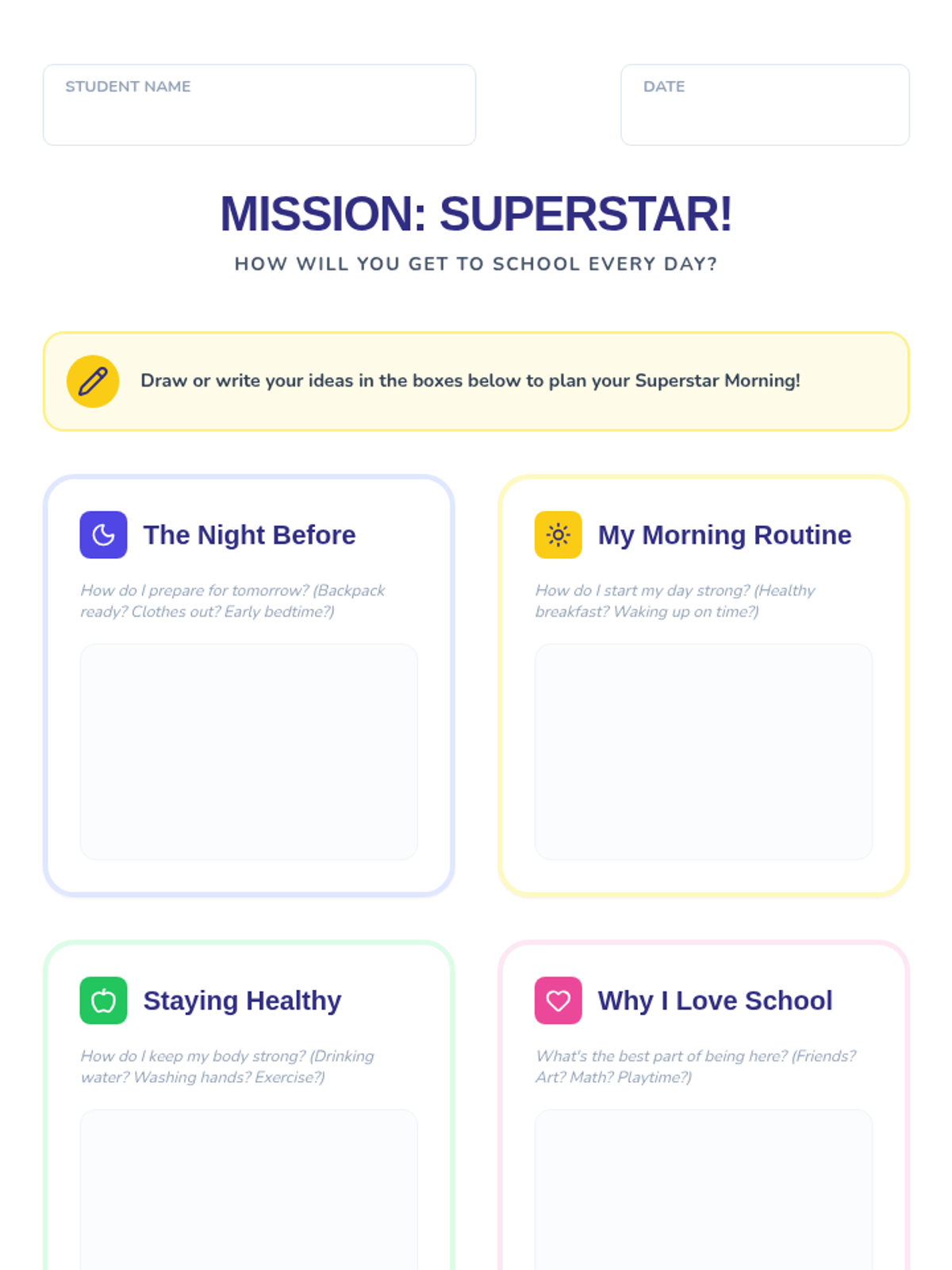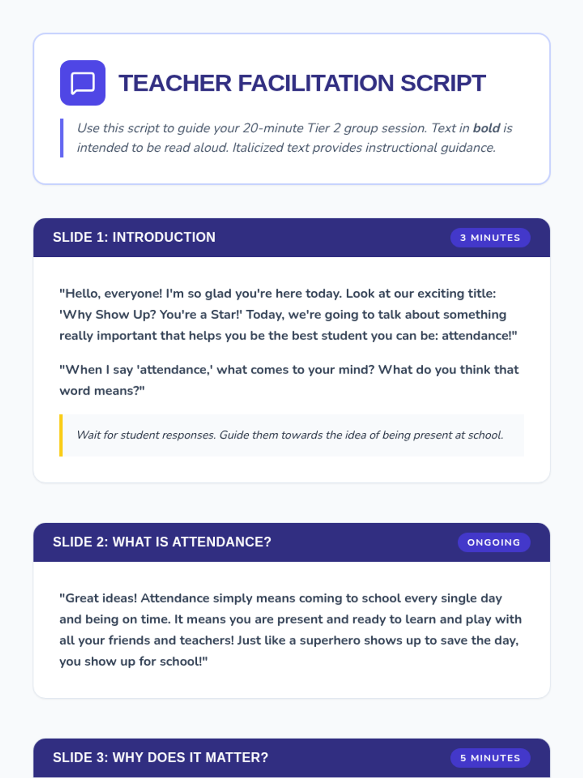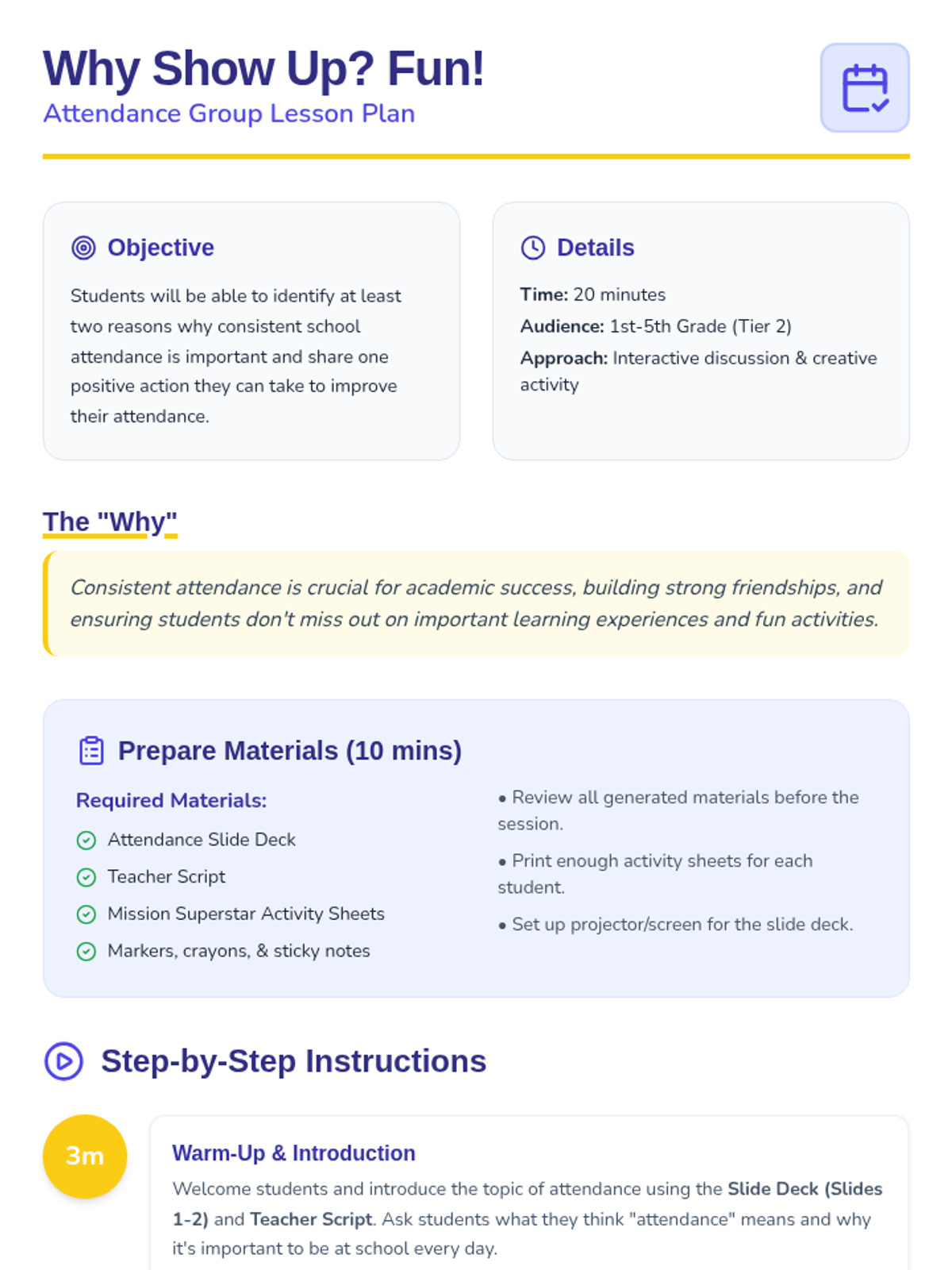 A 20-minute Tier 2 group session for 1st-5th graders focusing on the importance of regular school attendance through a 'Superstar' theme. Students explore the benefits of being at school and set personal goals for readiness.