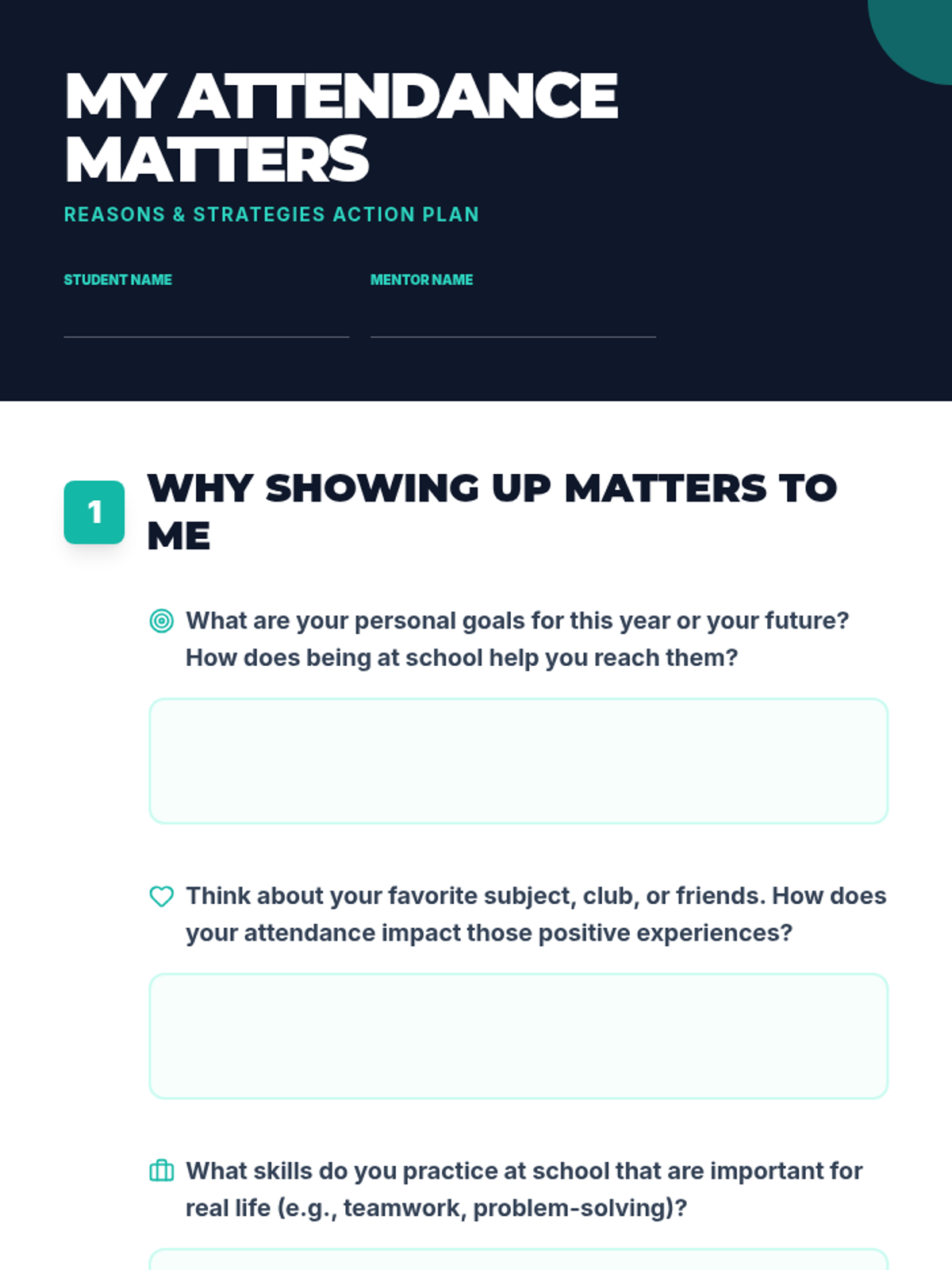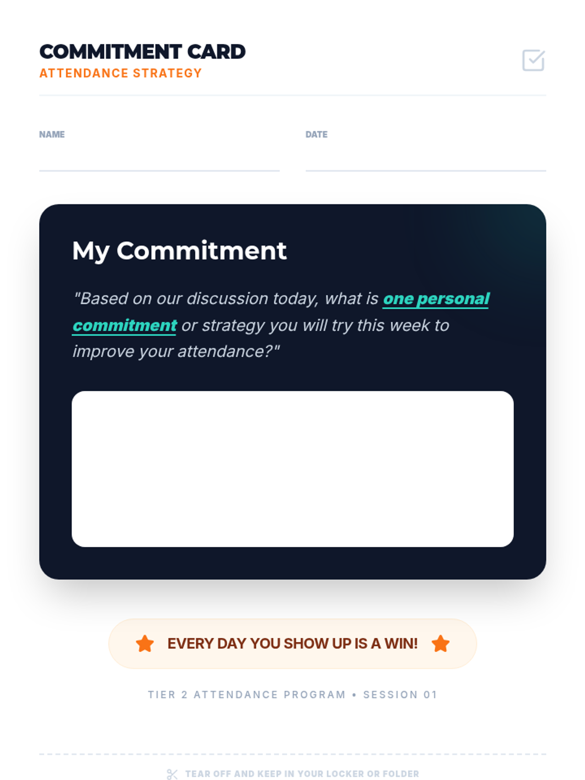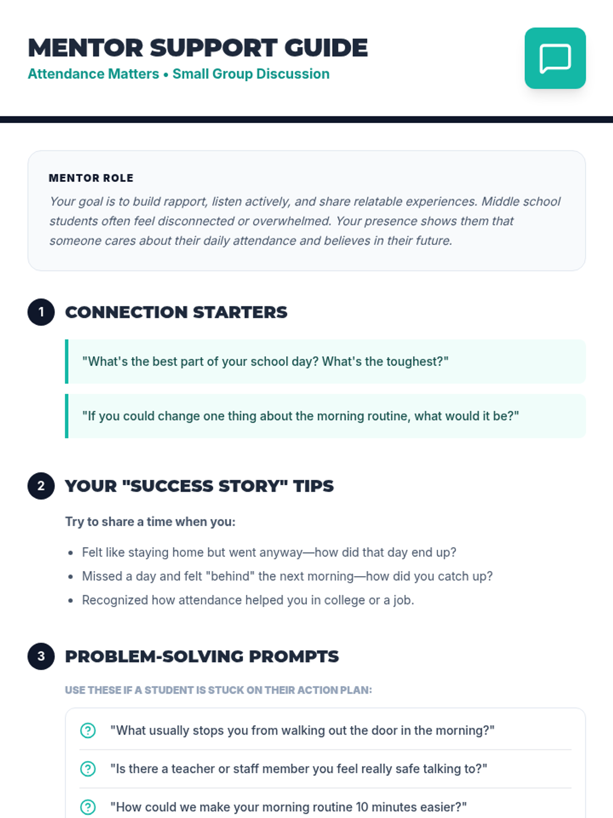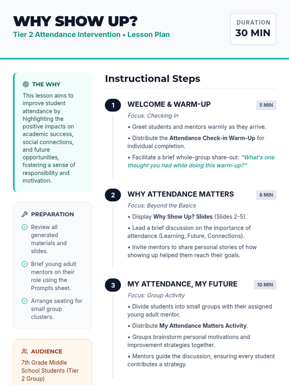 A Tier 2 intervention lesson for 7th graders focused on the importance of school attendance, featuring mentor-led discussions and personal action planning.