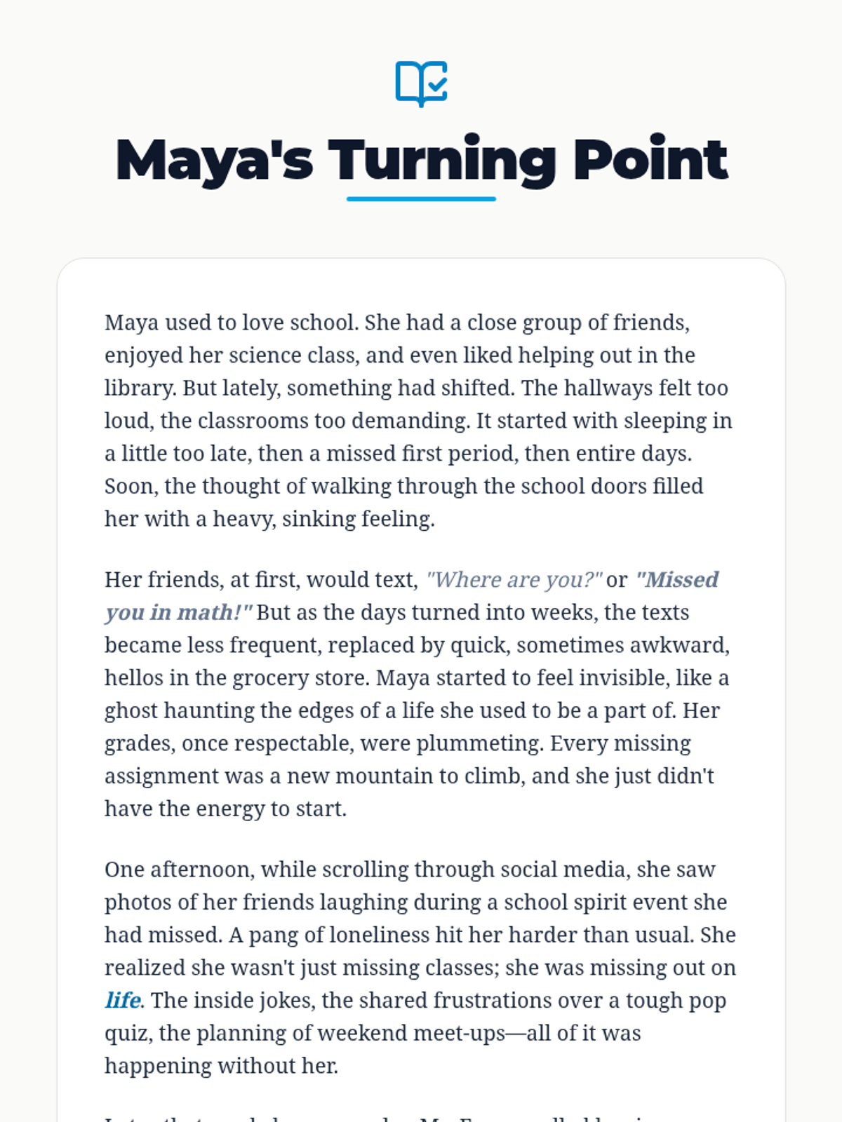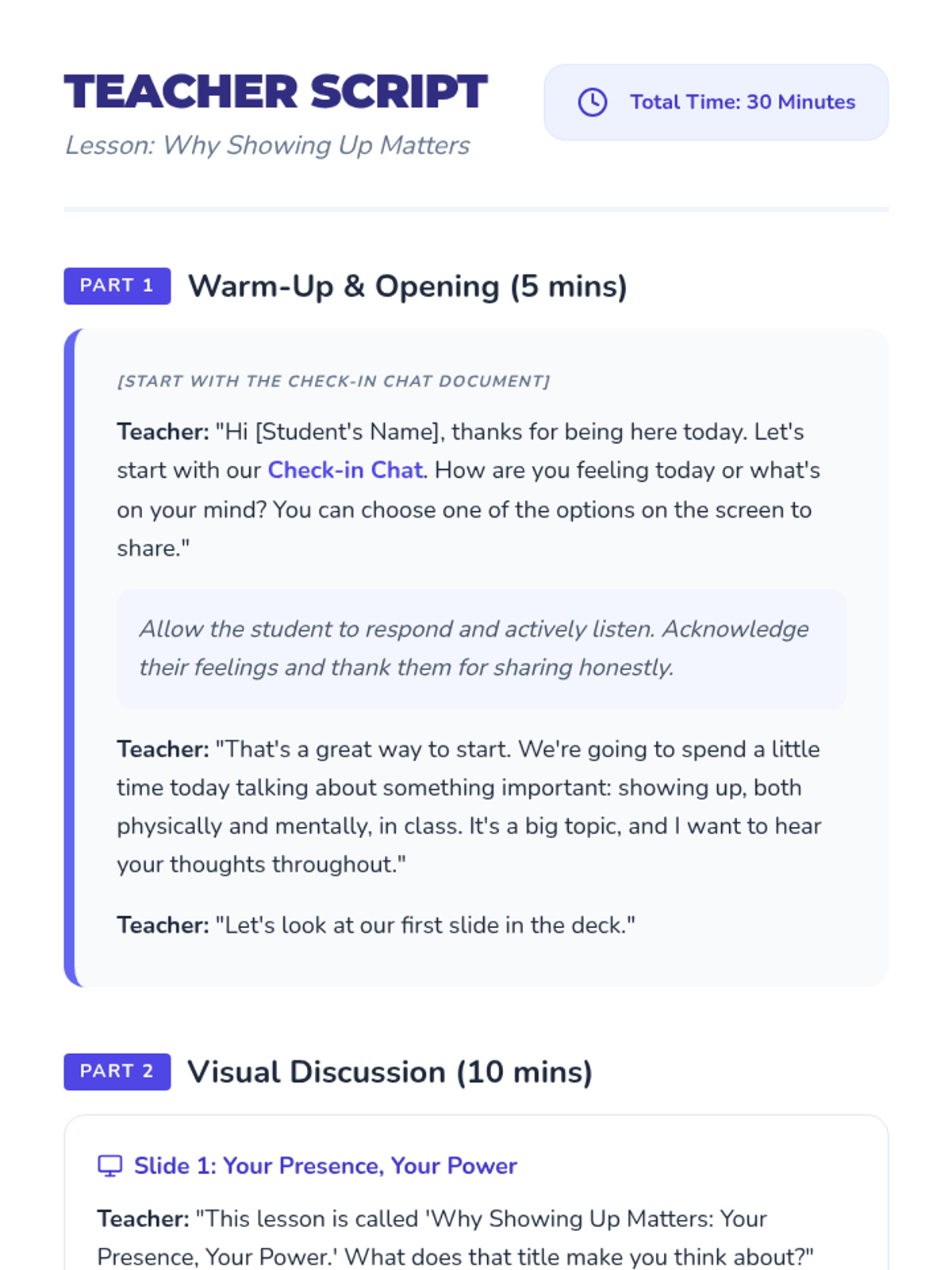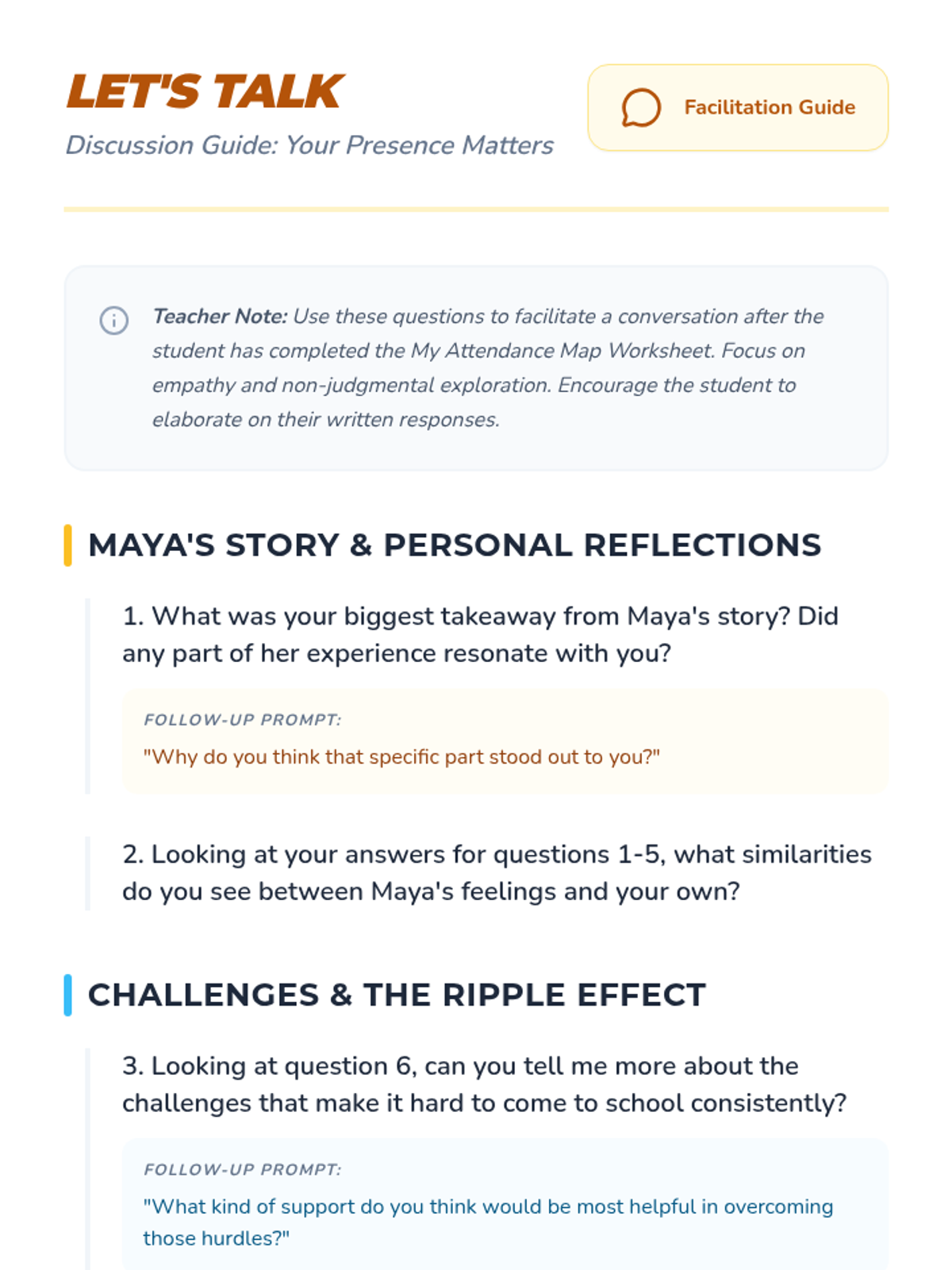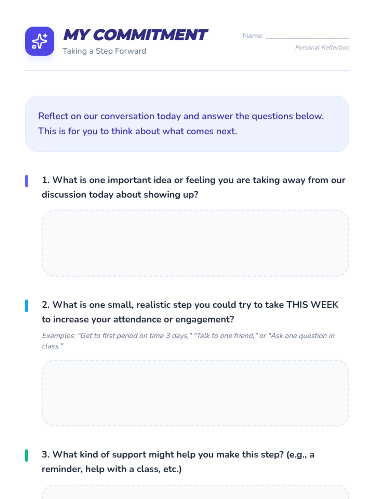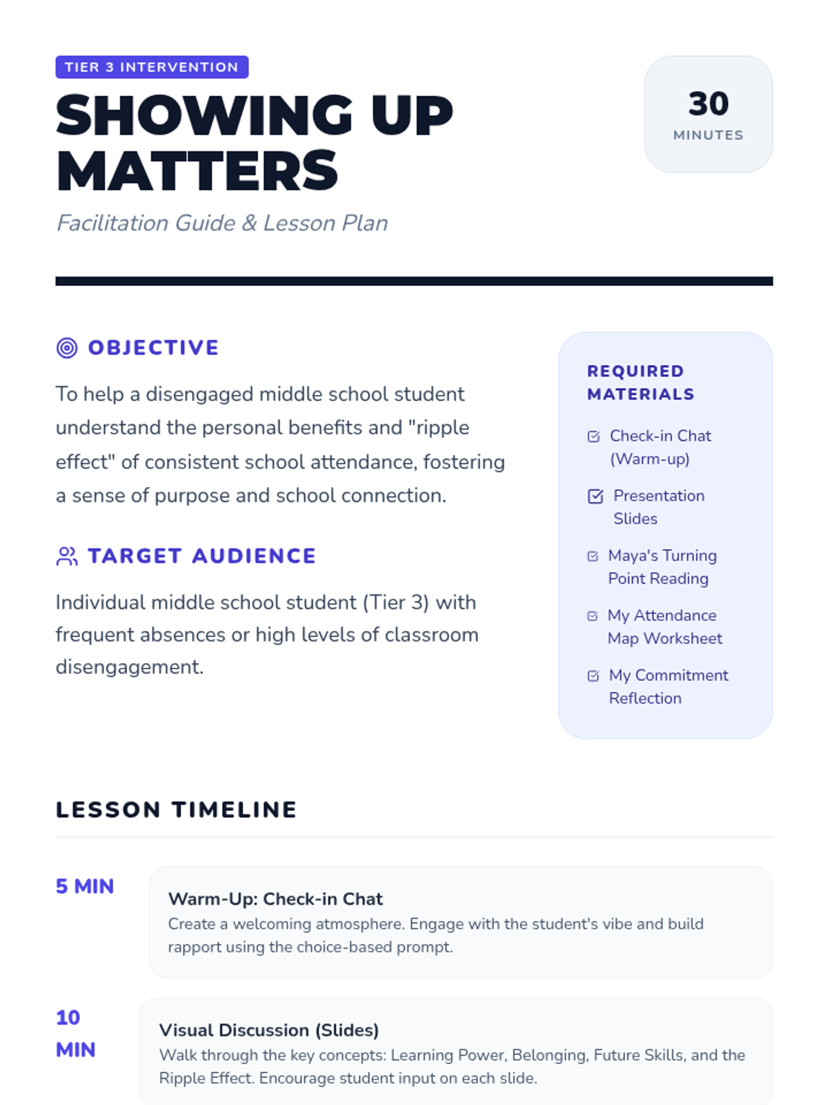 A Tier 3 individual intervention lesson for disengaged middle school students, focusing on the personal benefits and broader impact of school attendance through guided discussion and reflection.