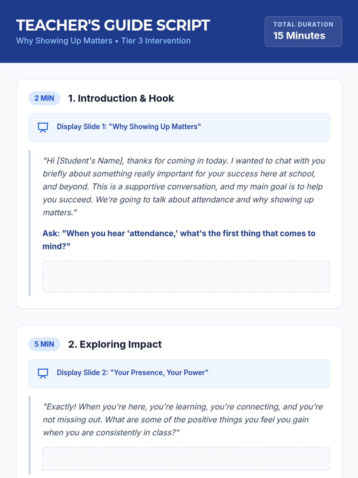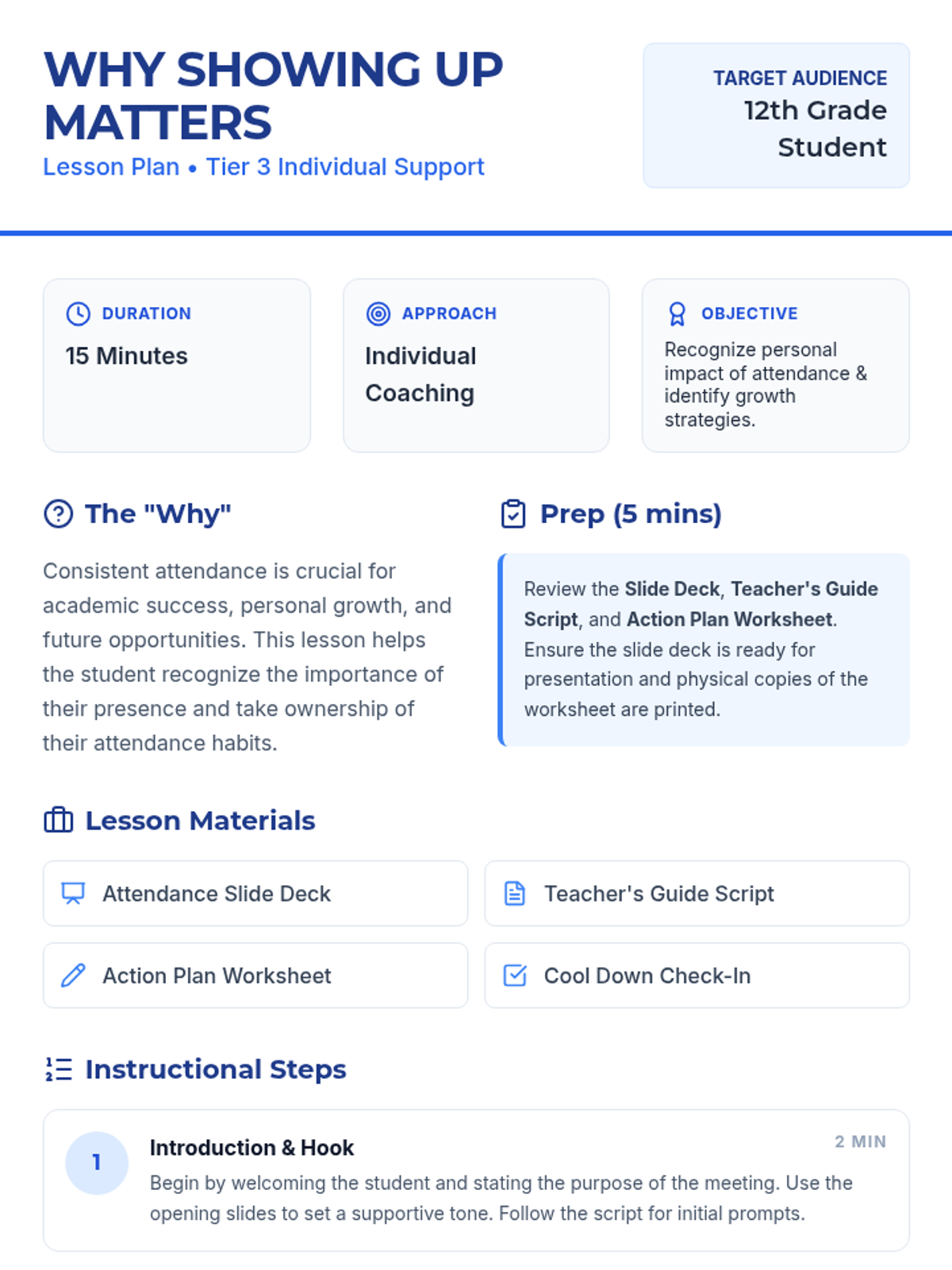 This 15-minute Tier 3 lesson is designed for individual 12th-grade students struggling with poor attendance. It focuses on the personal and academic impacts of consistent attendance, aiming to motivate students to improve their presence in class through collaborative problem-solving and action planning.
