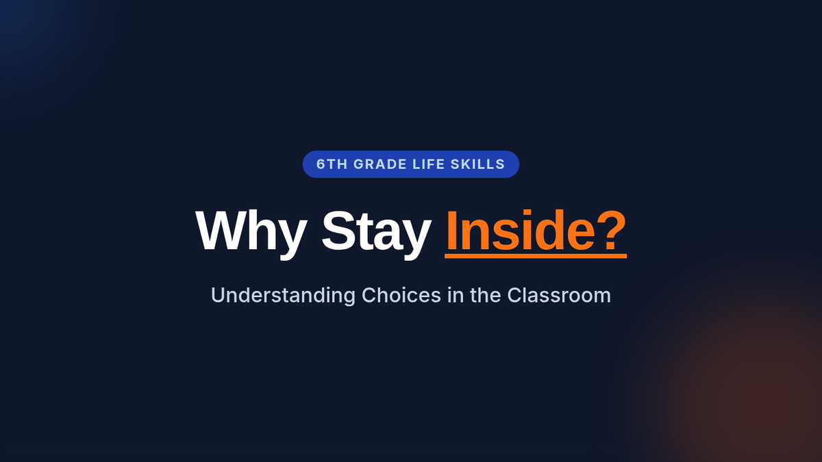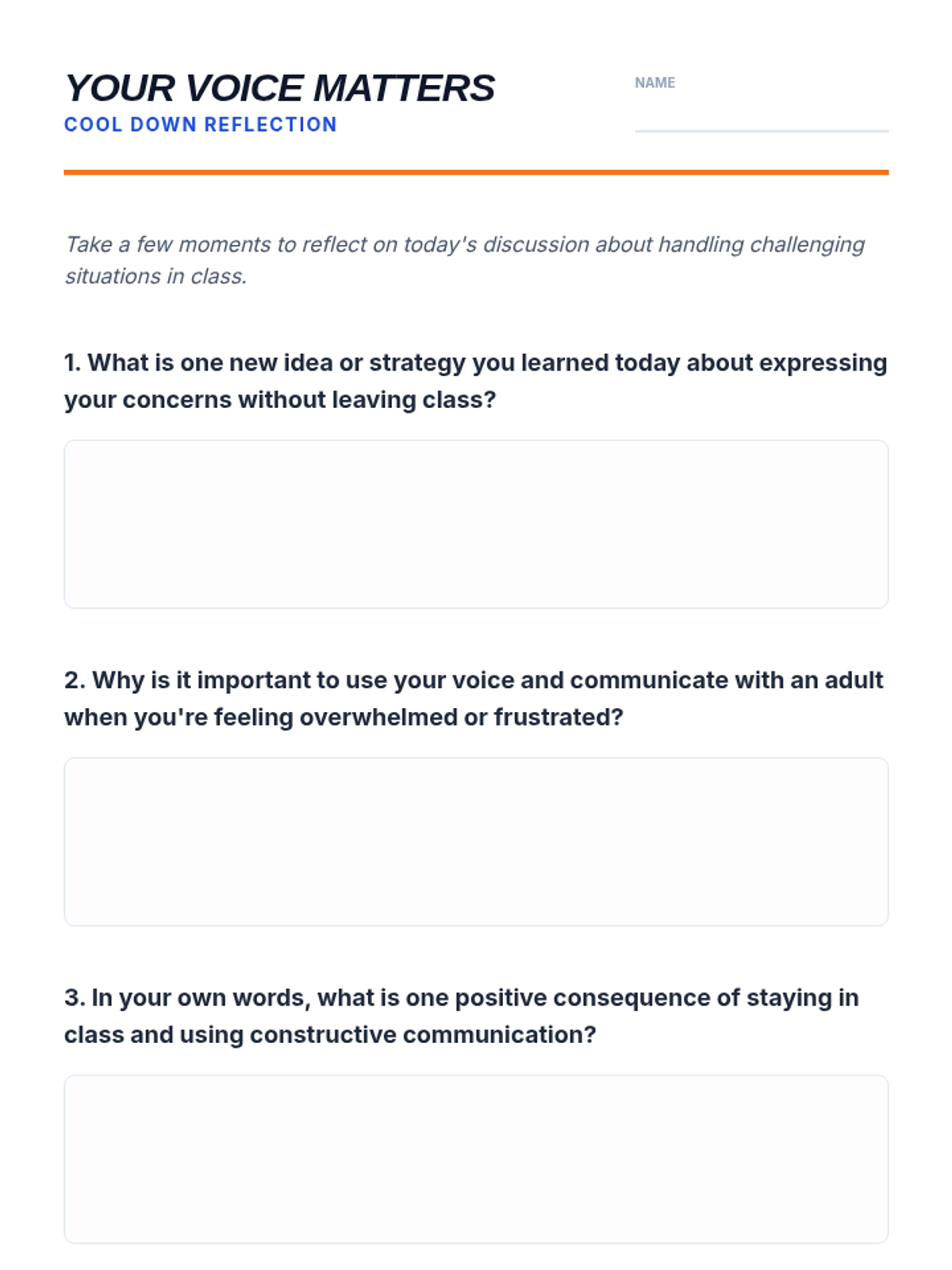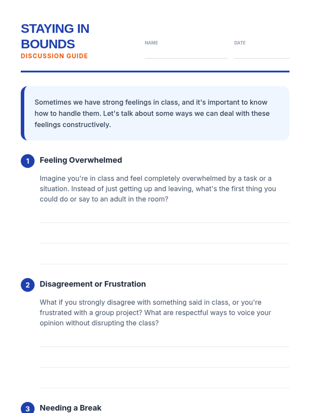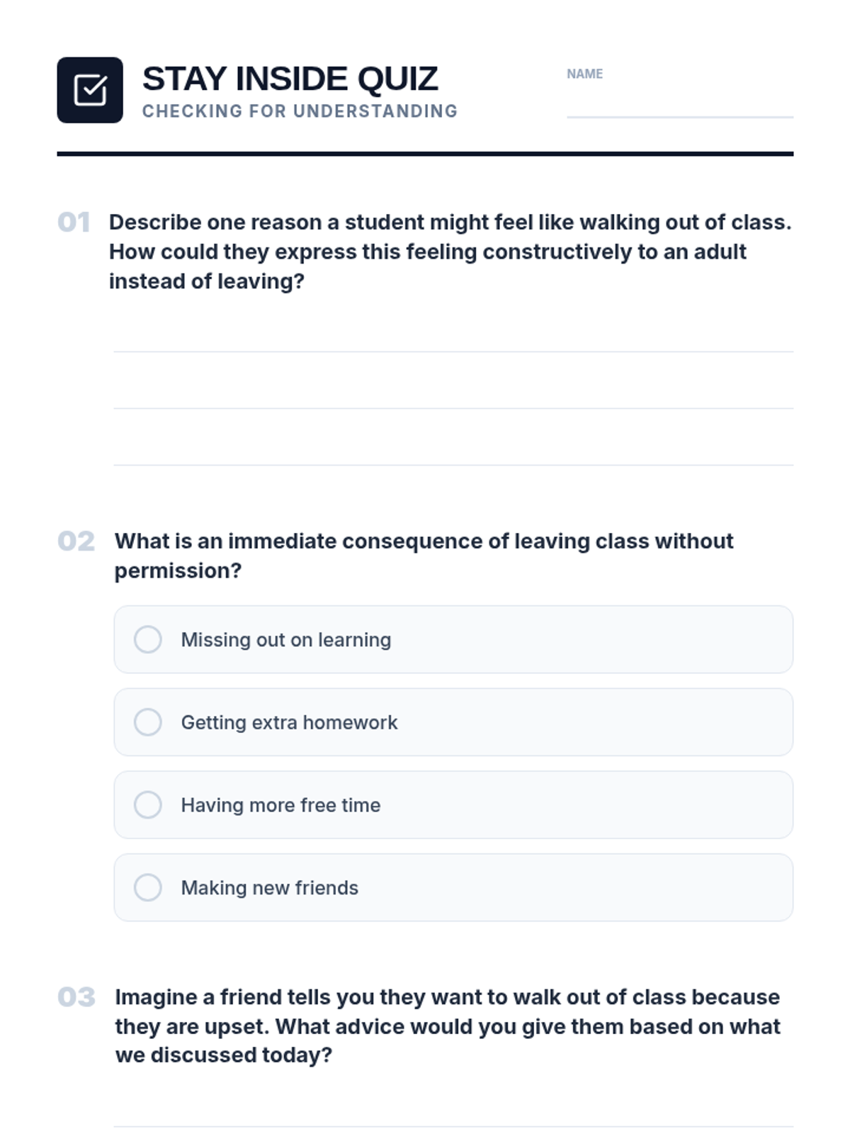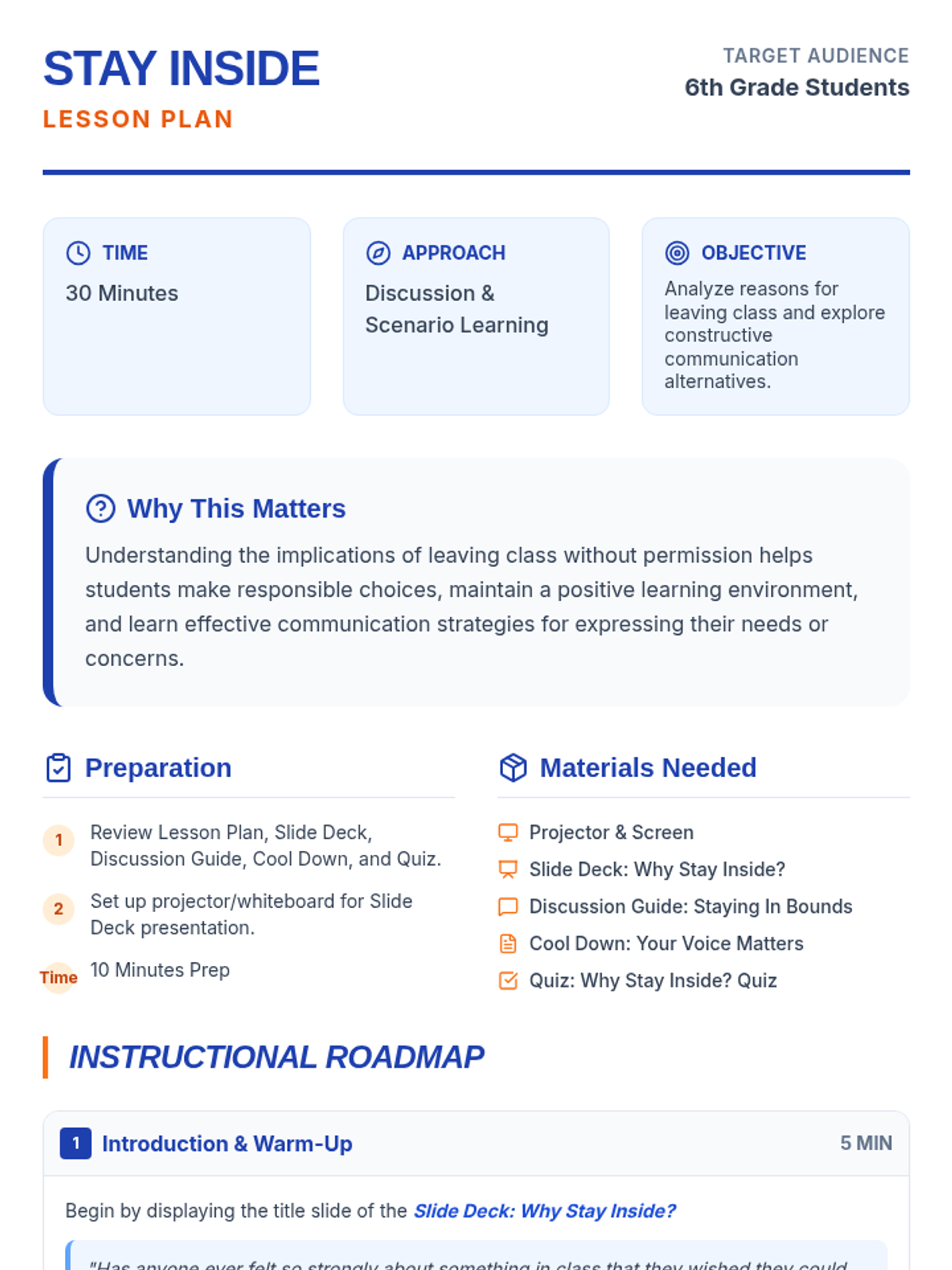 A 30-minute lesson for 6th graders exploring the reasons for walking out of class, the consequences of doing so, and constructive communication strategies to address feelings of frustration or being overwhelmed.