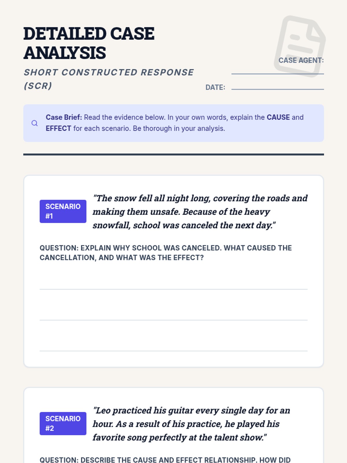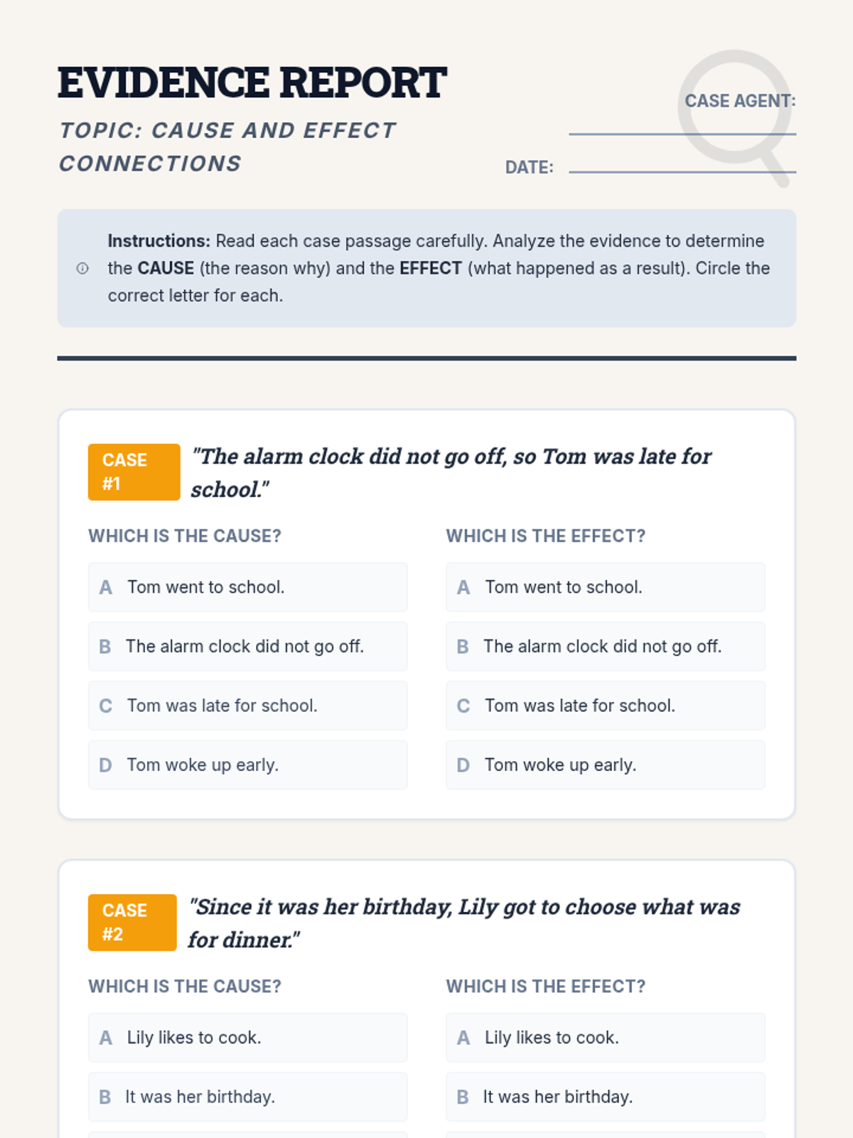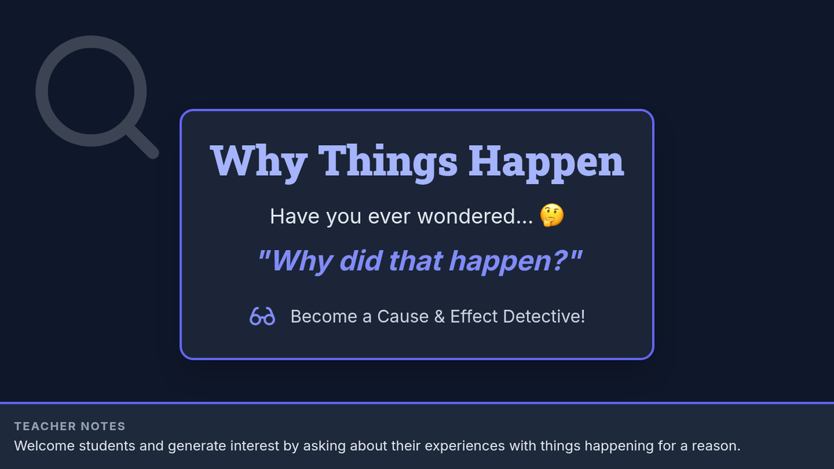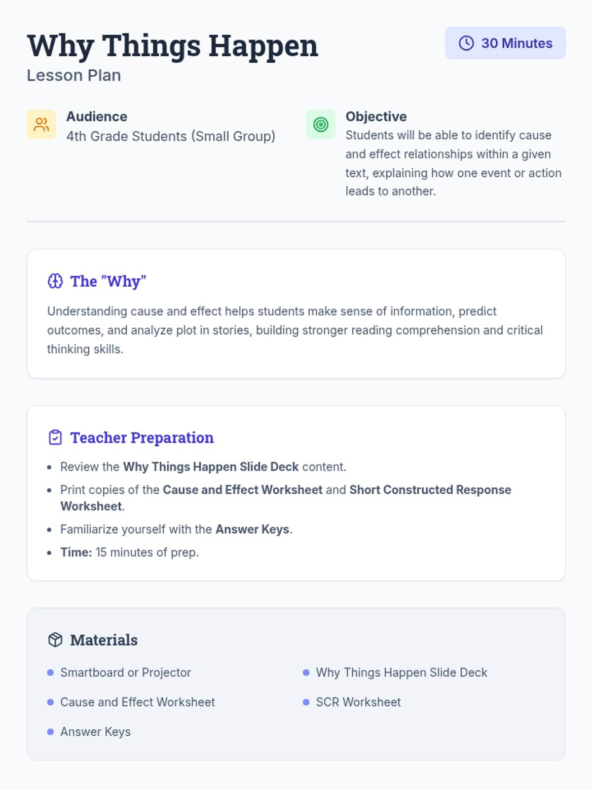 This 30-minute small group lesson helps 4th-grade students master cause and effect relationships through a 'detective' lens. Students will identify keywords, analyze short passages, and practice writing their own explanations of how actions lead to outcomes.