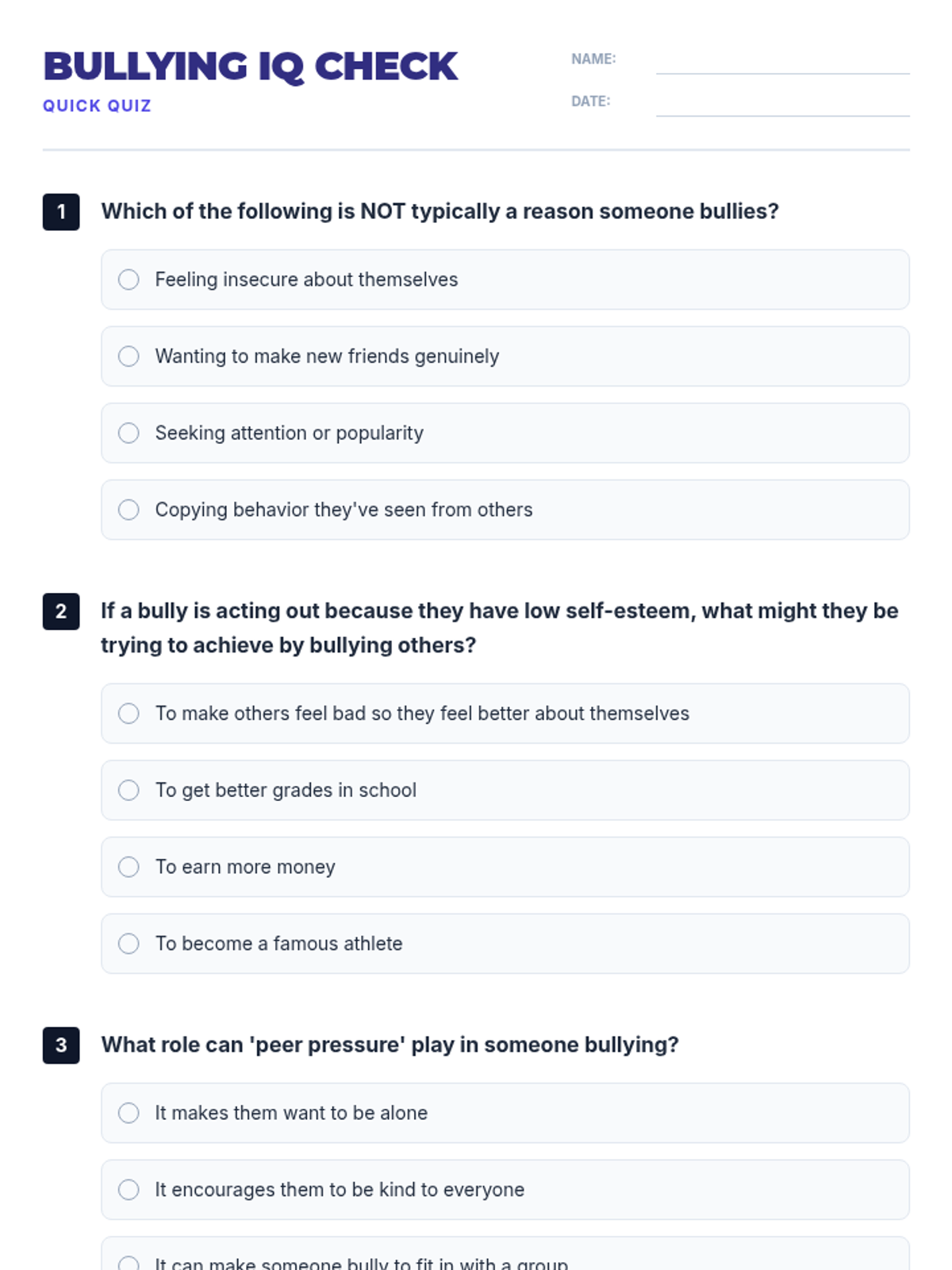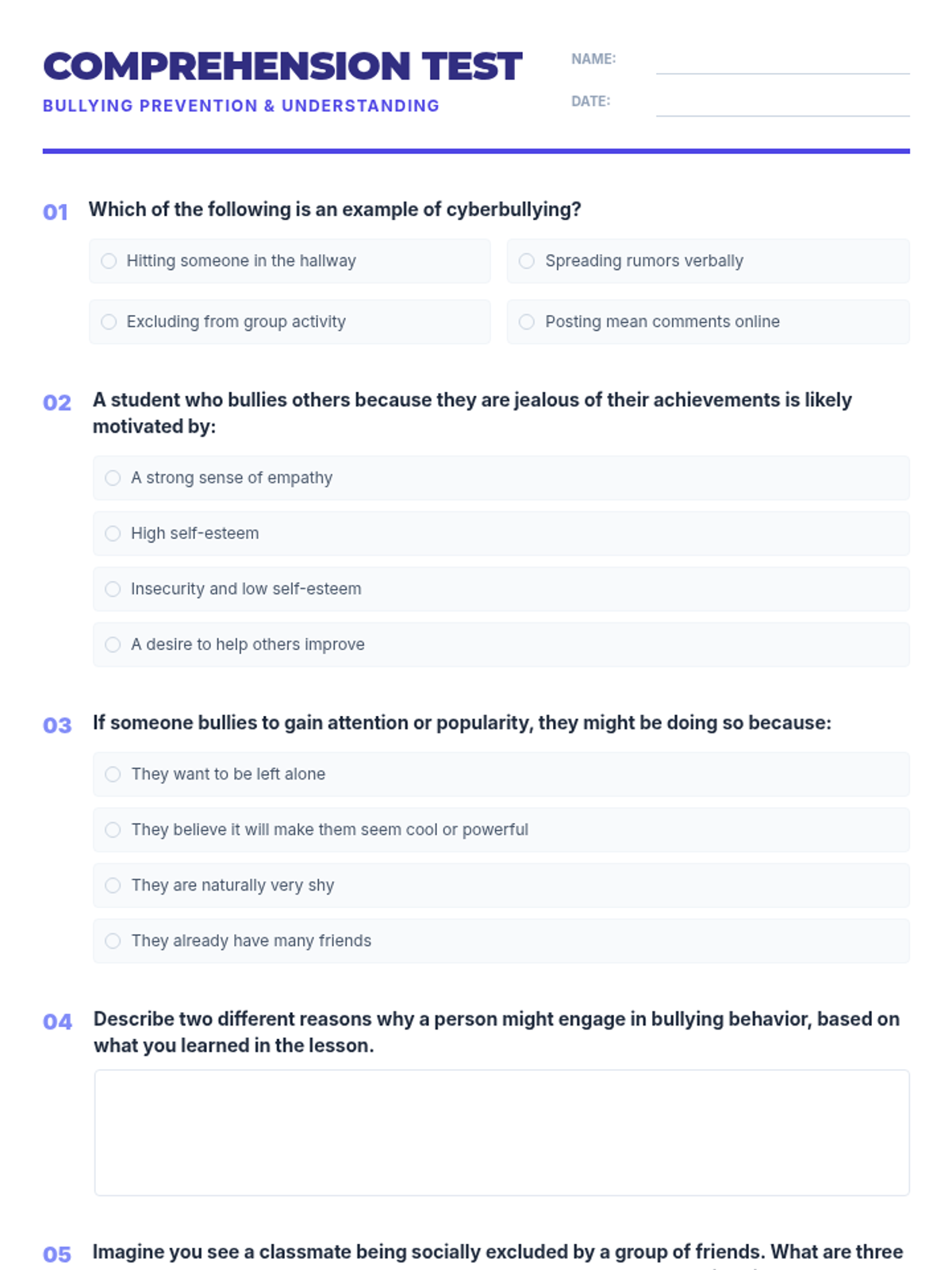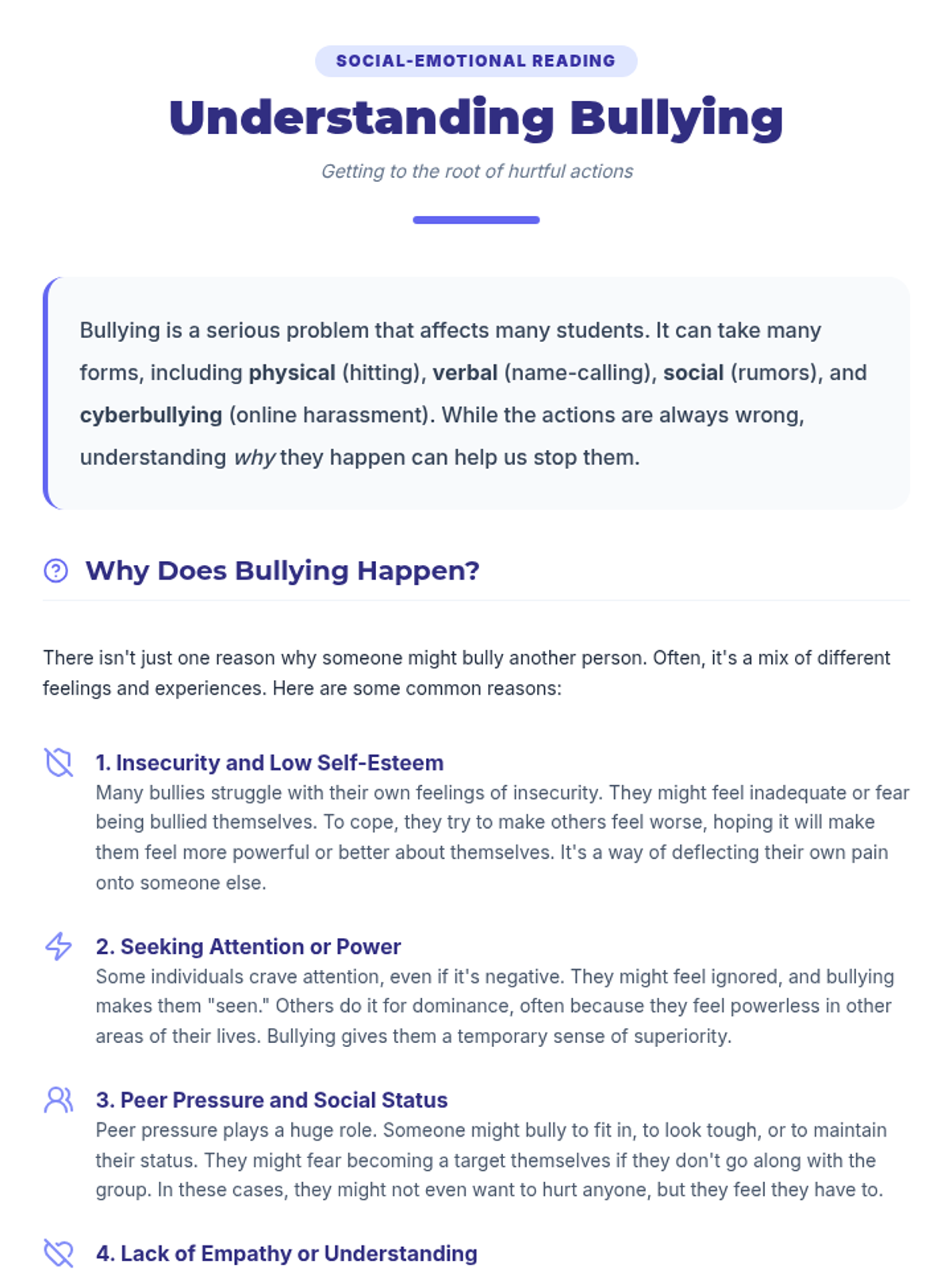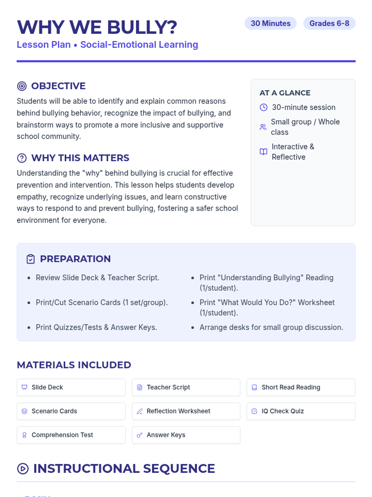 This lesson explores the complex reasons behind bullying behavior, helping middle school students develop empathy and understanding. By examining common triggers and motivations, students will learn to identify bullying dynamics and foster a more inclusive environment.