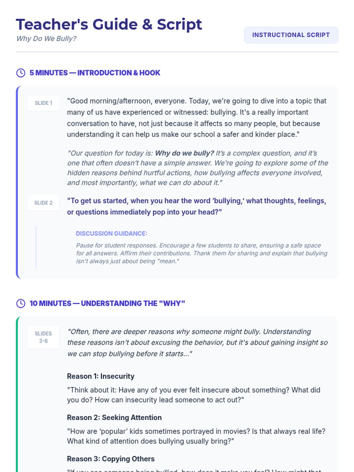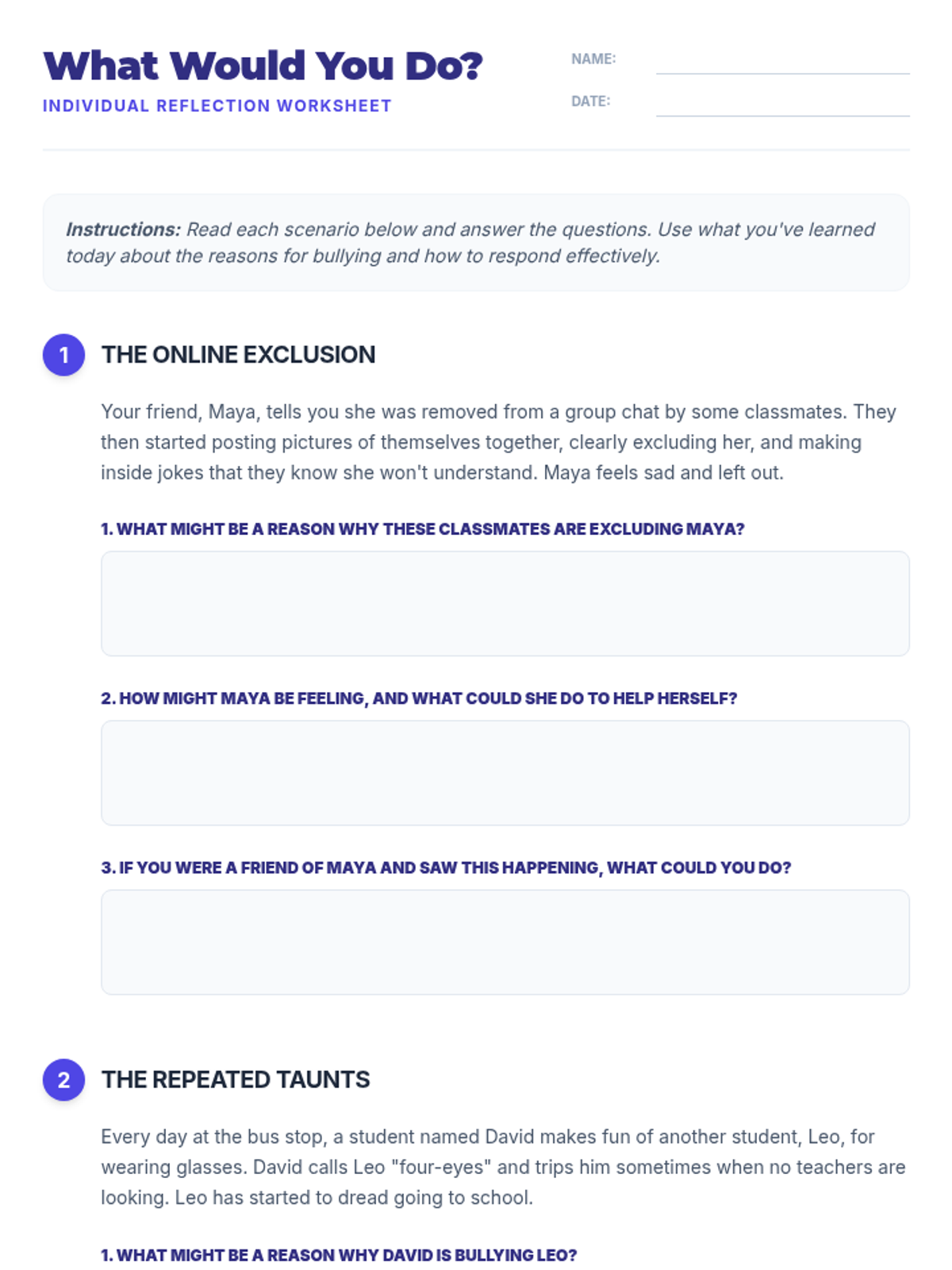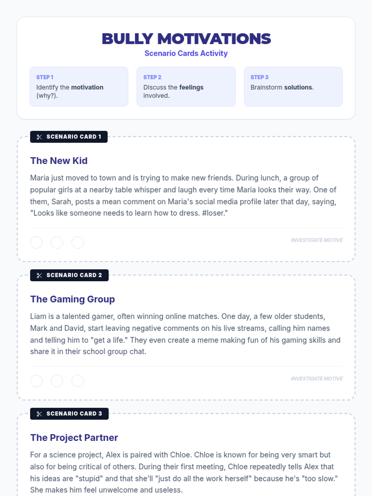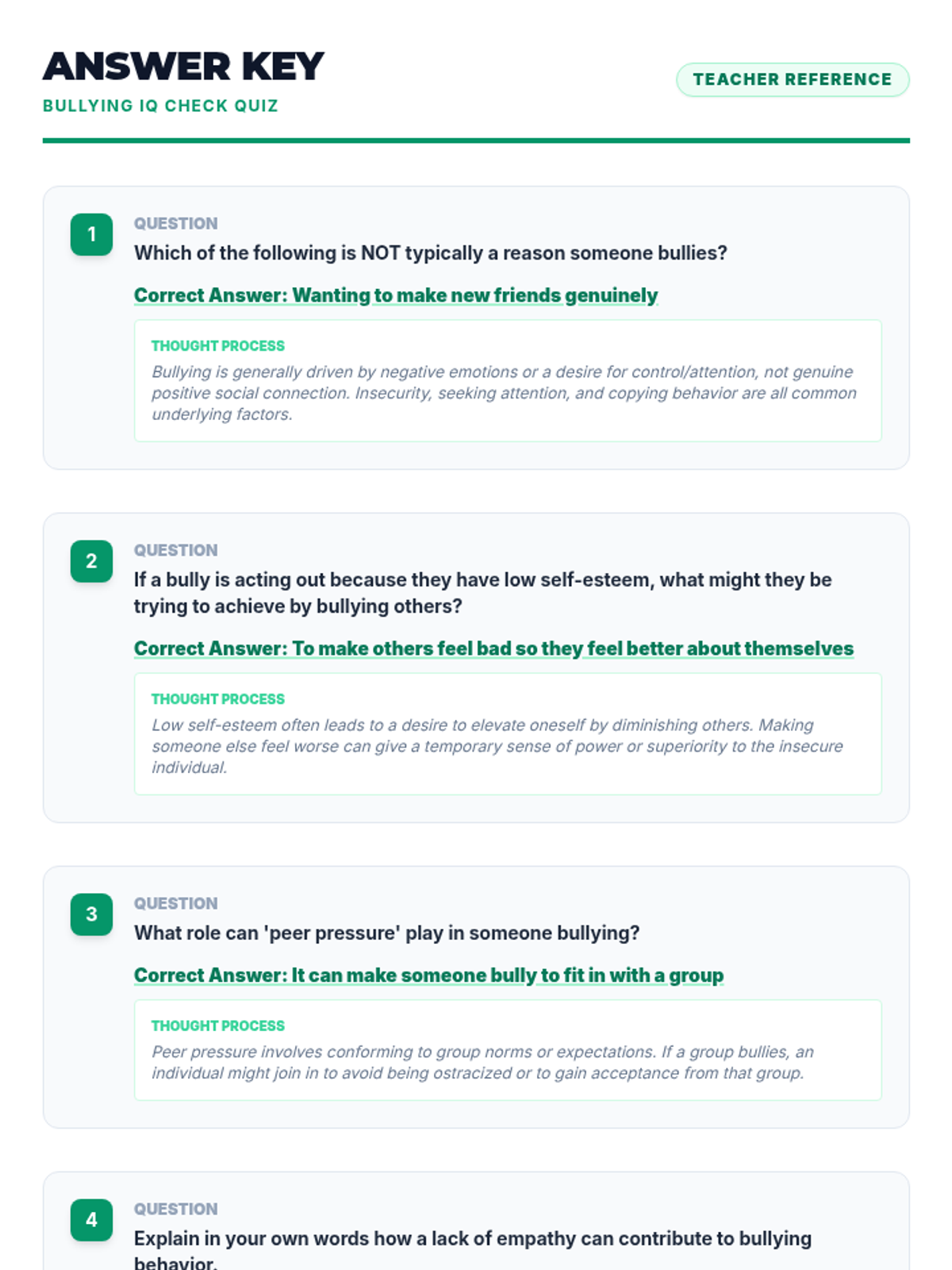 This lesson explores the complex reasons behind bullying behavior, helping middle school students develop empathy and understanding. By examining common triggers and motivations, students will learn to identify bullying dynamics and foster a more inclusive environment.