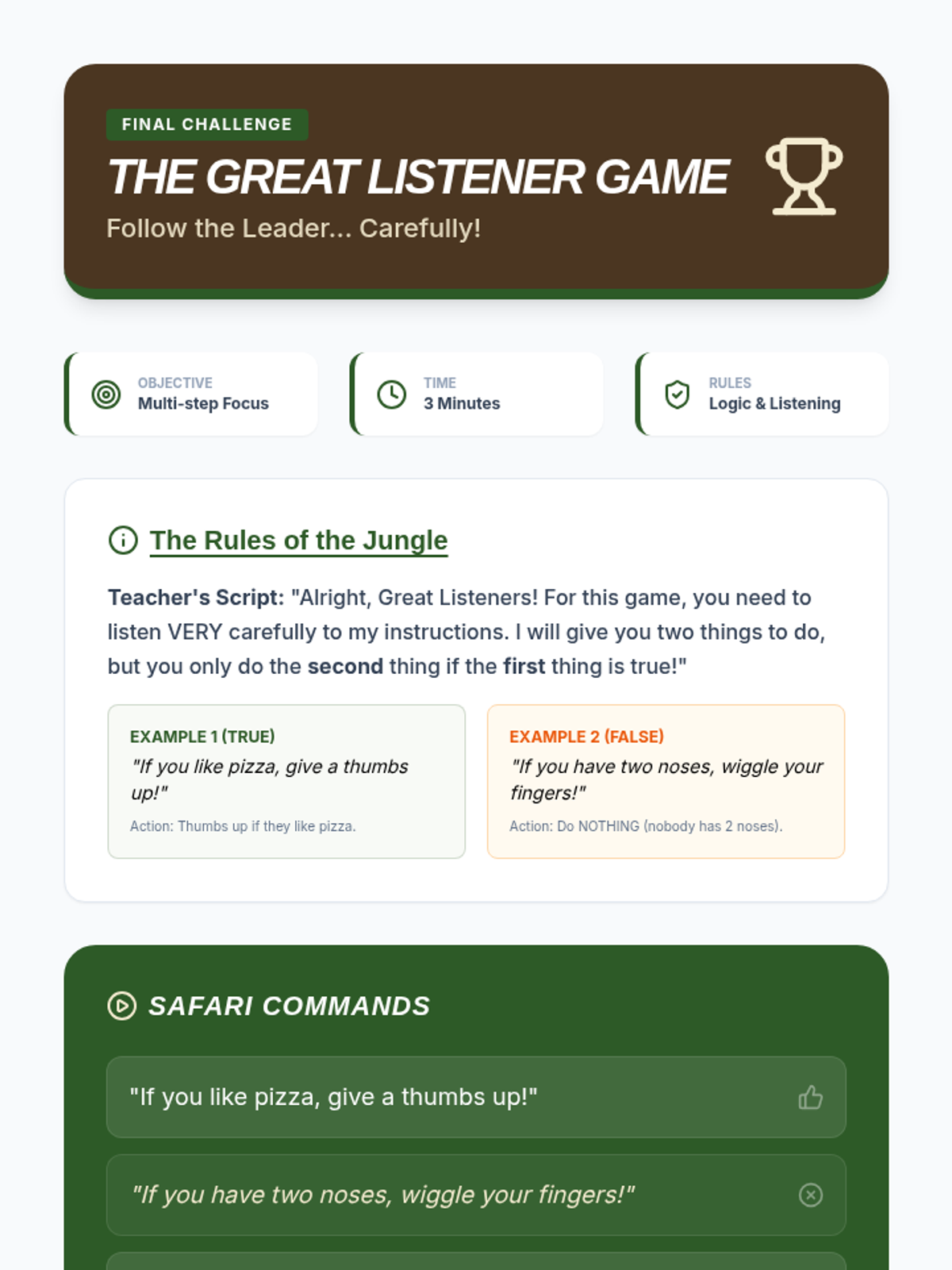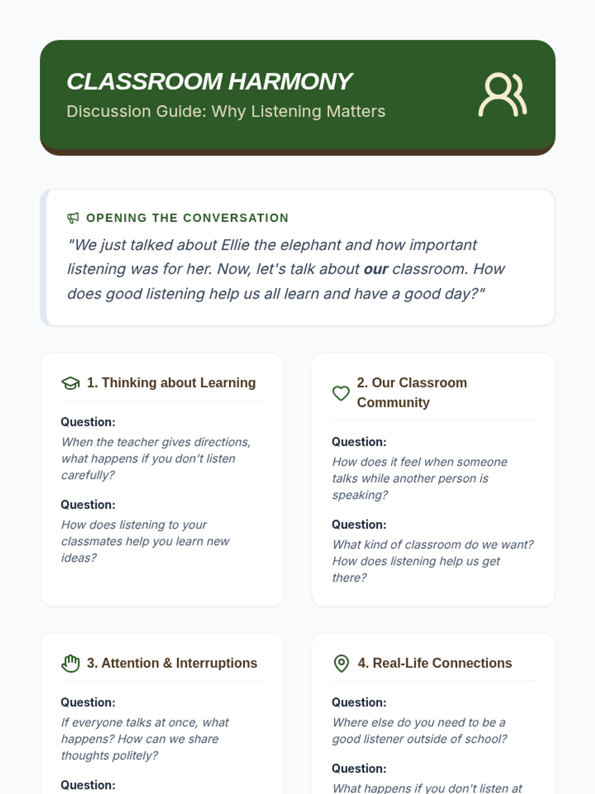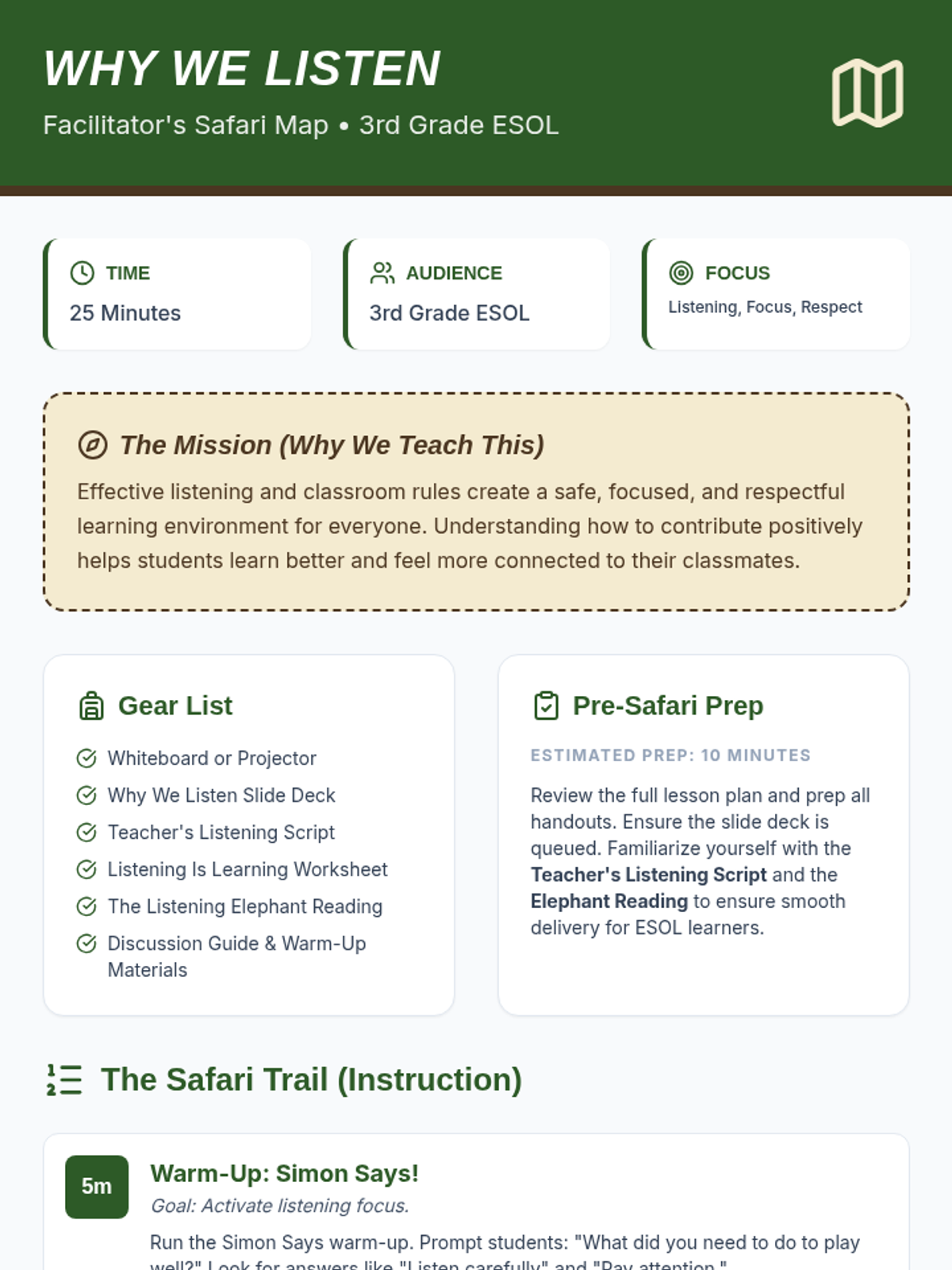 A single-session lesson for 3rd-grade ESOL students that uses interactive games, a story about an elephant, and discussions to teach the importance of active listening and positive classroom behavior.