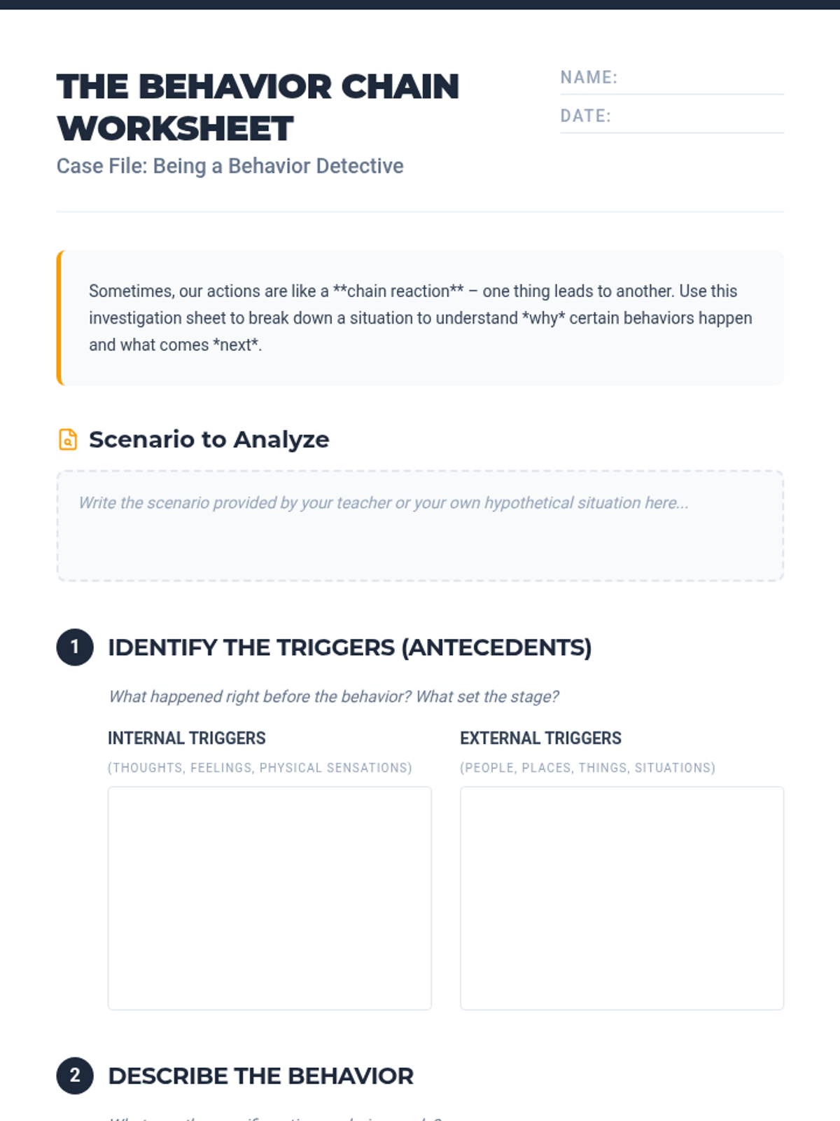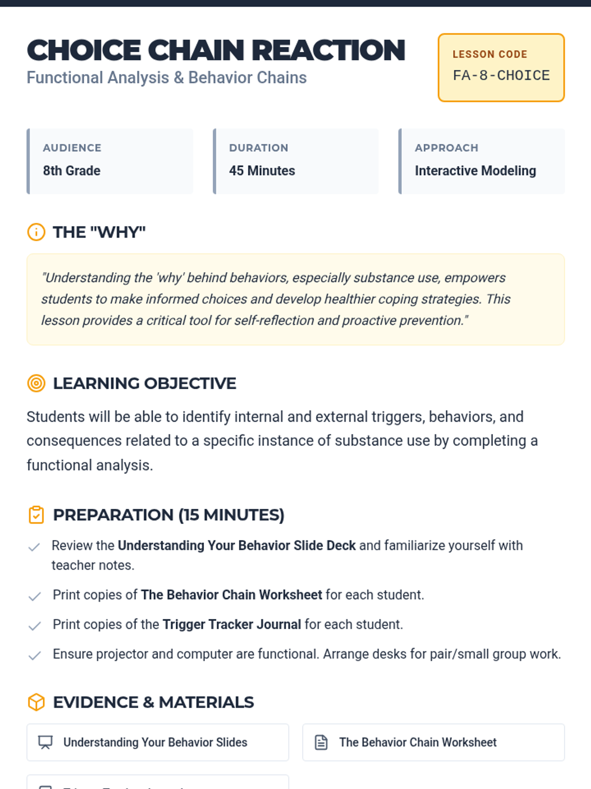 A 45-minute lesson for 8th-grade students teaching them to identify triggers, behaviors, and consequences related to substance use through functional analysis. students learn to break down behavior chains to make healthier choices.