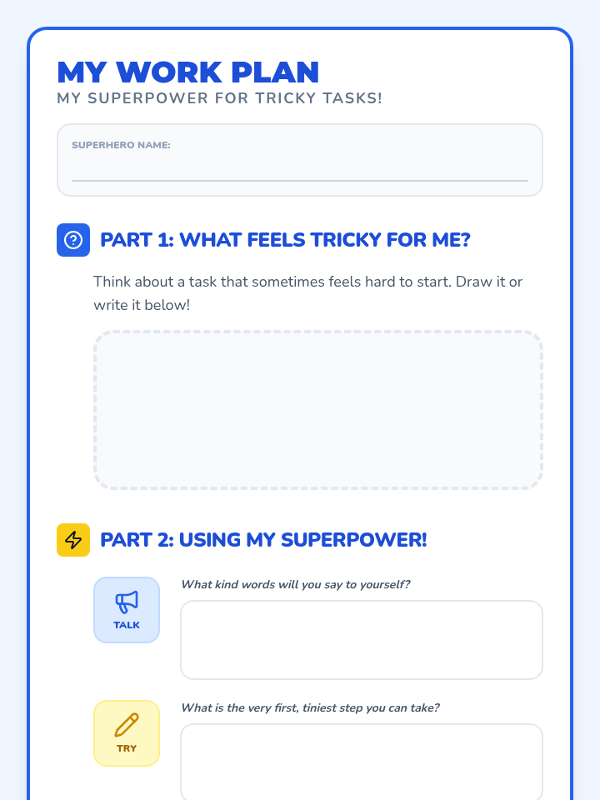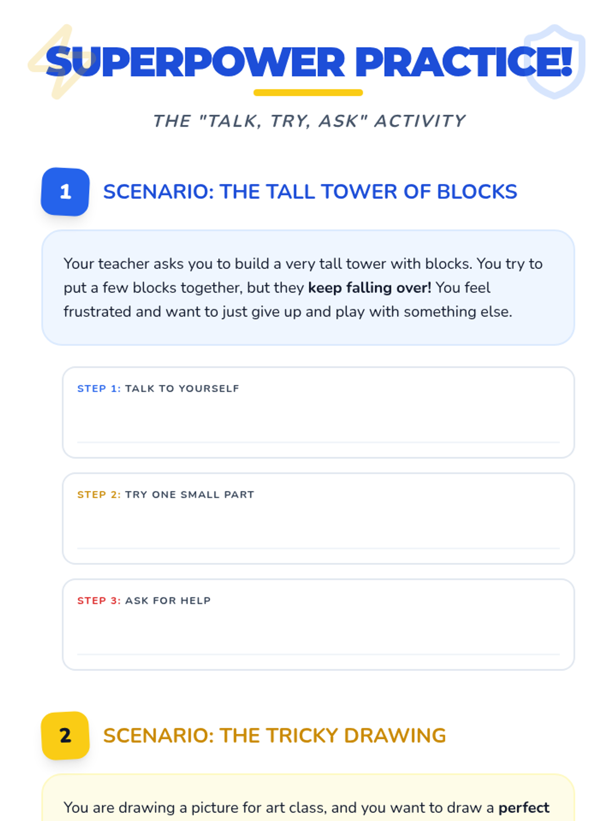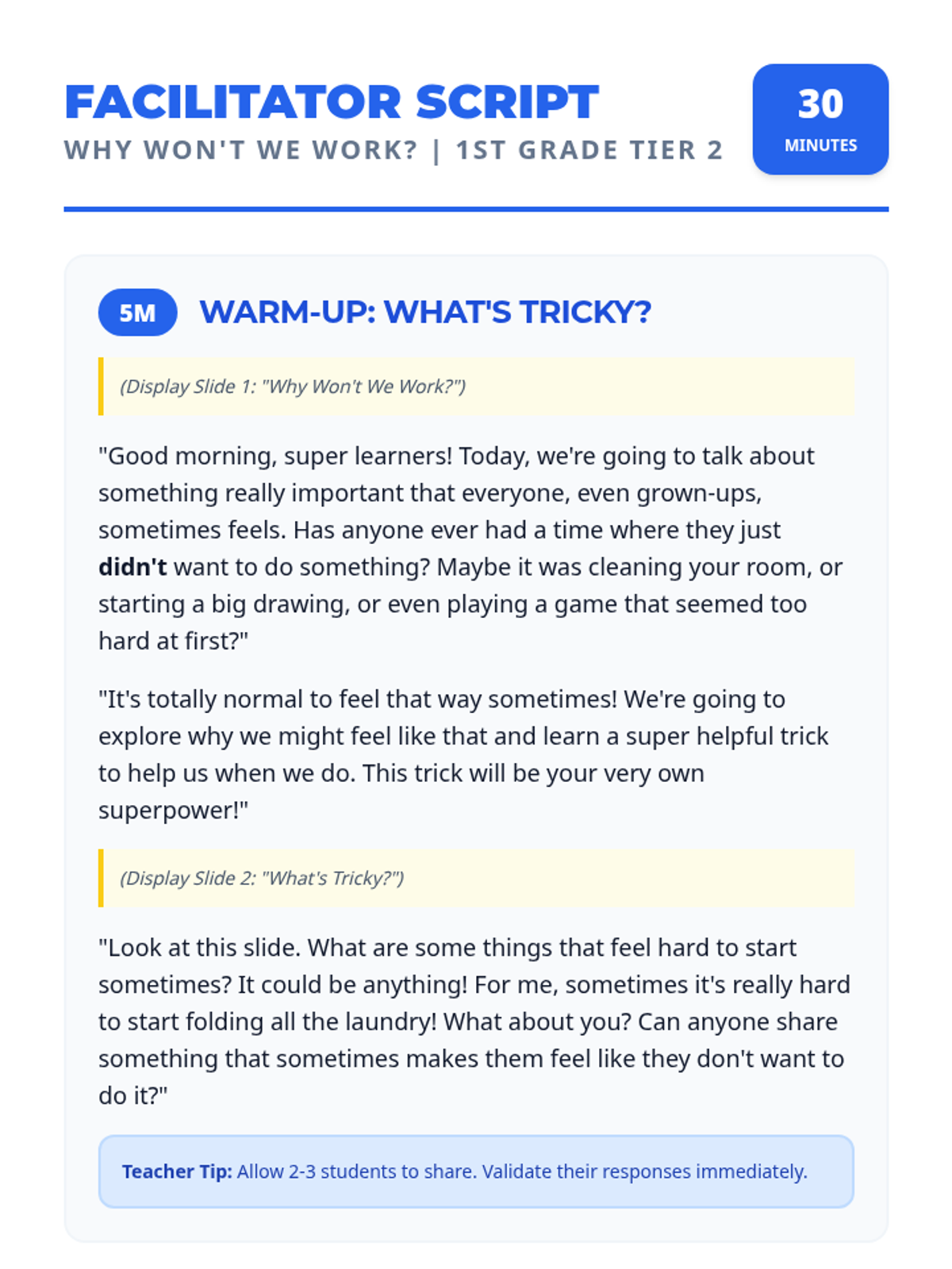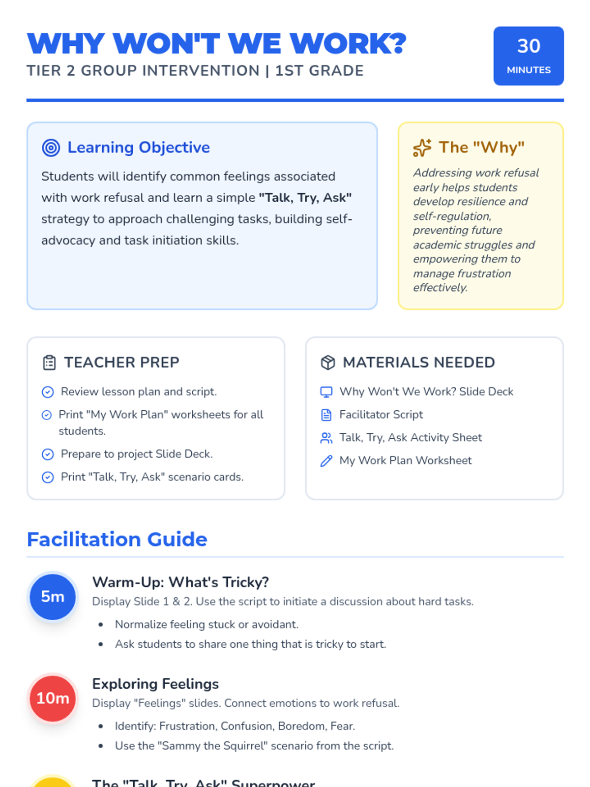 A 30-minute Tier 2 group session for 1st graders to identify feelings behind work refusal and learn the 'Talk, Try, Ask' coping strategy to overcome task-related anxiety and frustration.