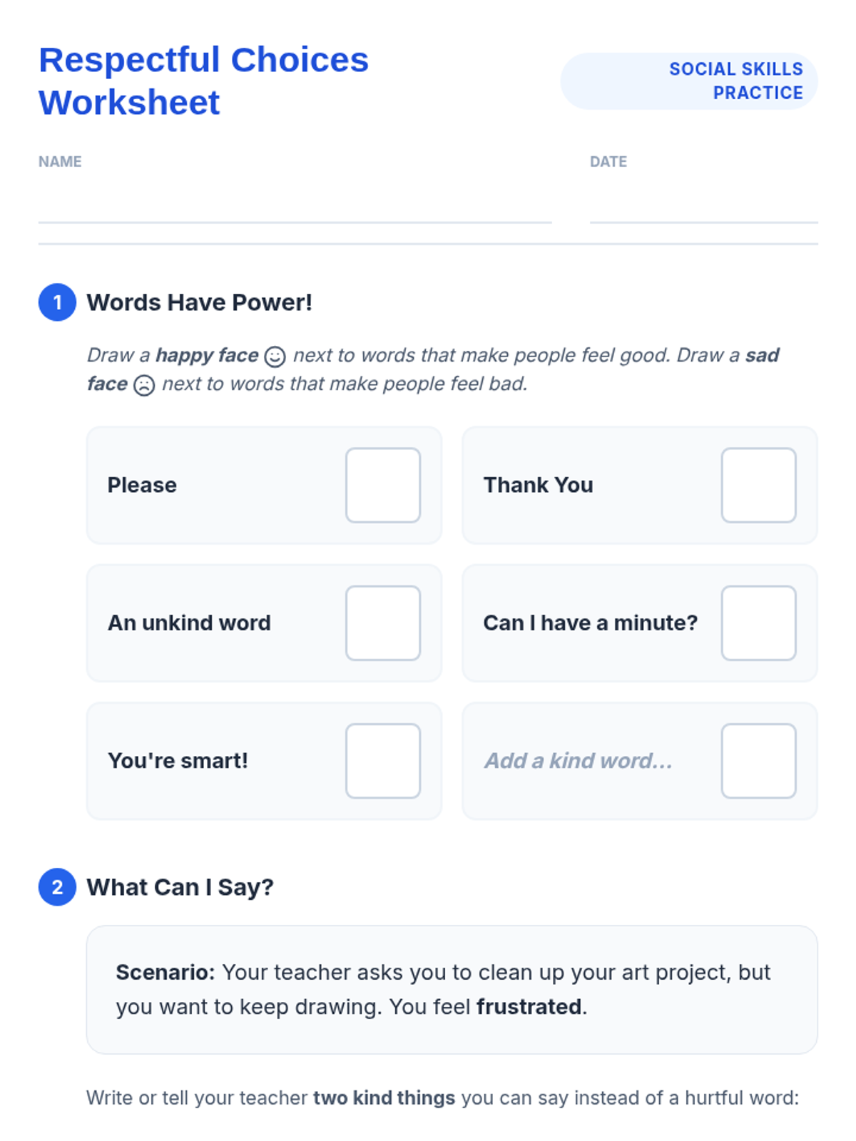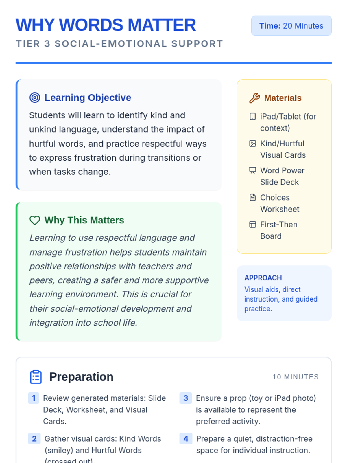 A 20-minute Tier 3 individual lesson designed for a student with autism to understand the impact of language and develop strategies for expressing frustration respectfully during transitions.