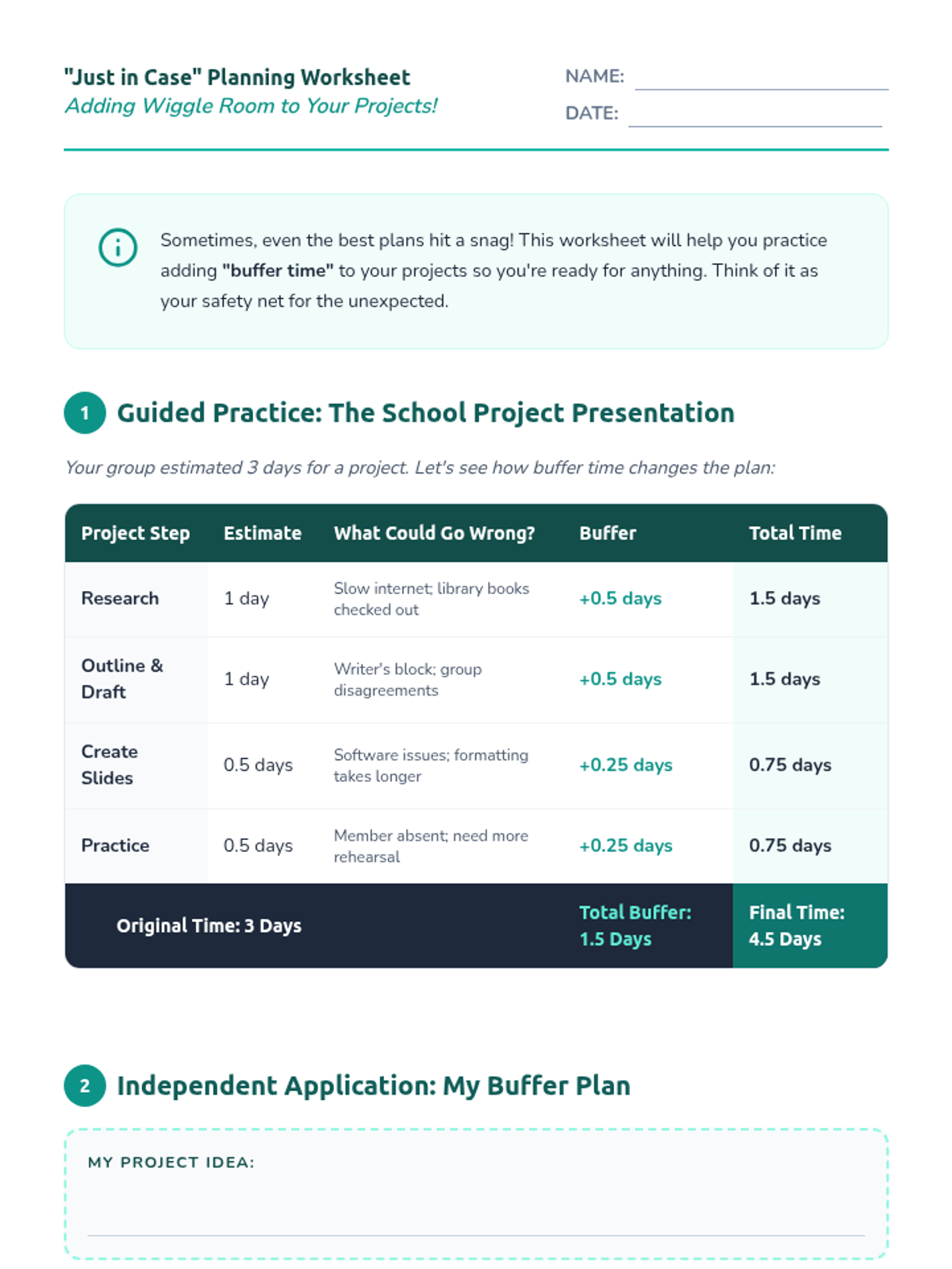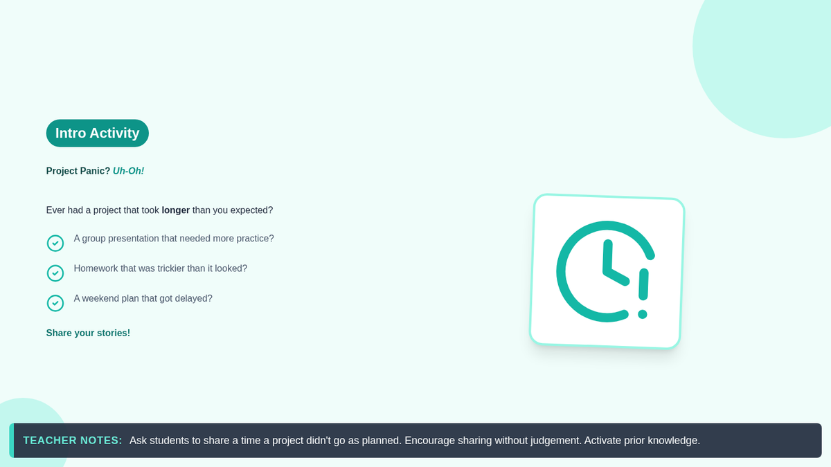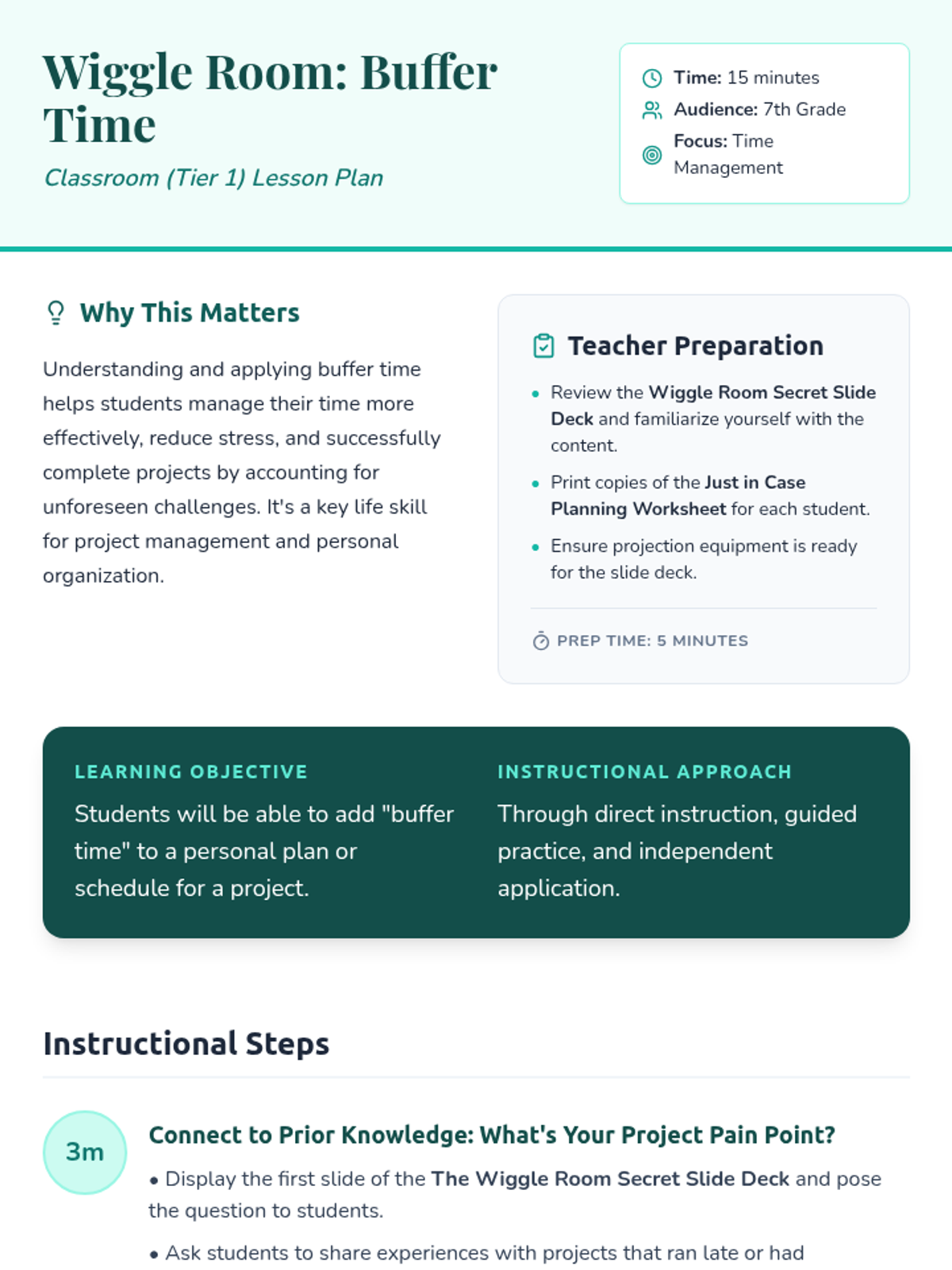 This lesson introduces 7th-grade students to the concept of 'buffer time' in planning and scheduling. It teaches them how to build in extra time to account for unexpected delays, fostering flexibility and reducing stress in their personal projects.