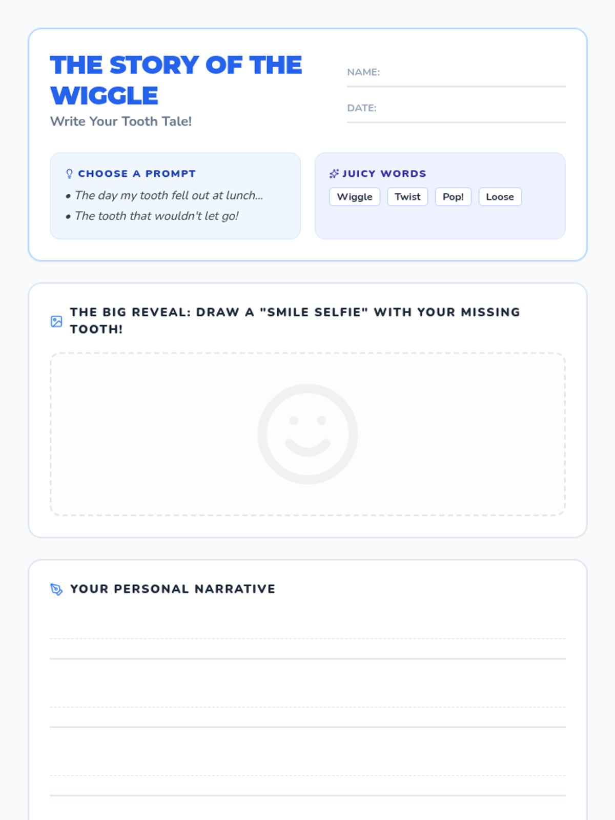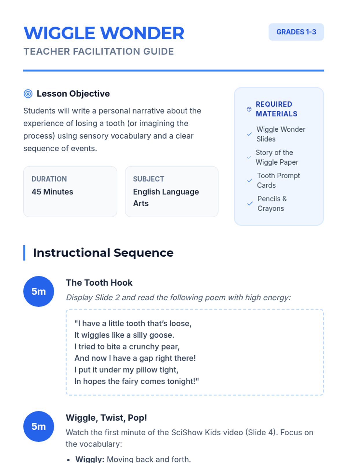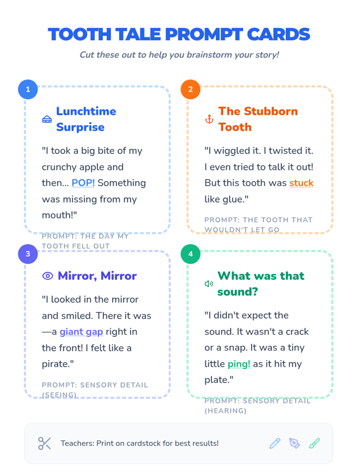 A primary writing lesson where students explore the biological process of losing baby teeth and draft a personal narrative using sensory words like wiggle, twist, and pop.